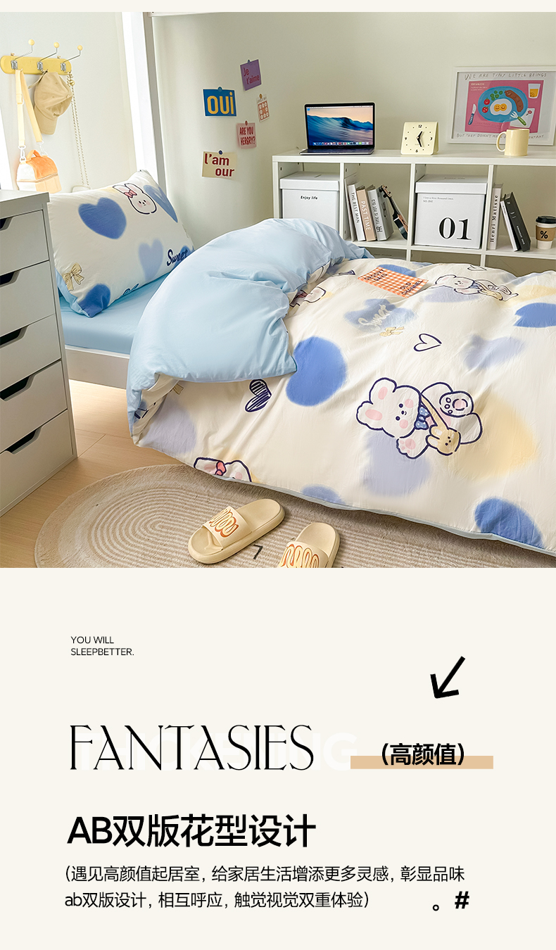 (总)2024新款水洗棉小清新印花学生三件套(床笠床套款),爱心熊,粉郁盛开,花间兔,花语,恐龙乐园,仙草,紫郁盛开