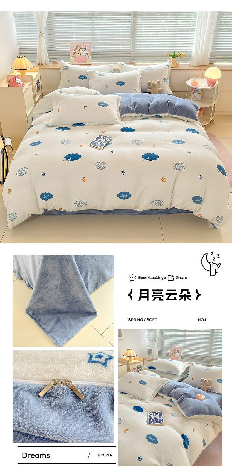 商品名称:2024新款A类AB版加厚保暖双面牛奶绒印花四件套--小清新系列 月亮云朵