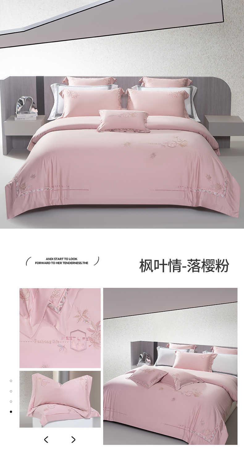 商品名称:2025新款磨毛绣花四件套-枫叶情 枫叶情-落樱粉