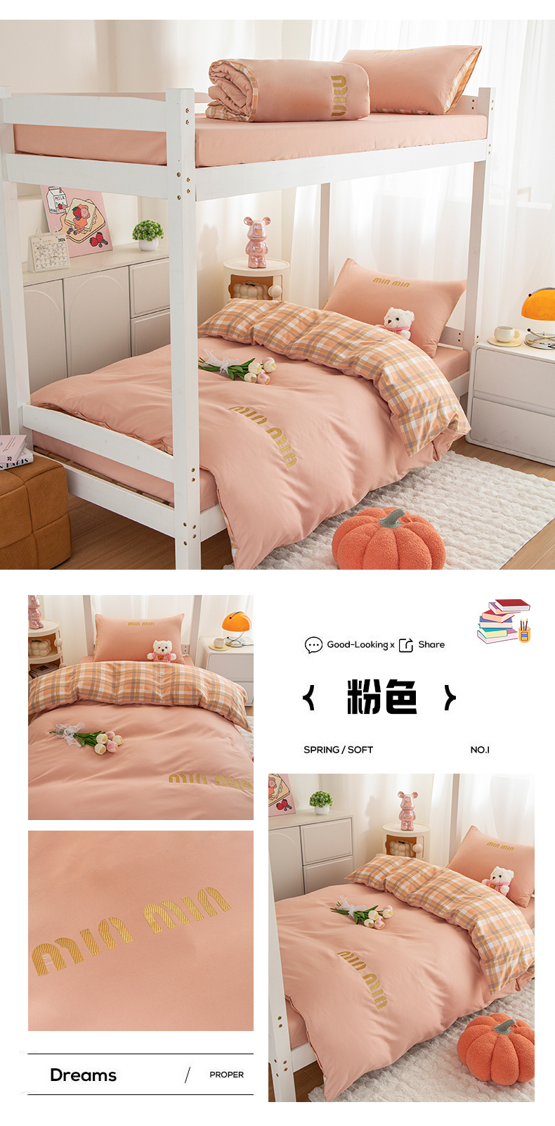 商品名称:富宁家纺 2025新款亲肤磨毛学生三件套学生床场景二-青春格子 粉色