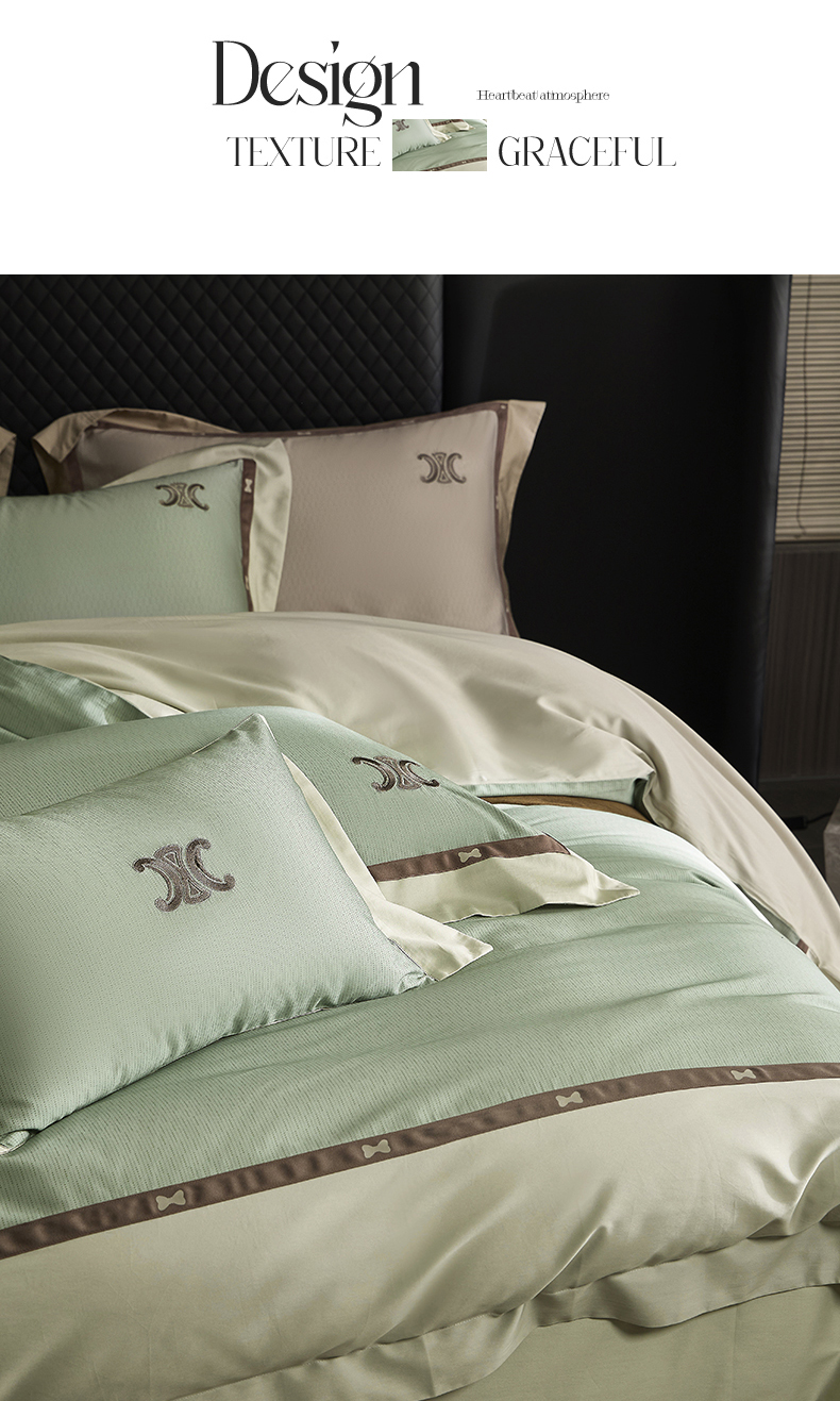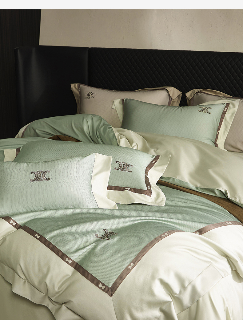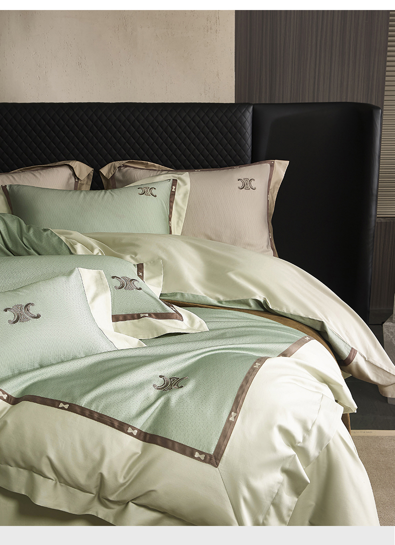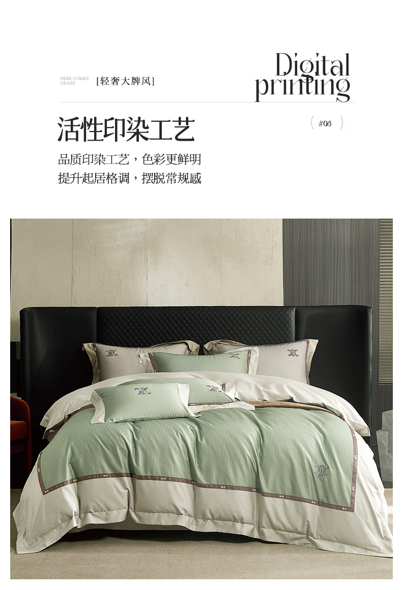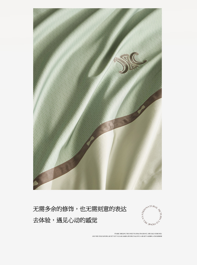 商品名称:名品优仓 2024新款高支高密长绒棉数码印花加织带刺绣拼角款四件套-斯琳娜 斯琳娜-森灰绿