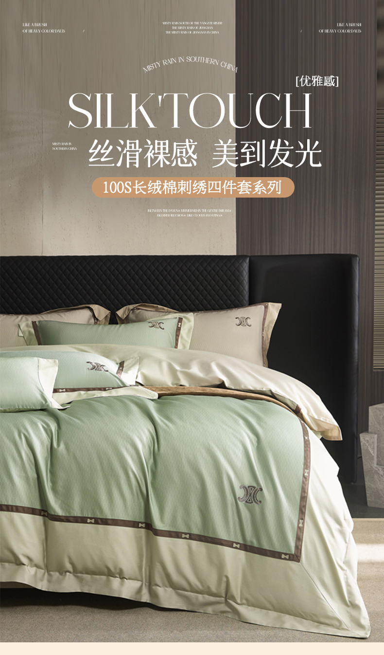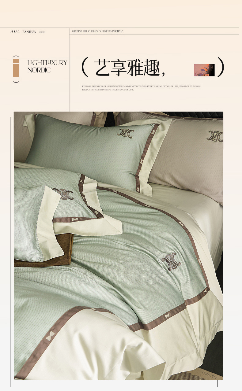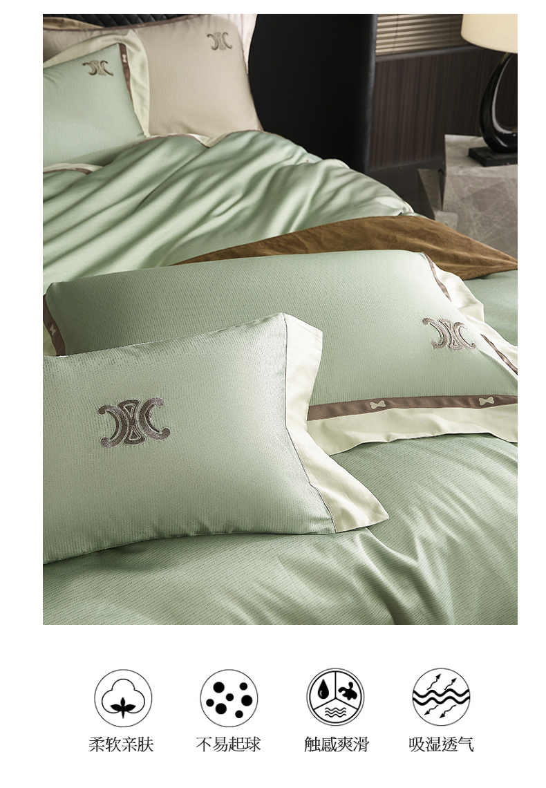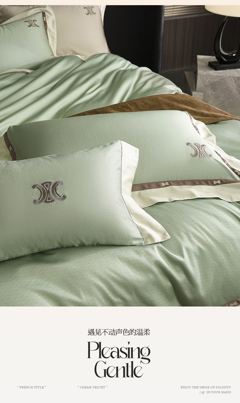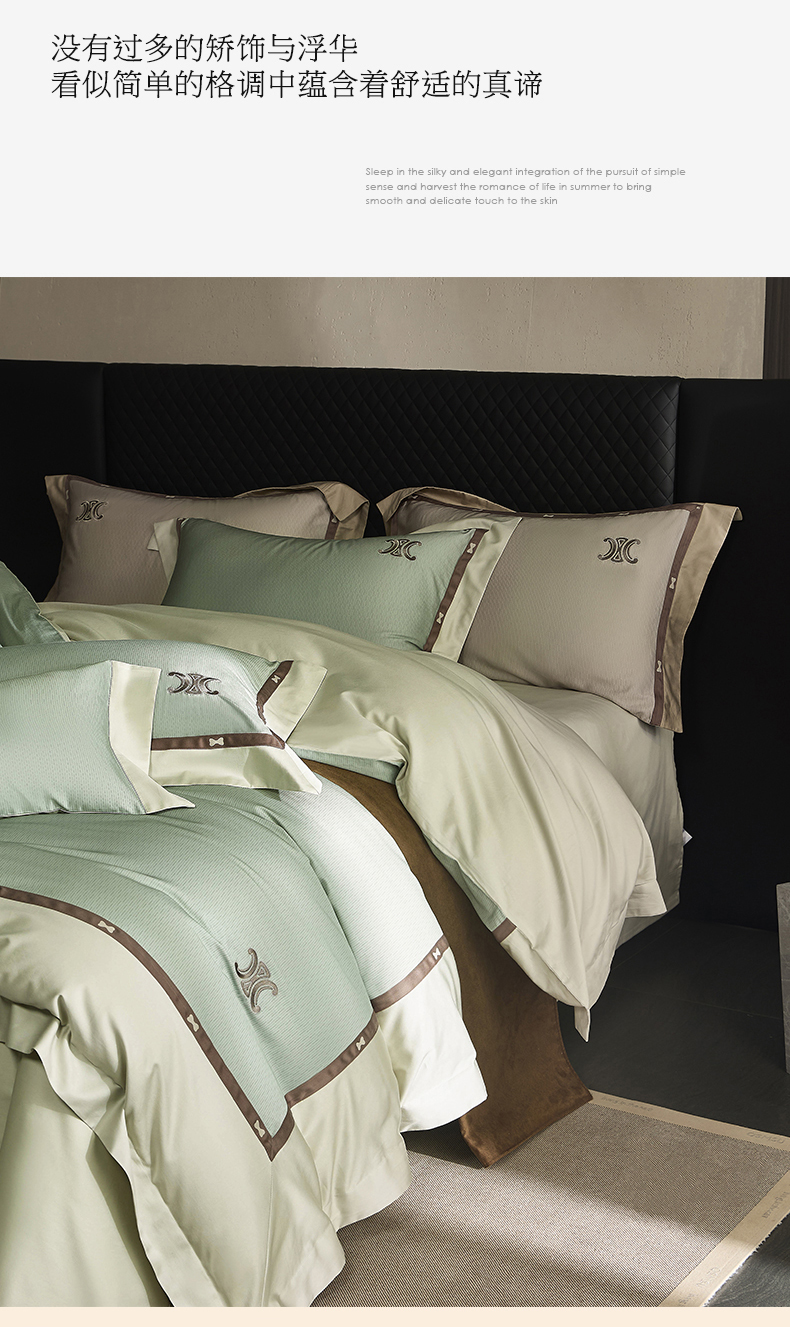 商品名称:名品优仓 2024新款高支高密长绒棉数码印花加织带刺绣拼角款四件套-斯琳娜 斯琳娜-森灰绿