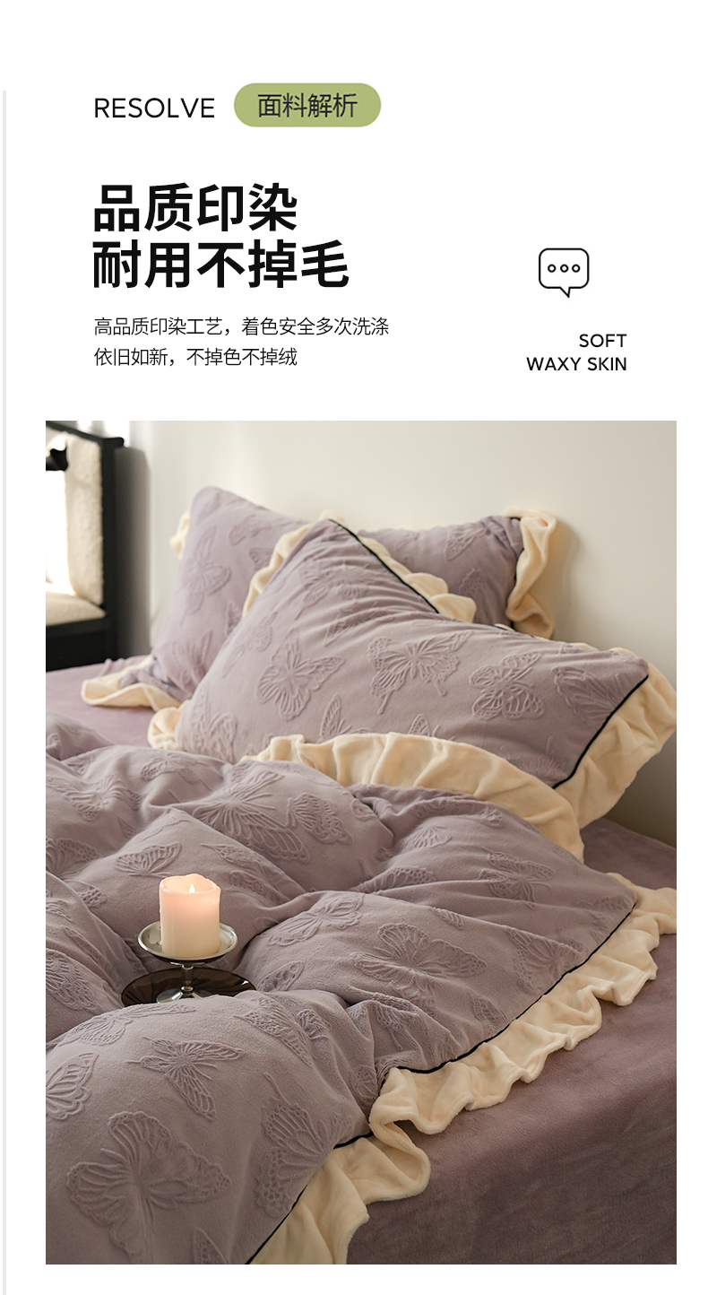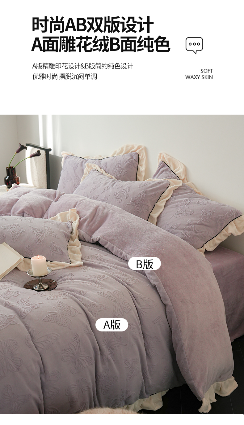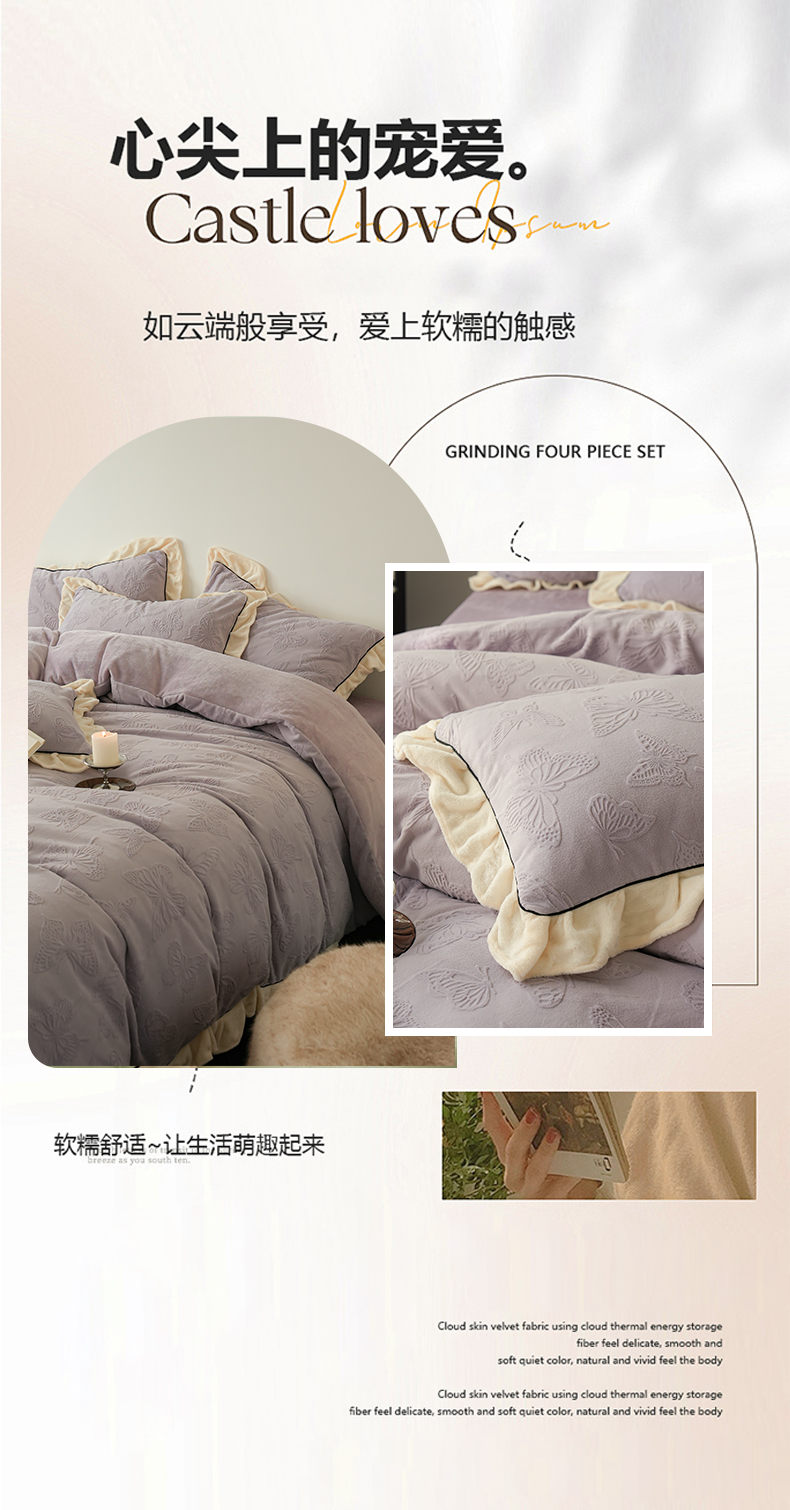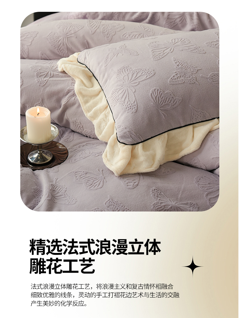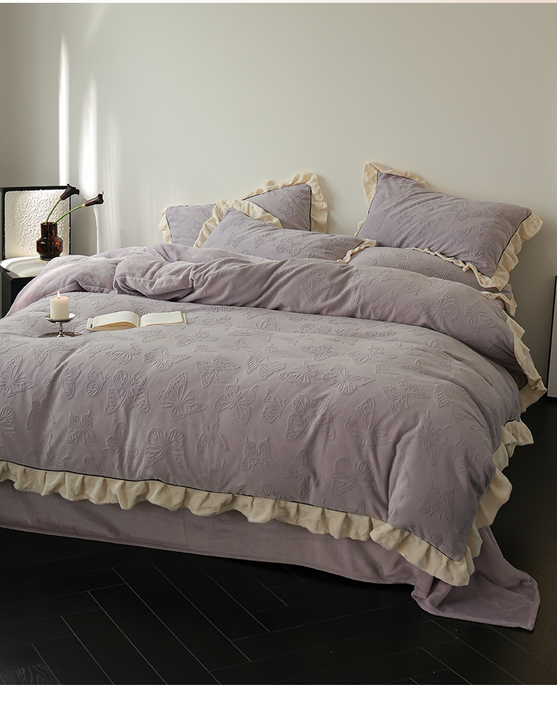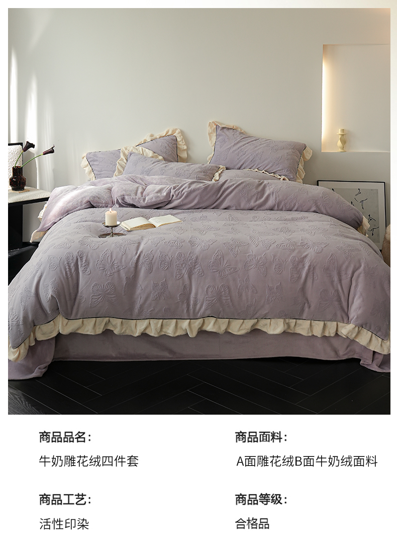 商品名称:萝莉家纺 2024新款加厚牛奶绒提花浪漫雕花绒四件套 蝴蝶飞飞香芋紫