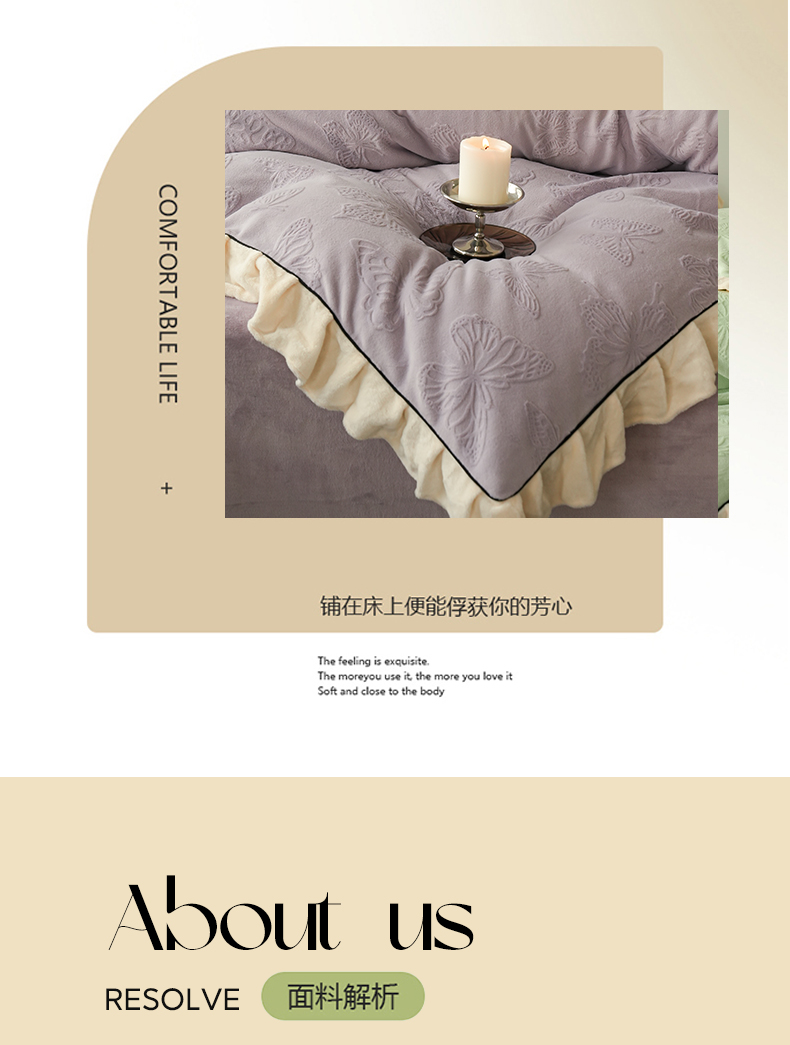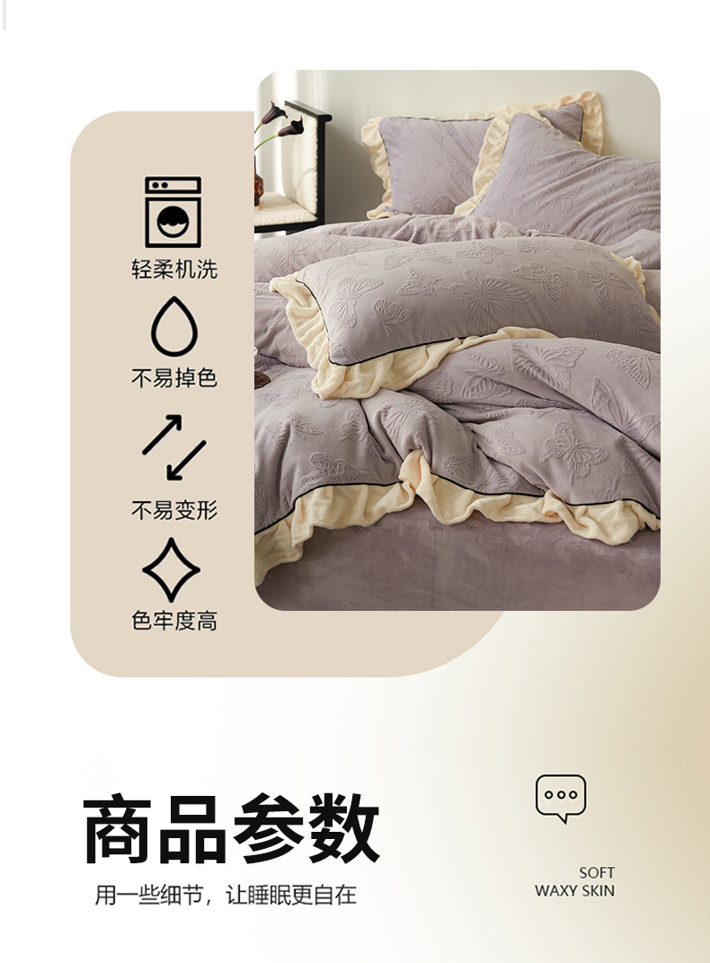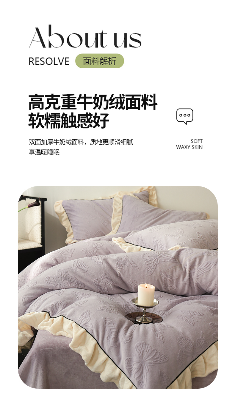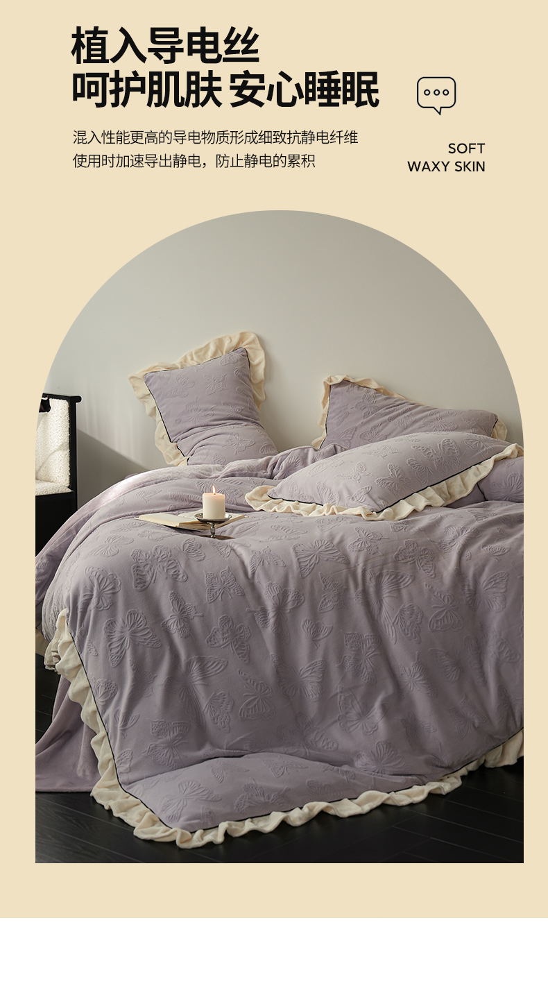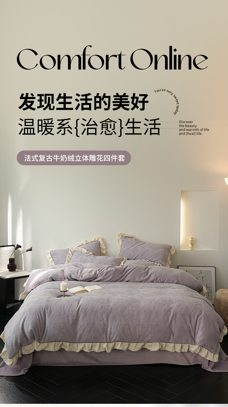 商品名称:萝莉家纺 2024新款加厚牛奶绒提花浪漫雕花绒四件套 蝴蝶飞飞香芋紫