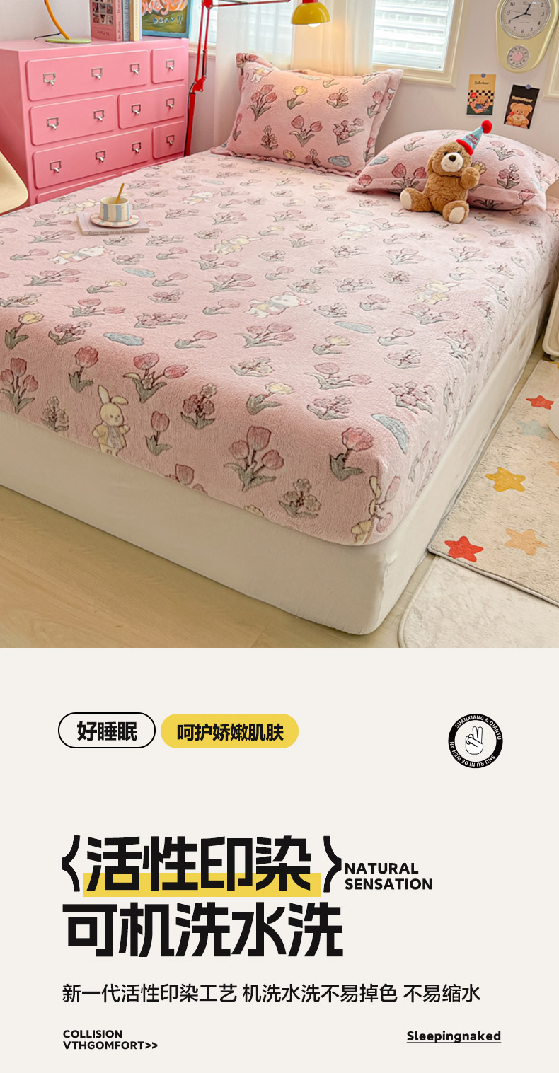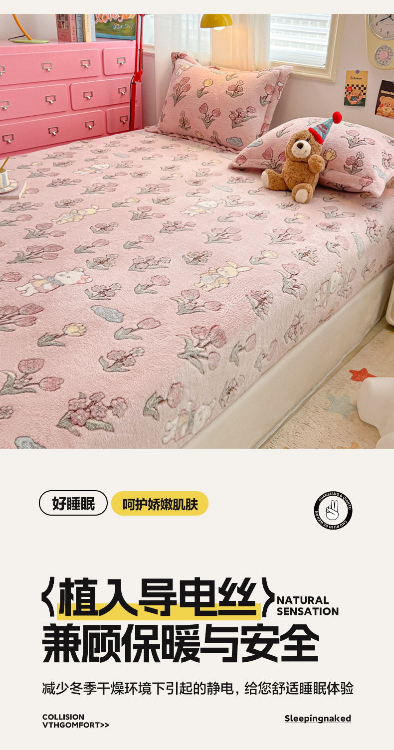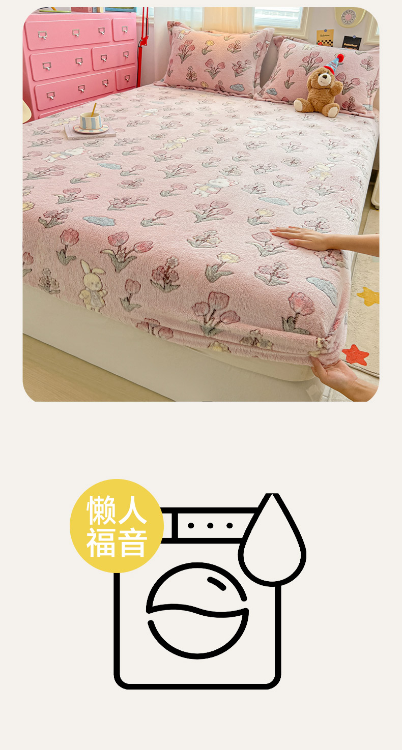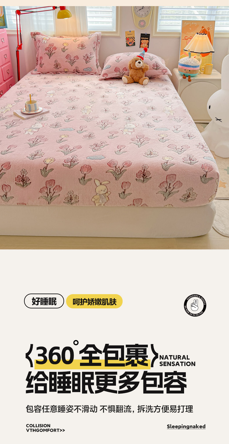 • 91家纺网 家纺一手货源 找家纺 韩巢家纺 2024新款加厚雪花绒卡通印花保暖床笠三件套 花园熊(粉)