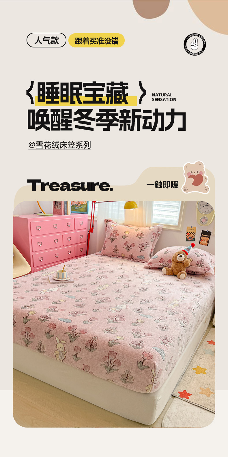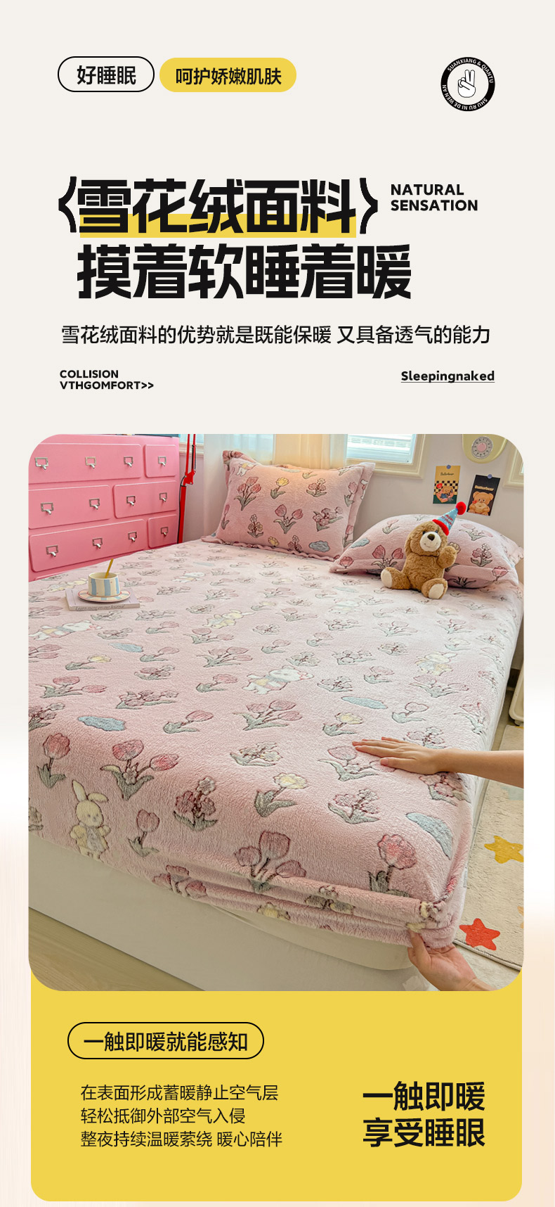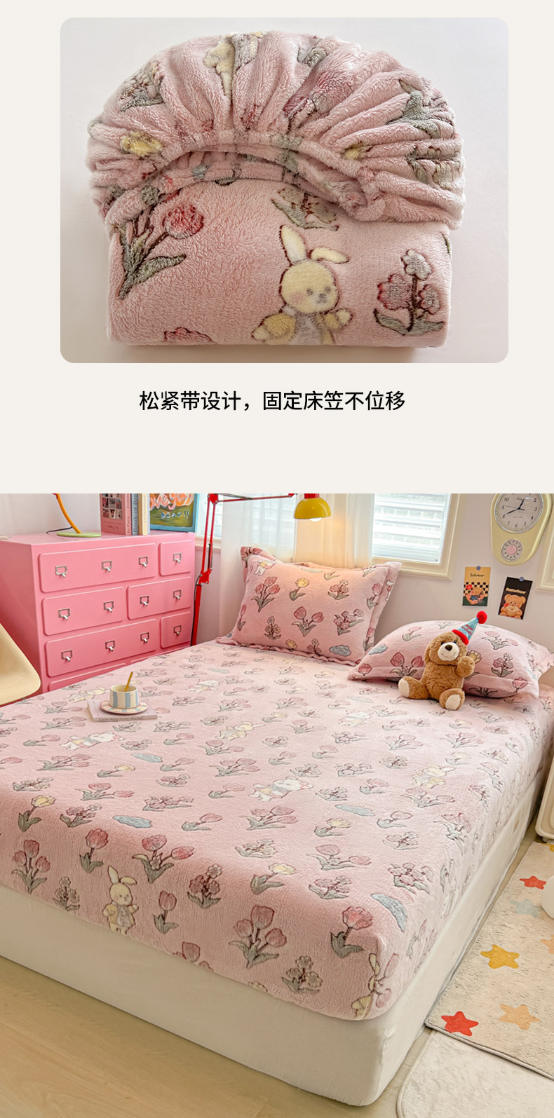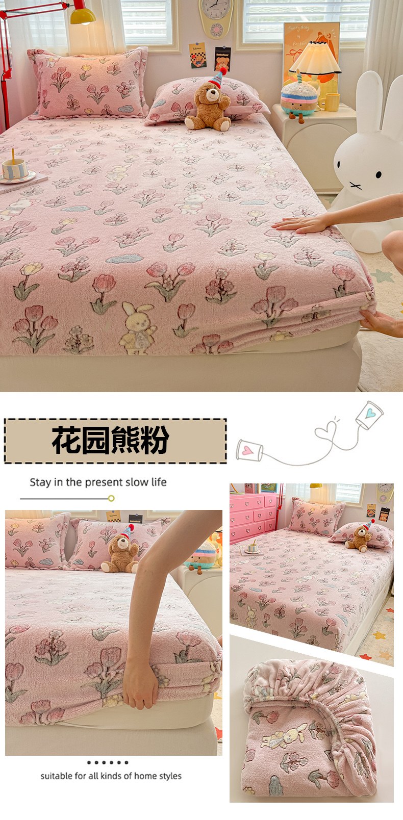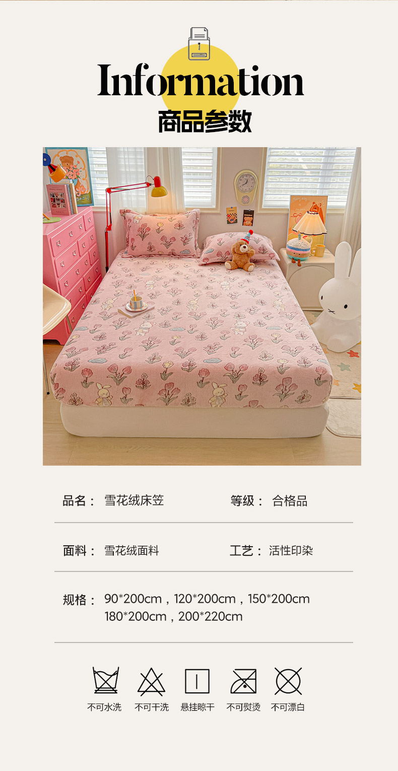 • 91家纺网 家纺一手货源 找家纺 韩巢家纺 2024新款加厚雪花绒卡通印花保暖床笠三件套 花园熊(粉)