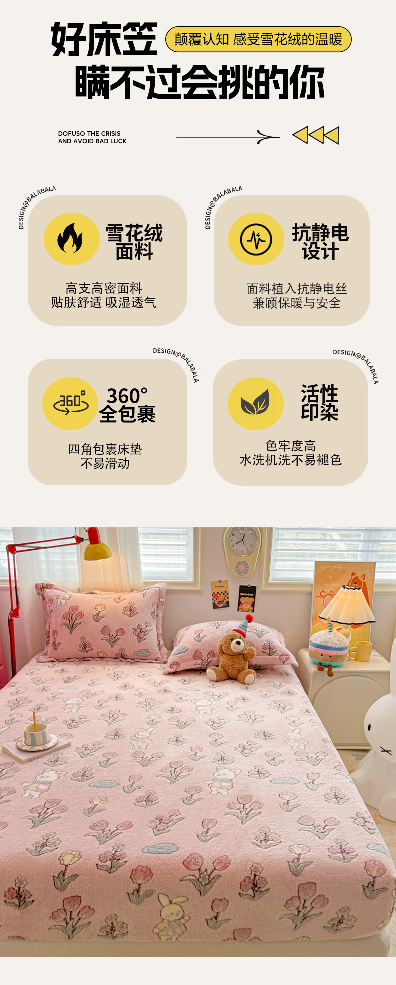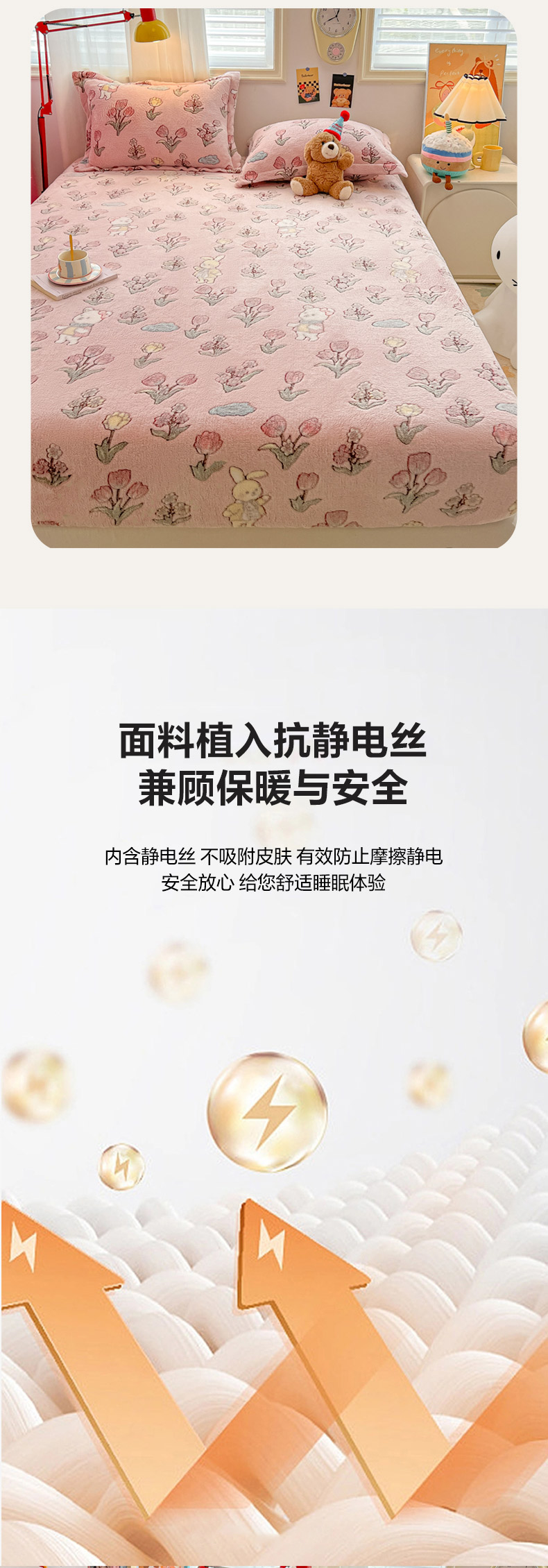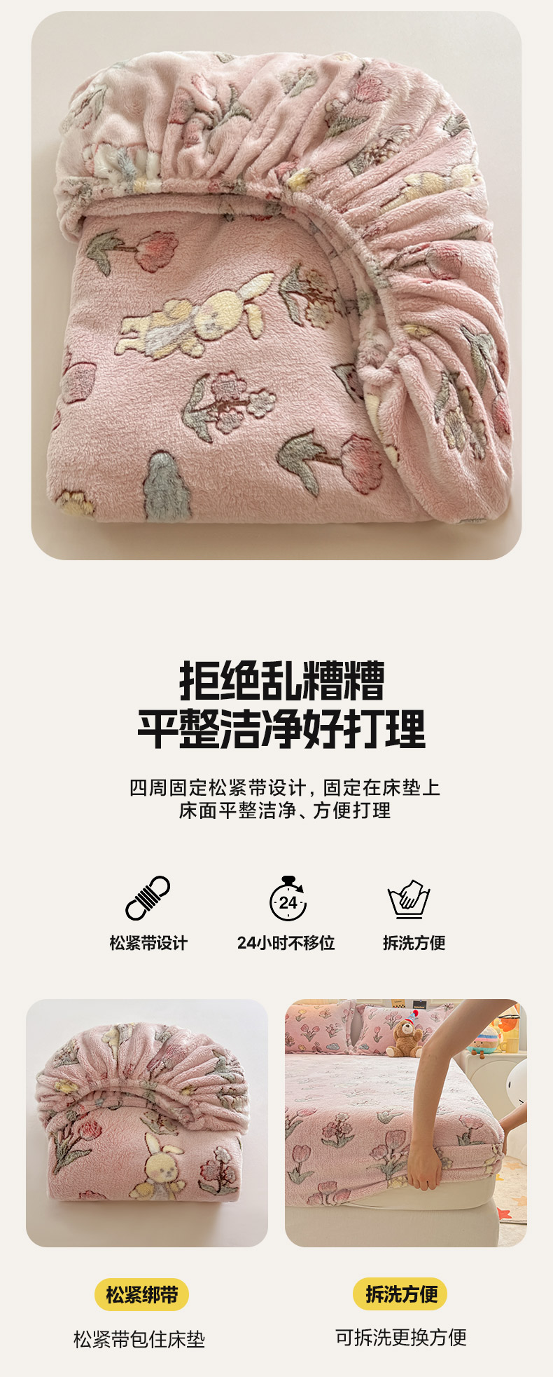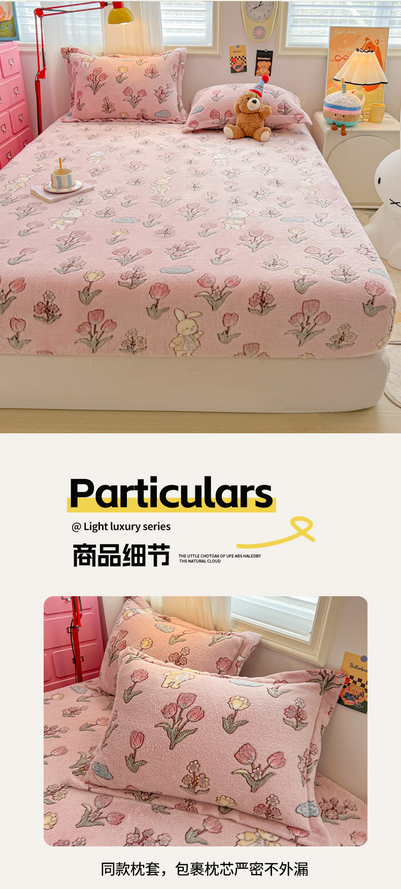 • 91家纺网 家纺一手货源 找家纺 韩巢家纺 2024新款加厚雪花绒卡通印花保暖床笠三件套 花园熊(粉)