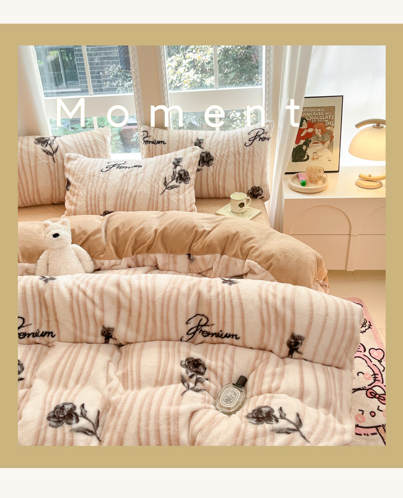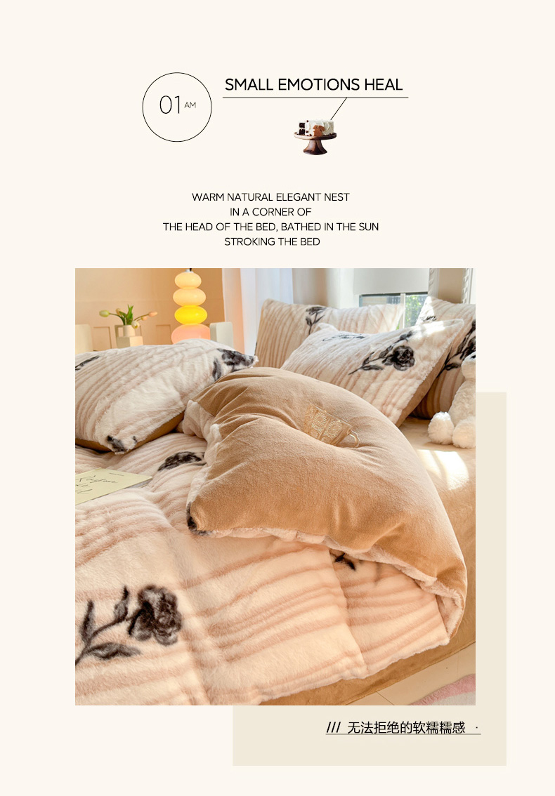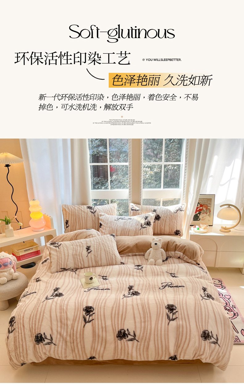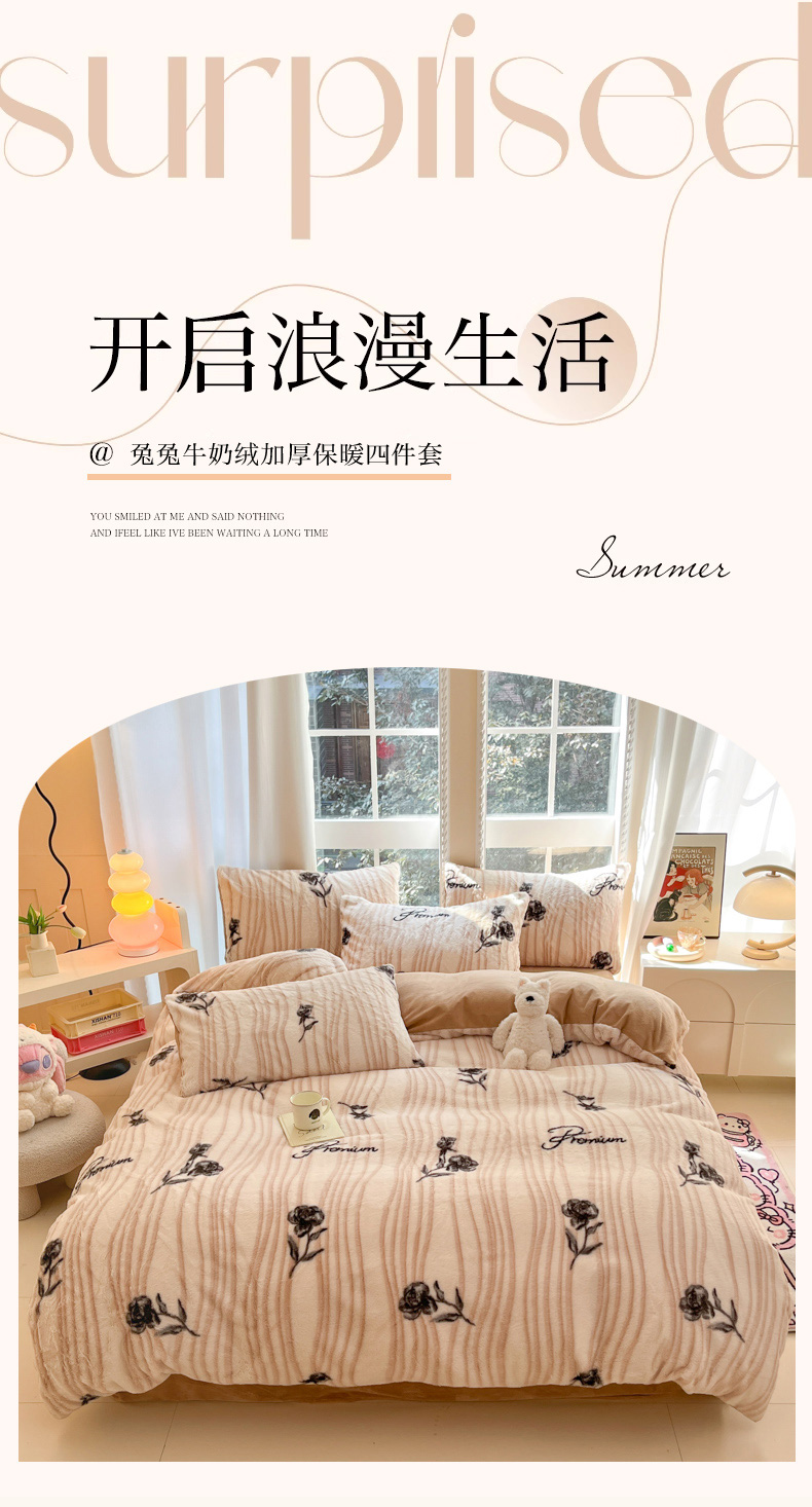 慕澄家纺 2024新款兔绒牛奶绒加厚保暖印花四件套 线条玫瑰