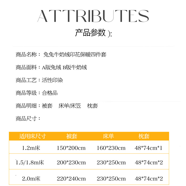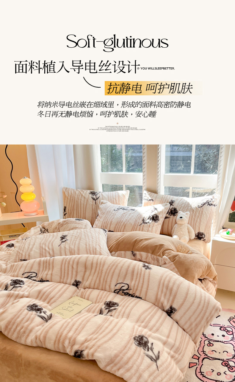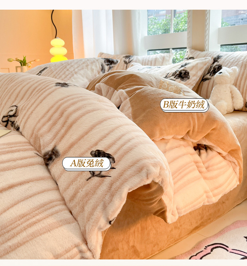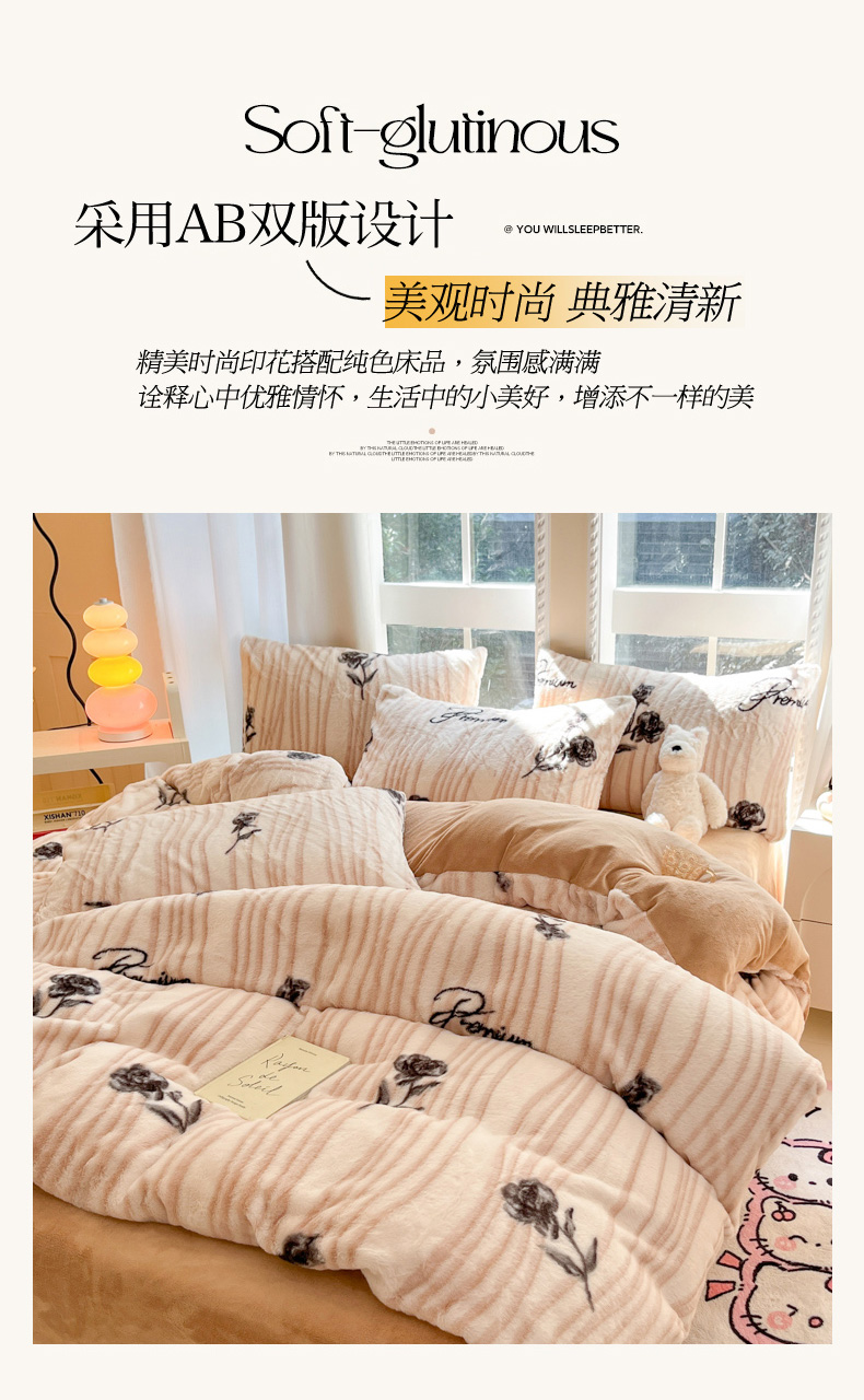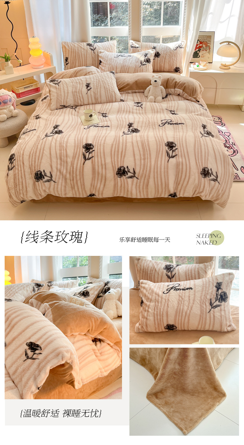商品名称:慕澄家纺 2024新款兔绒牛奶绒加厚保暖印花四件套 线条玫瑰