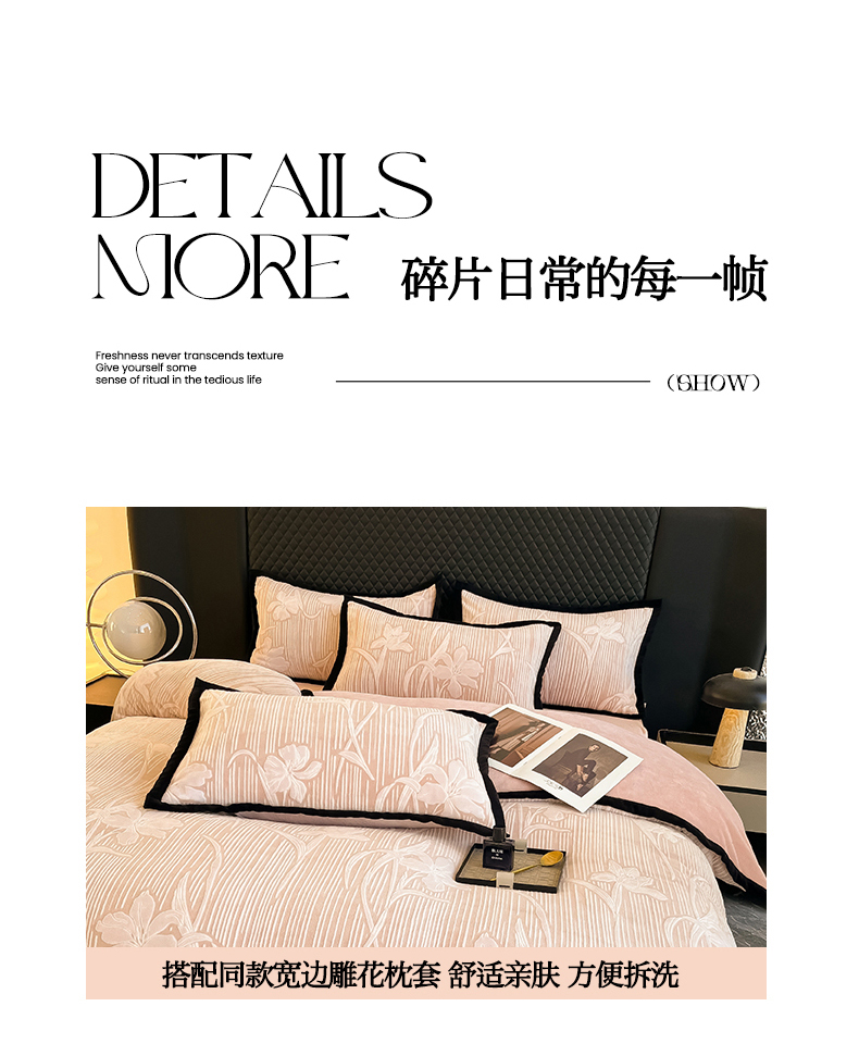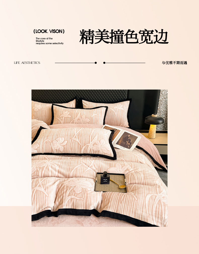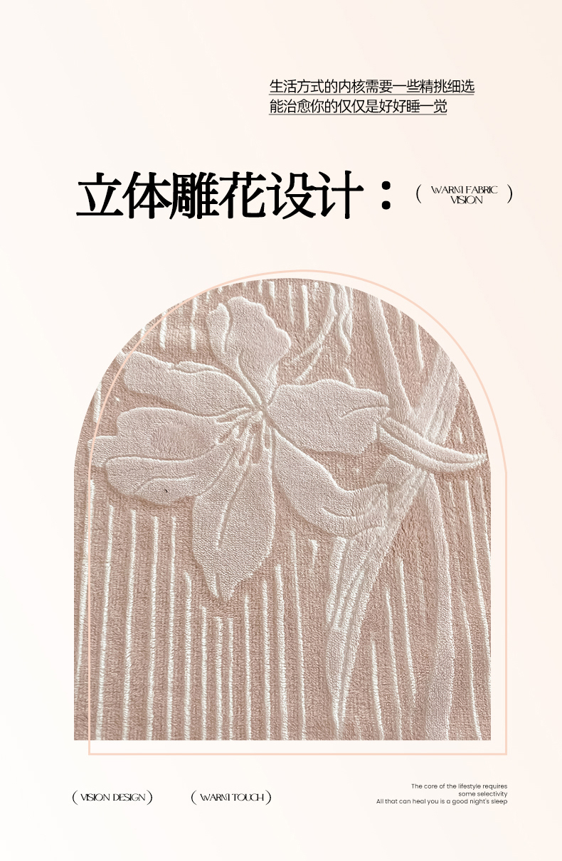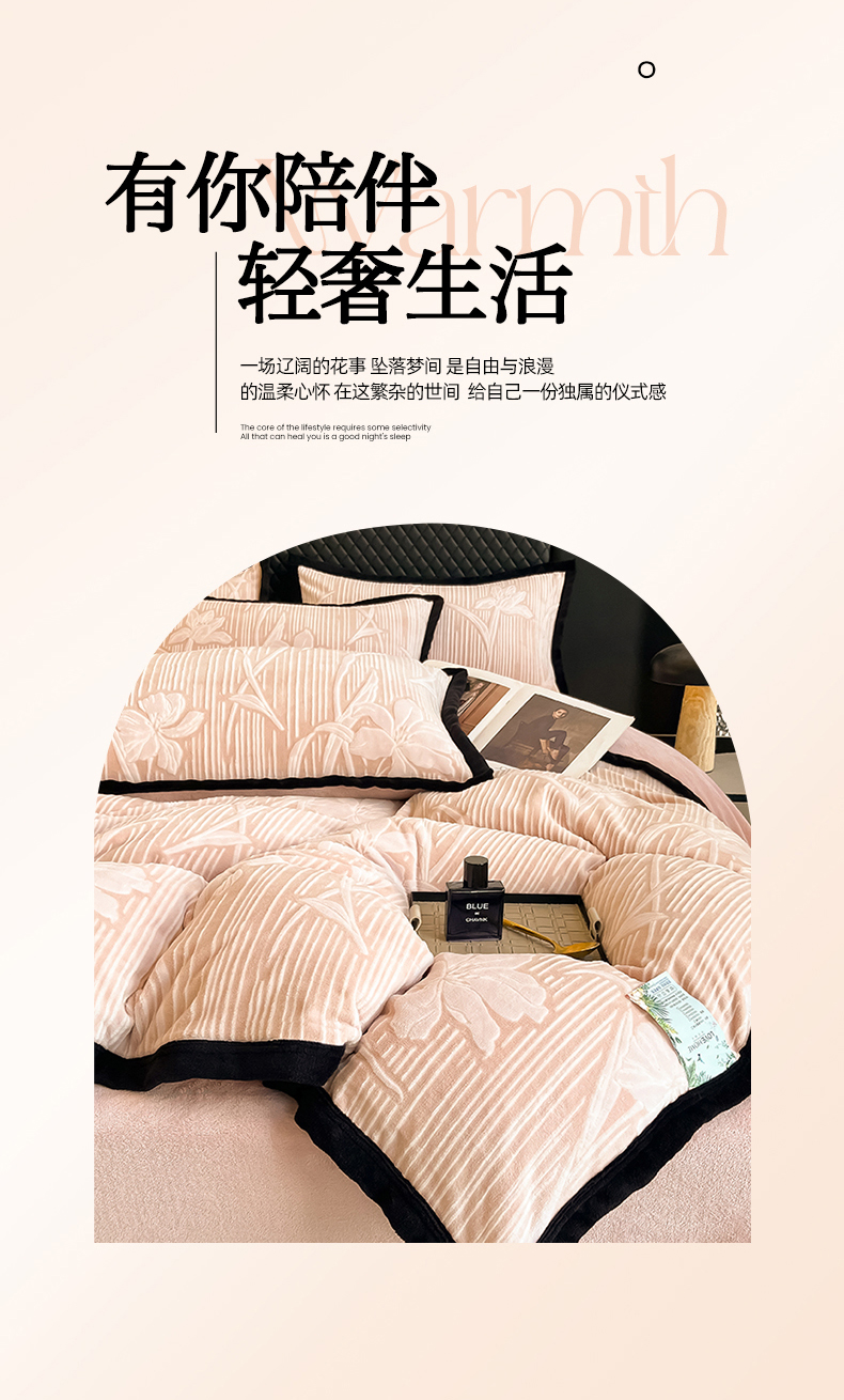 商品名称:多乐家纺 2024新款高克重加厚保暖立体雕花牛奶绒宽包边被套 蔓朵-玉