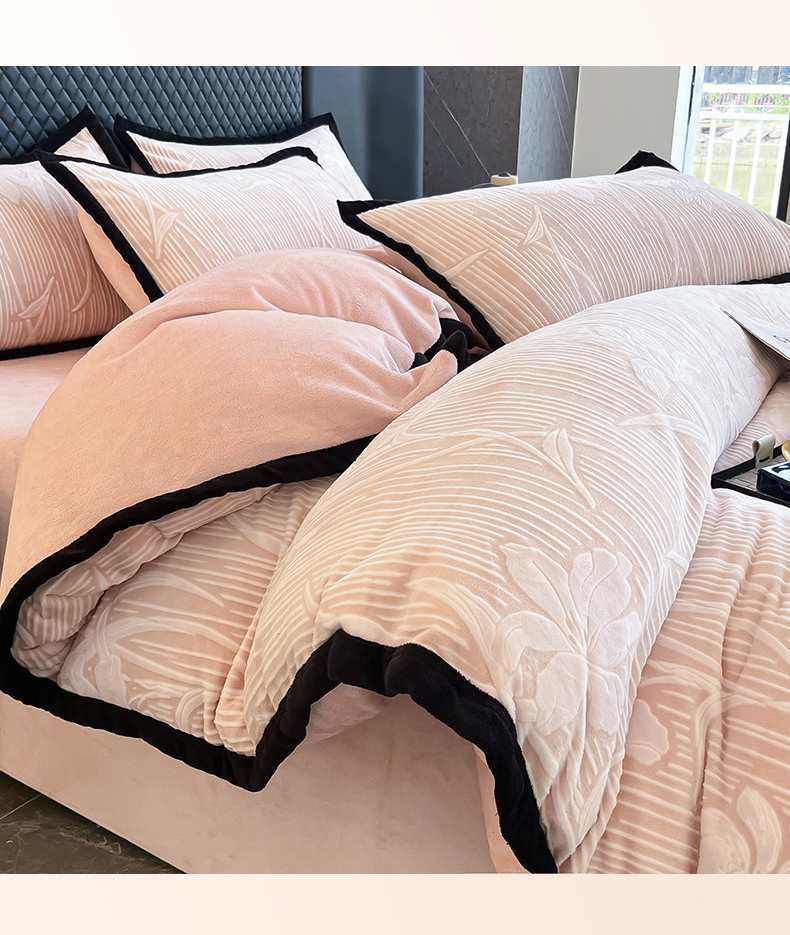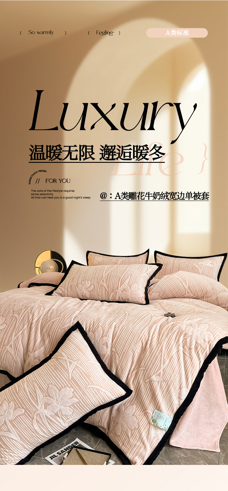 多乐家纺 2024新款高克重加厚保暖立体雕花牛奶绒宽包边被套 蔓朵-玉