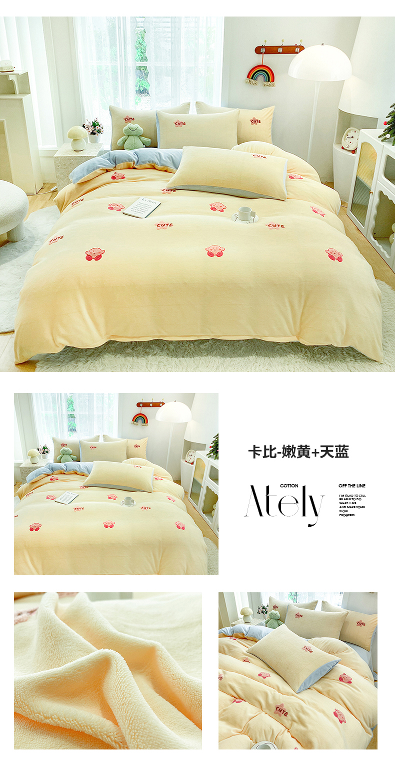 当前位置: 91家纺网 > 商品网购 > 床品套件 > 四件套 > 牛奶绒四件套 > 眷恋家纺 2025新款牛奶绒毛巾绣四件套 卡比-嫩黄+天蓝