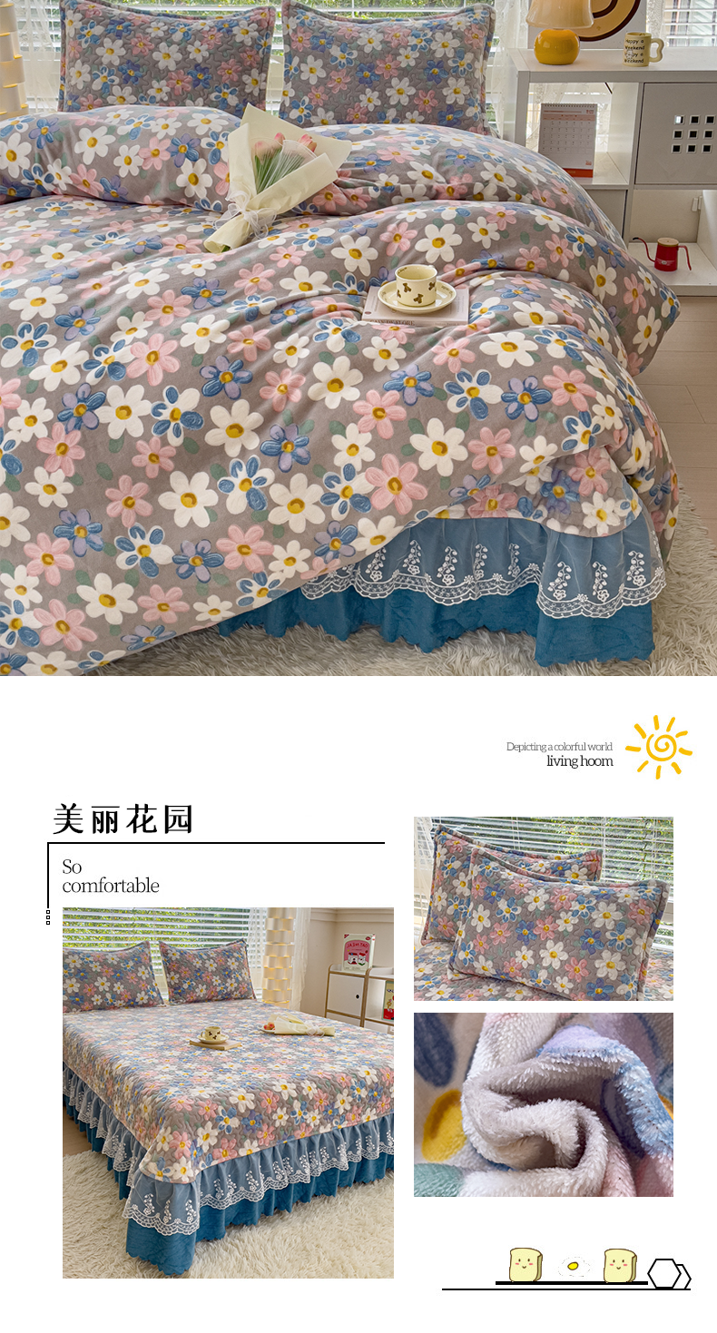 • 91家纺网 家纺一手货源 找家纺 雅眠居2024新款直播爆款牛奶绒印花床盖四件套双层蕾丝花边床裙单件三件套 美丽花园