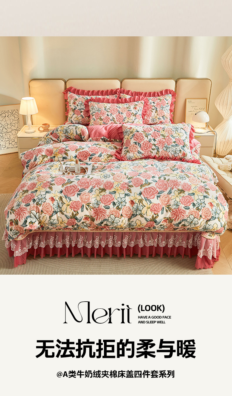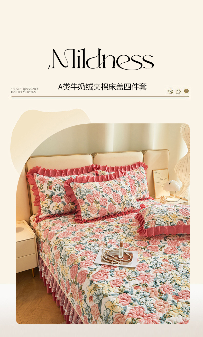 艾裙海 2025新款高克重加厚保暖A类牛奶绒夹棉床盖系列四件套 爱的花海