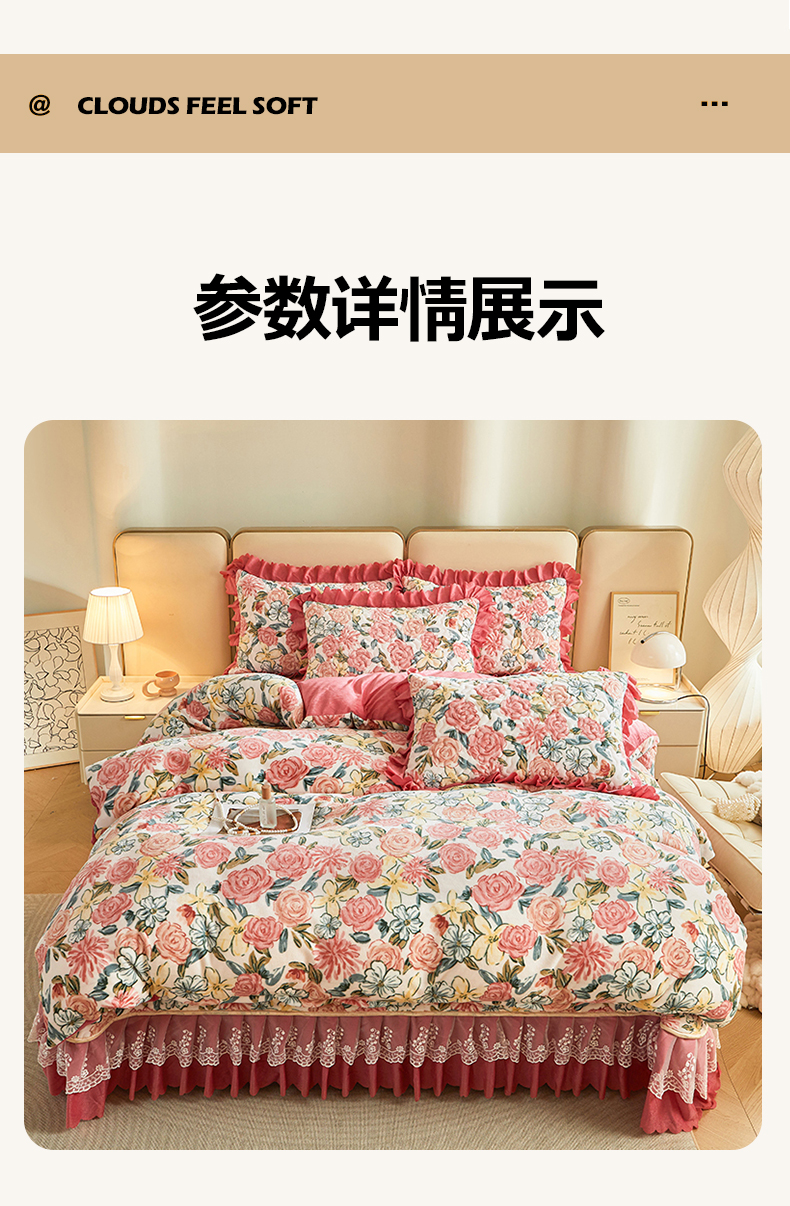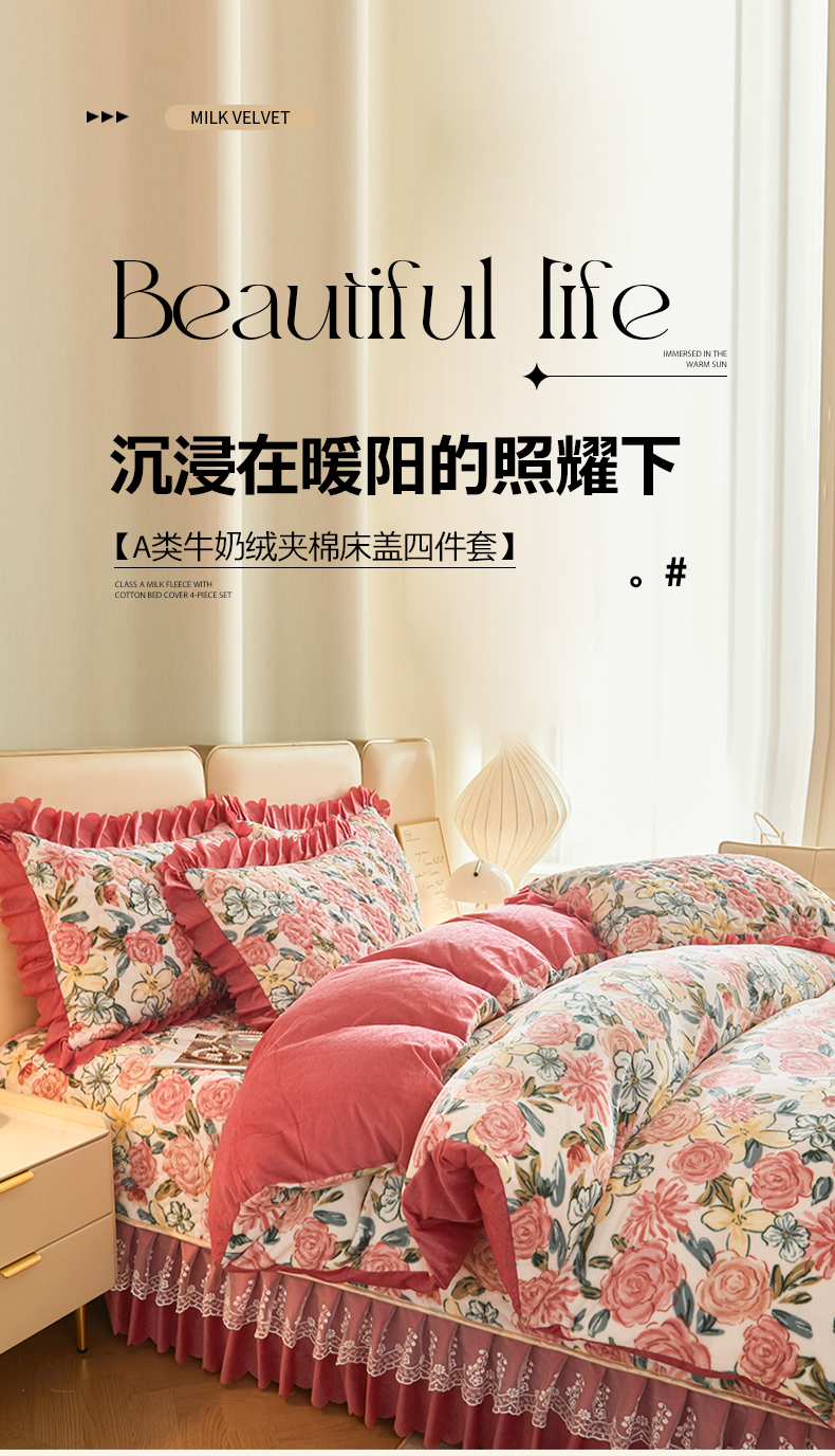 • 91家纺网 家纺一手货源 找家纺 艾裙海 2025新款高克重加厚保暖A类牛奶绒夹棉床盖系列四件套 爱的花海