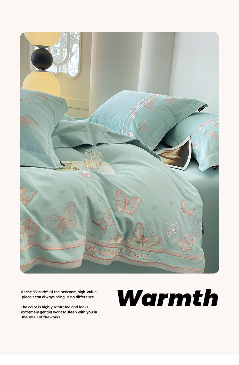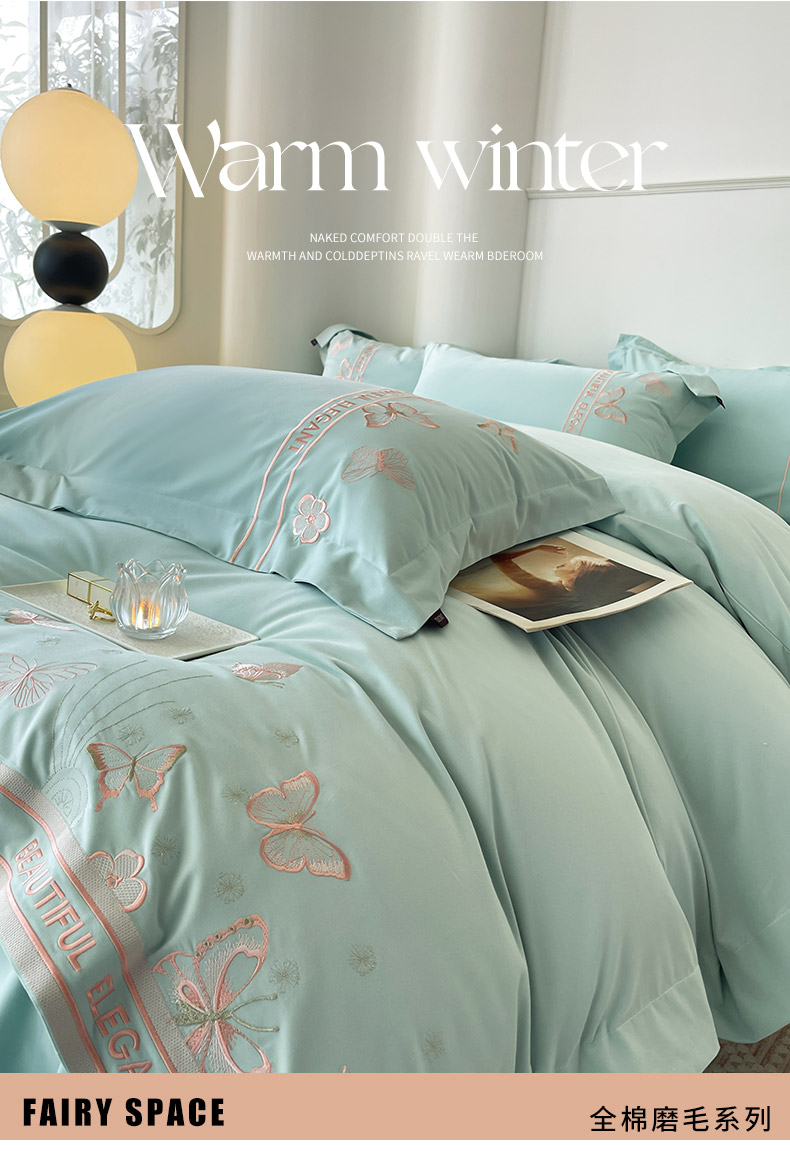 秋冬新品A类纯棉加厚磨毛四件套轻奢简约风蝴蝶床单被套床上用品晨光蝶语-茶绿