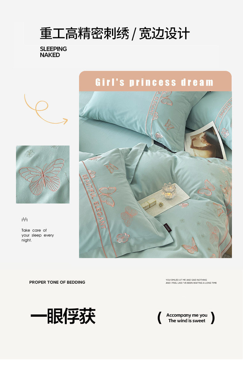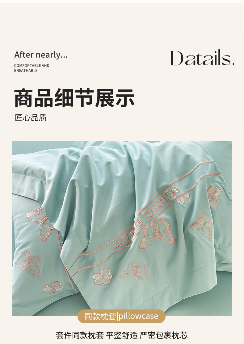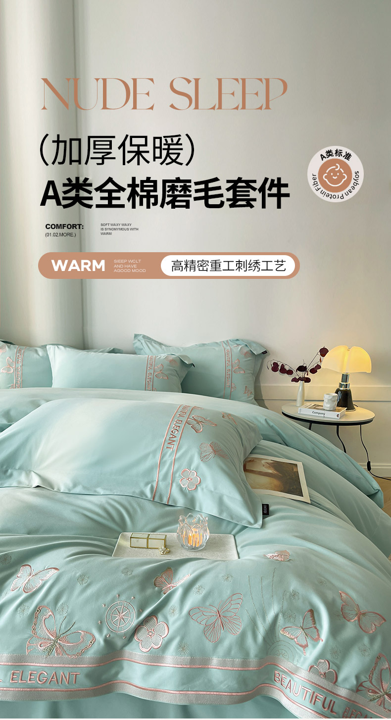 商品名称:秋冬新品A类纯棉加厚磨毛四件套轻奢简约风蝴蝶床单被套床上用品晨光蝶语-茶绿