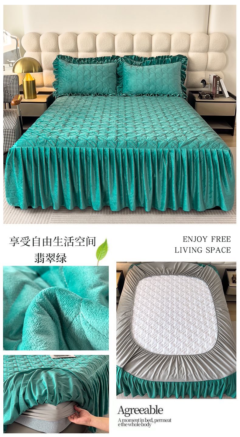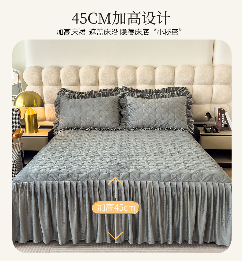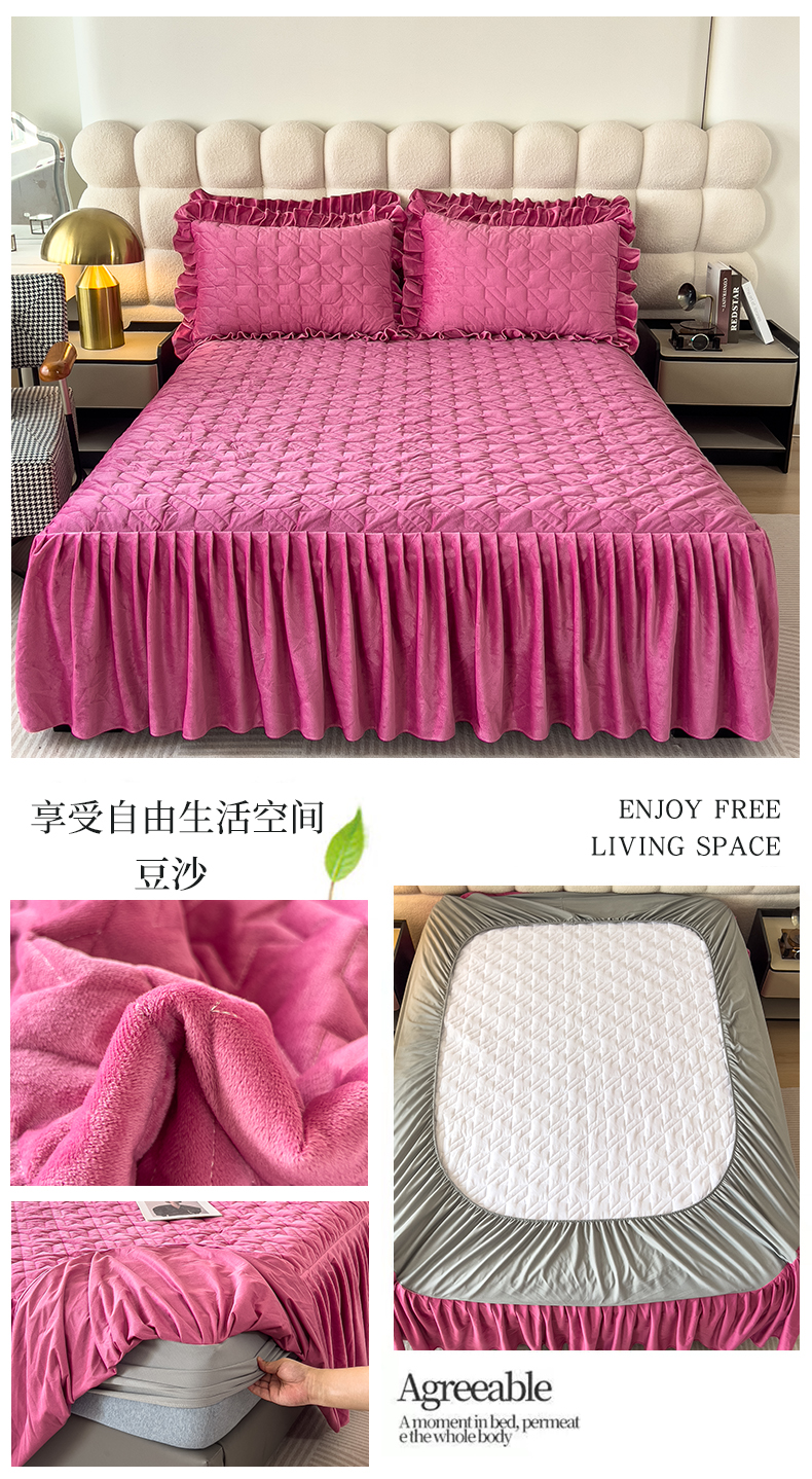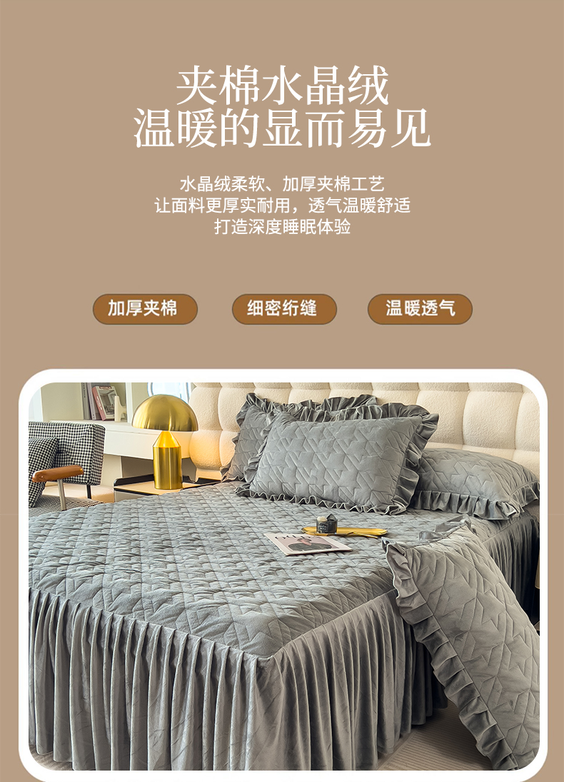 (总)屹成家纺2025新款水晶绒夹棉绗缝蕾丝床裙三件套(塞纳河畔)床裙单件起售价不低于105元,大红,豆沙,翡翠绿,粉玉,橄榄绿,蔚蓝,银灰