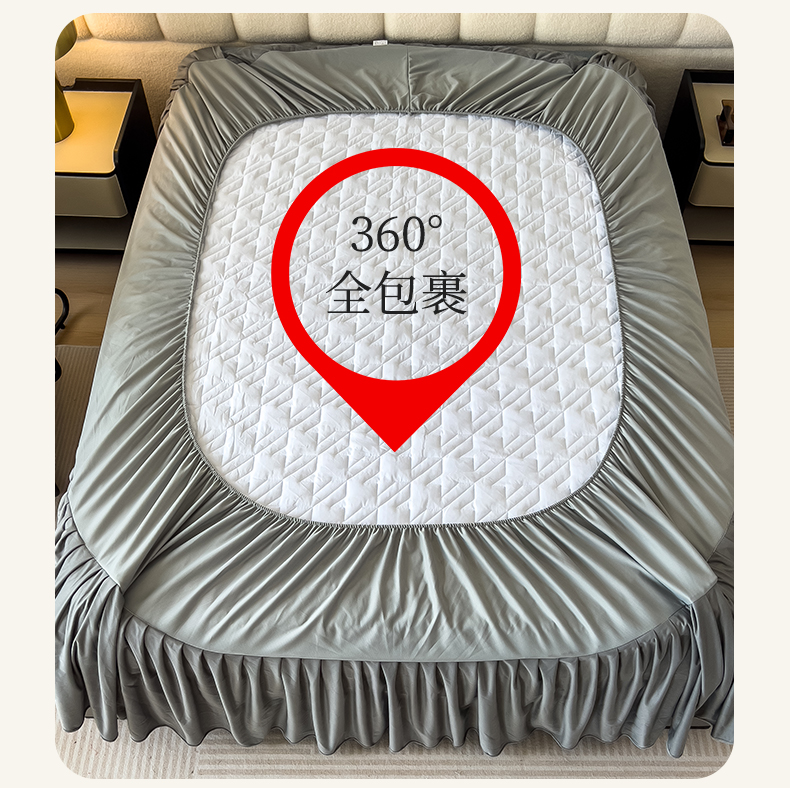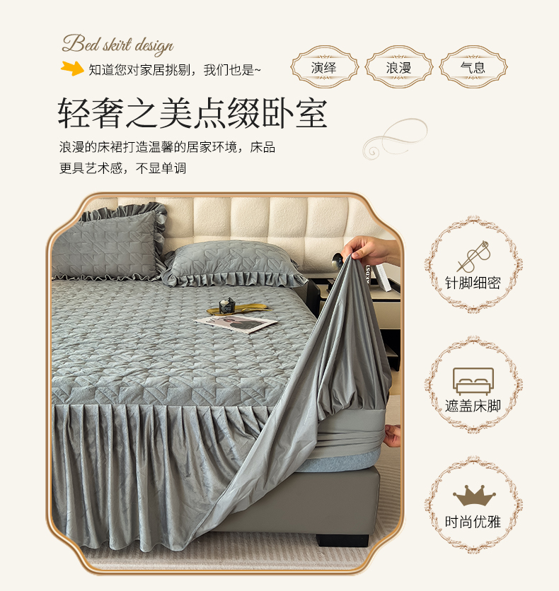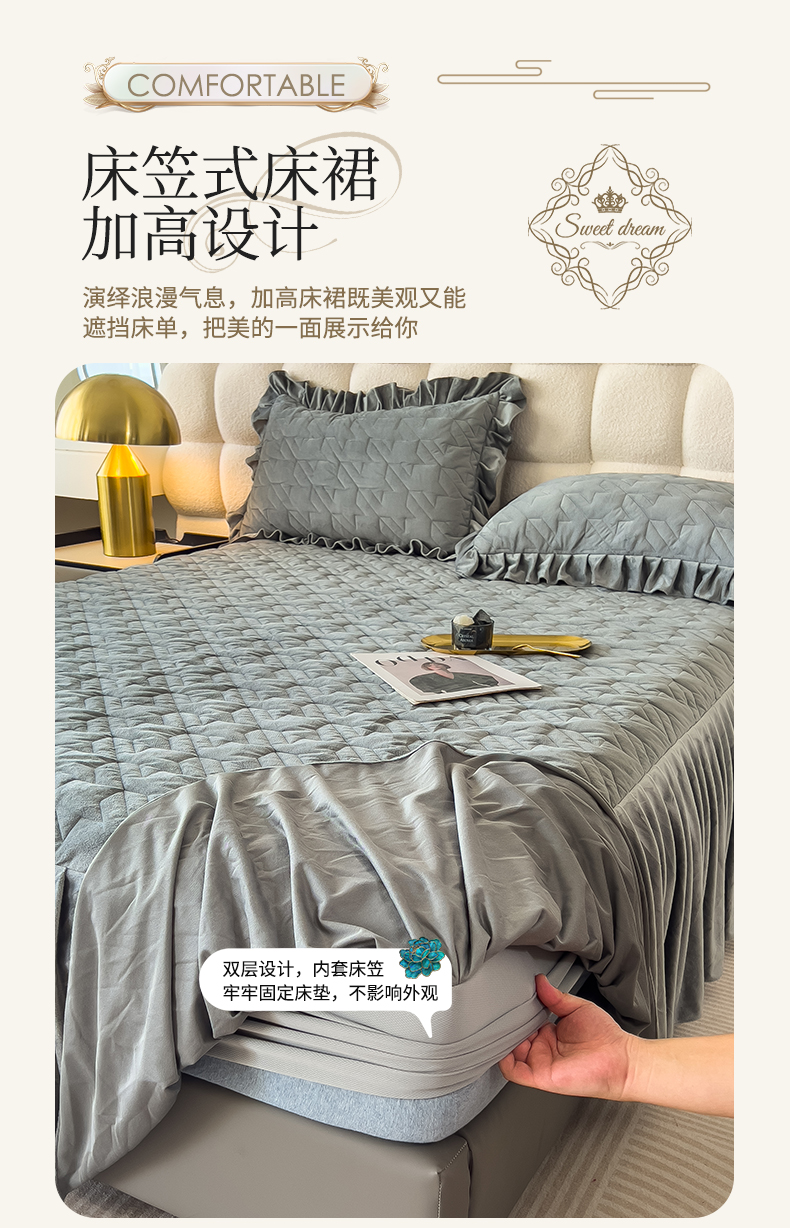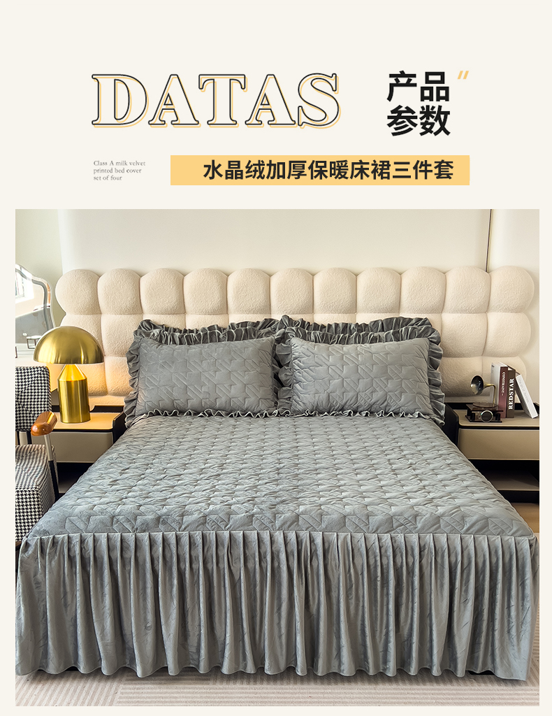 (总)屹成家纺2025新款水晶绒夹棉绗缝蕾丝床裙三件套(塞纳河畔)床裙单件起售价不低于105元,大红,豆沙,翡翠绿,粉玉,橄榄绿,蔚蓝,银灰