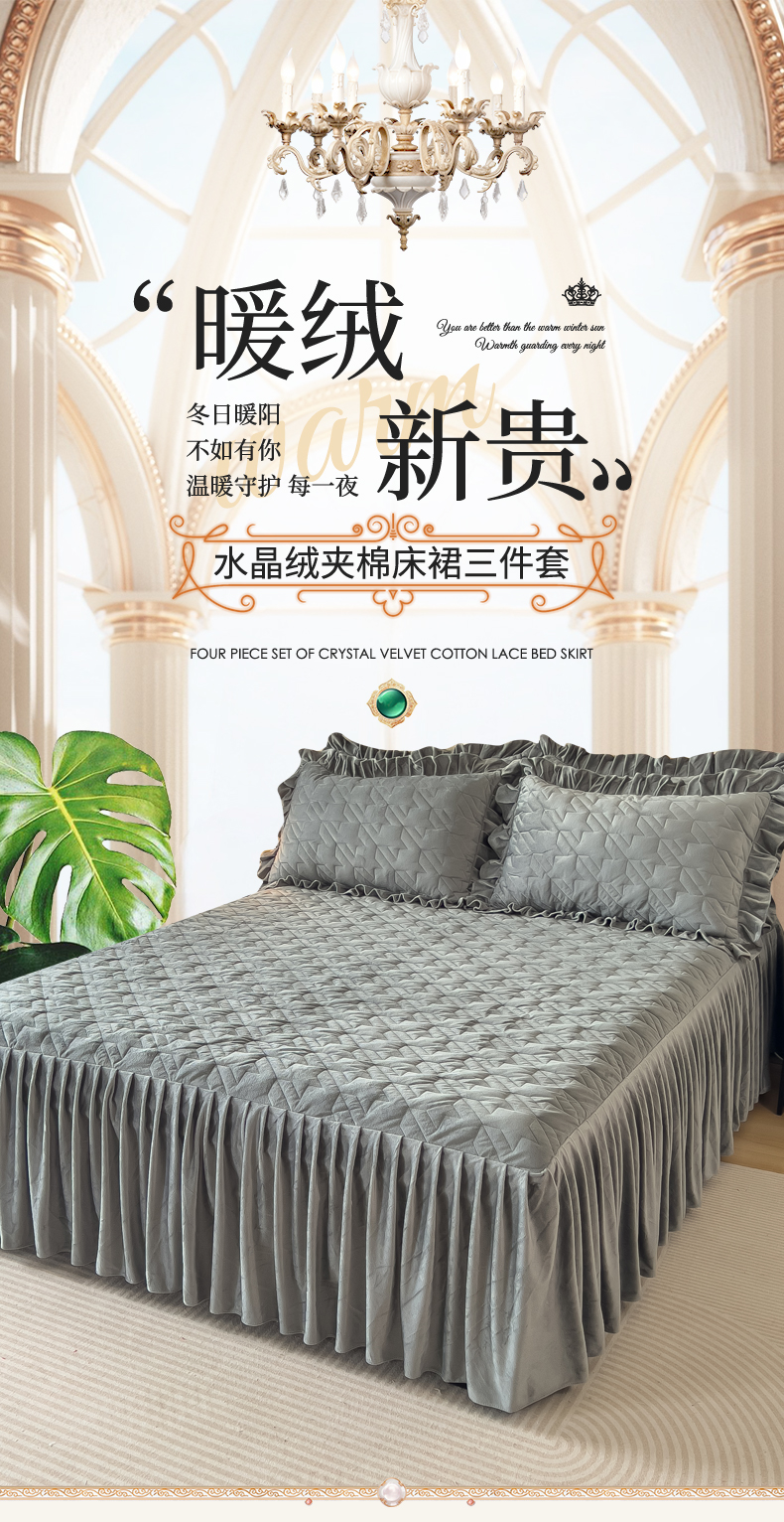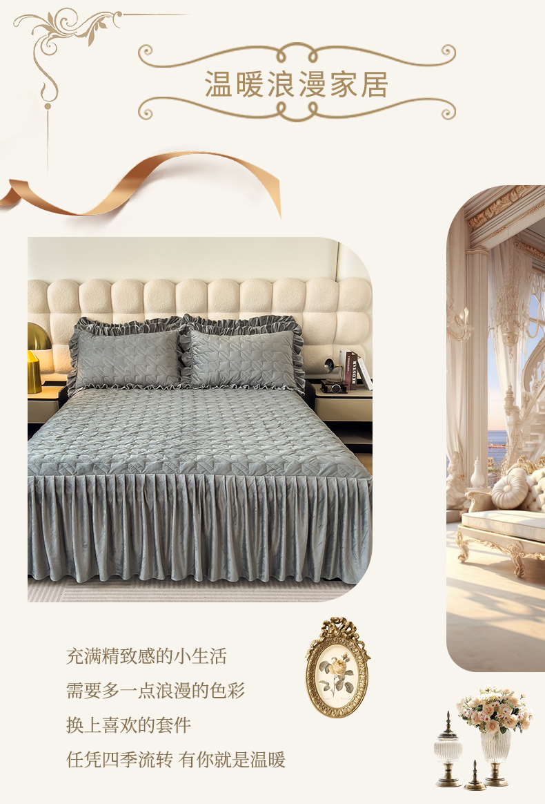 • 91家纺网 家纺一手货源 找家纺 (总)屹成家纺2025新款水晶绒夹棉绗缝蕾丝床裙三件套(塞纳河畔)床裙单件起售价不低于105元,大红,豆沙,翡翠绿,粉玉,橄榄绿,蔚蓝,银灰