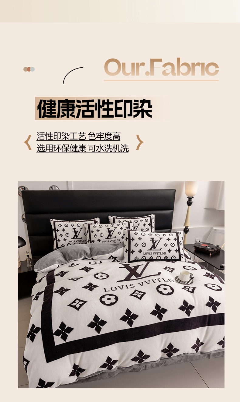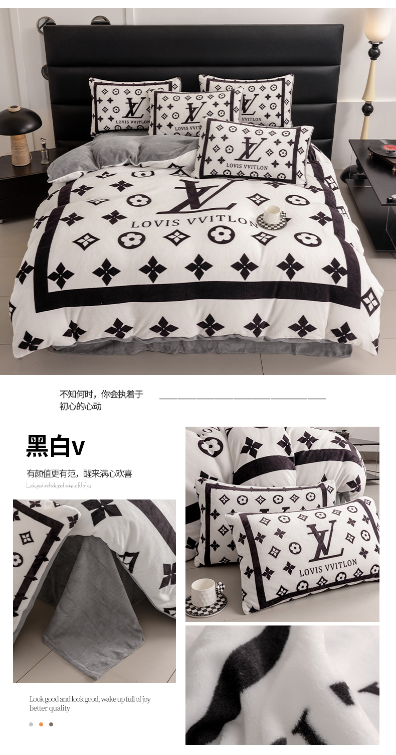 商品名称:色鬼布艺 2024新款高克重牛奶绒大版印花四件套 黑白v
