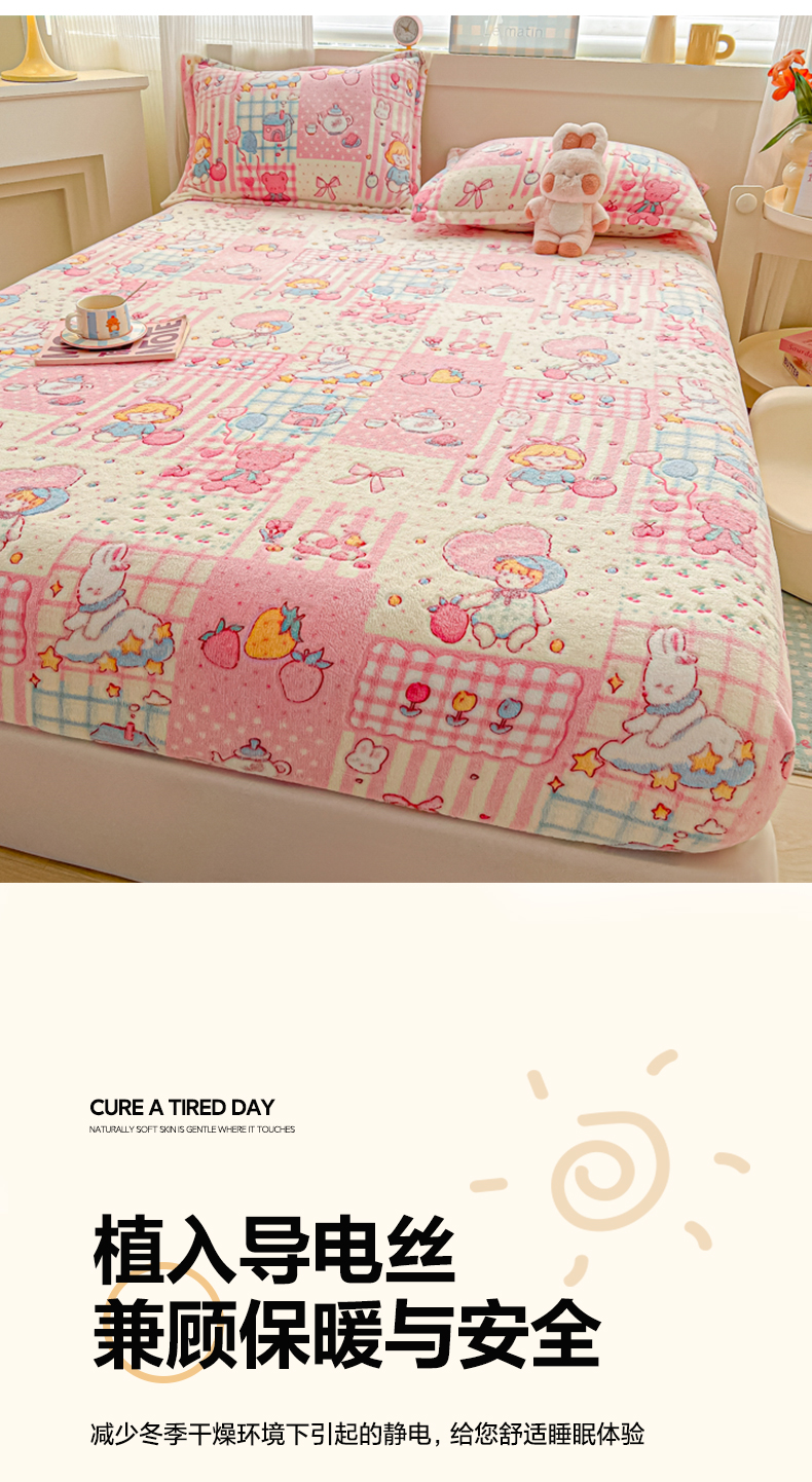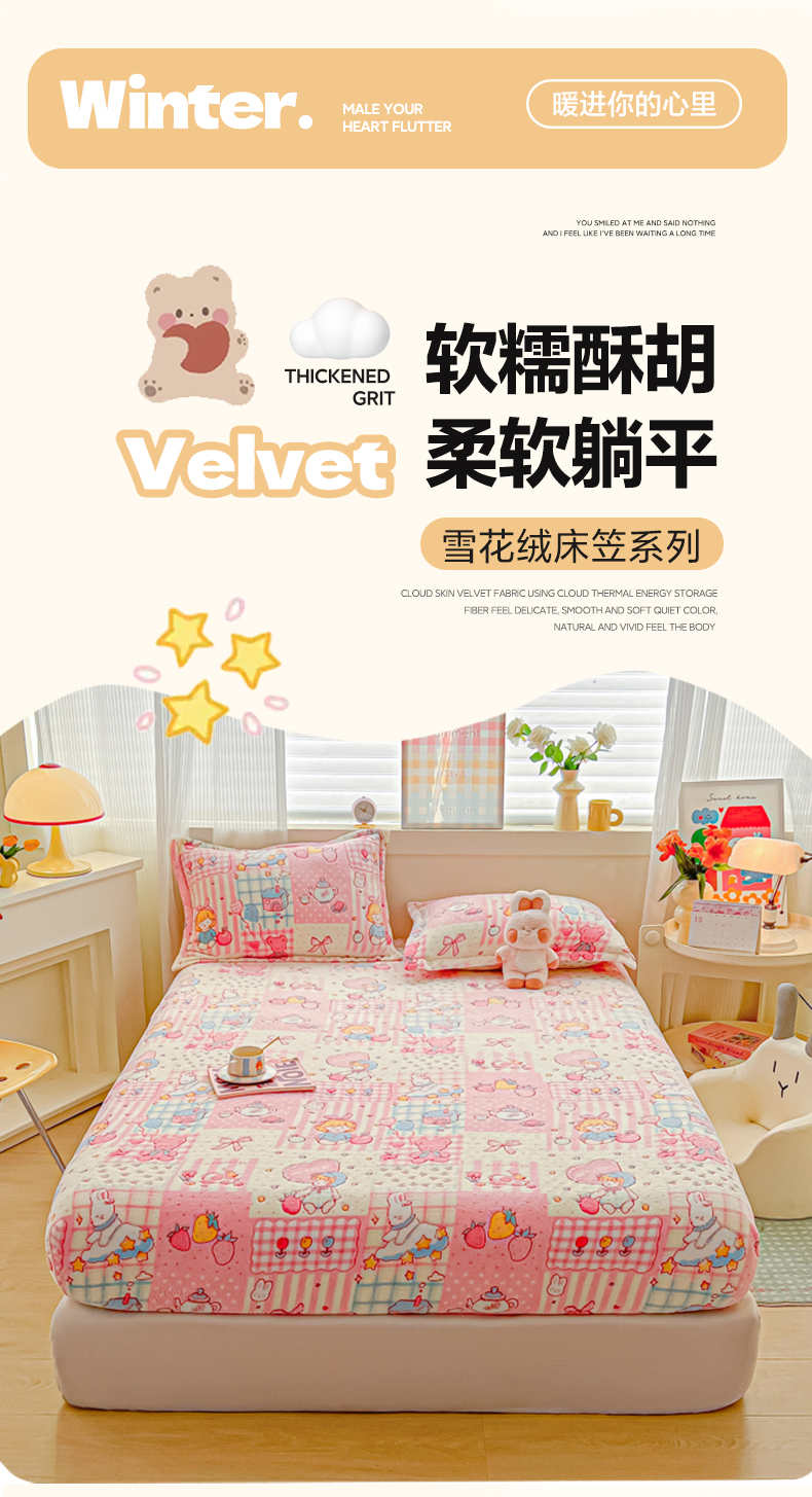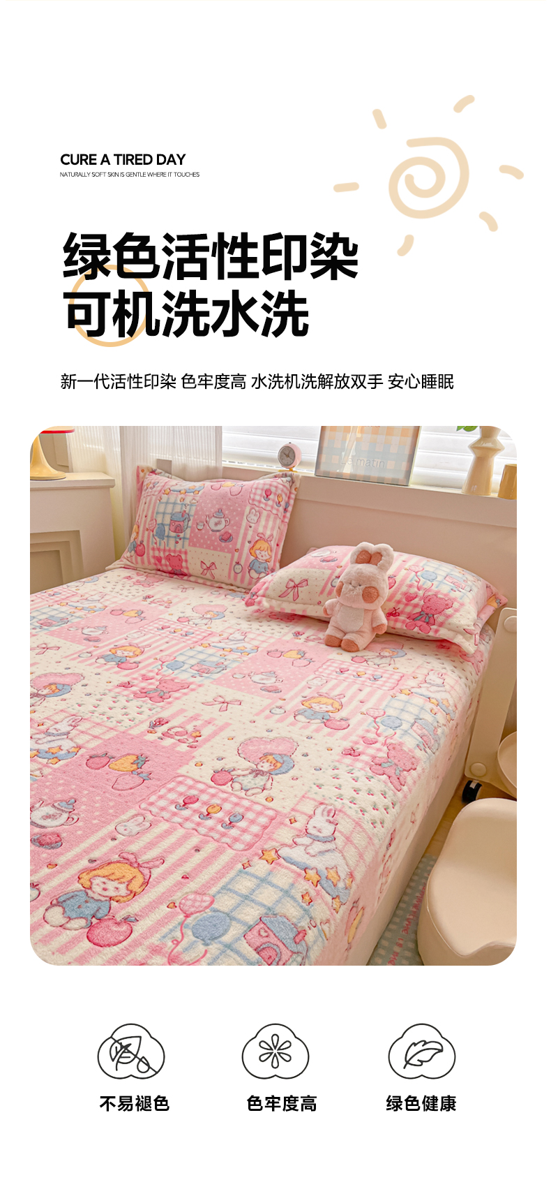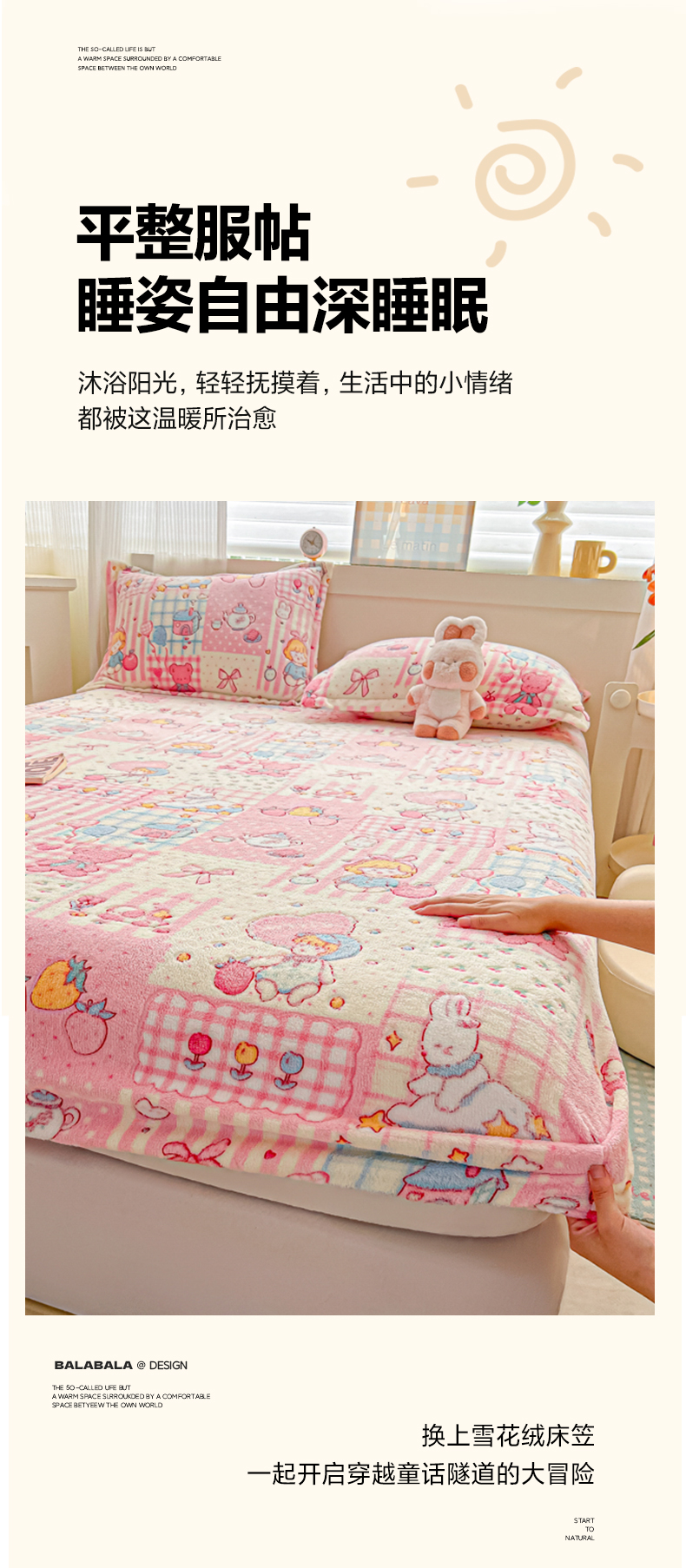 • 91家纺网 家纺一手货源 找家纺 韩巢家纺 2024新款加厚雪花绒卡通印花保暖牛奶绒珊瑚绒床笠三件套 天使女孩