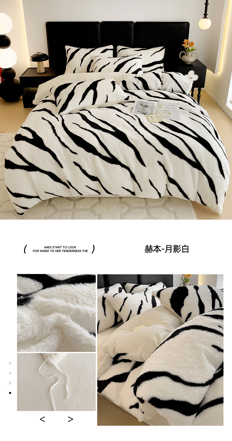 商品名称:米莱家纺 2024新款兔毛绒牛奶绒斑马四件套 赫本月光白