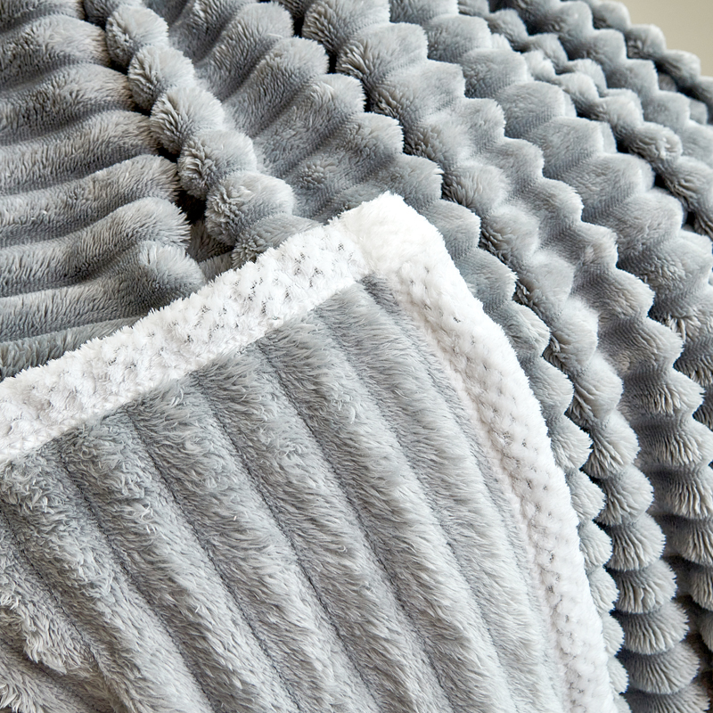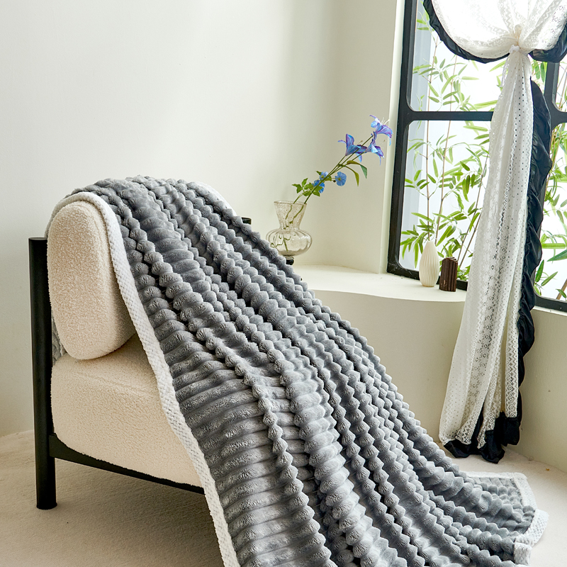 鹏程 24款300克抽条毛毯高克重法莱绒牛奶绒贝贝绒毛毯 灰条