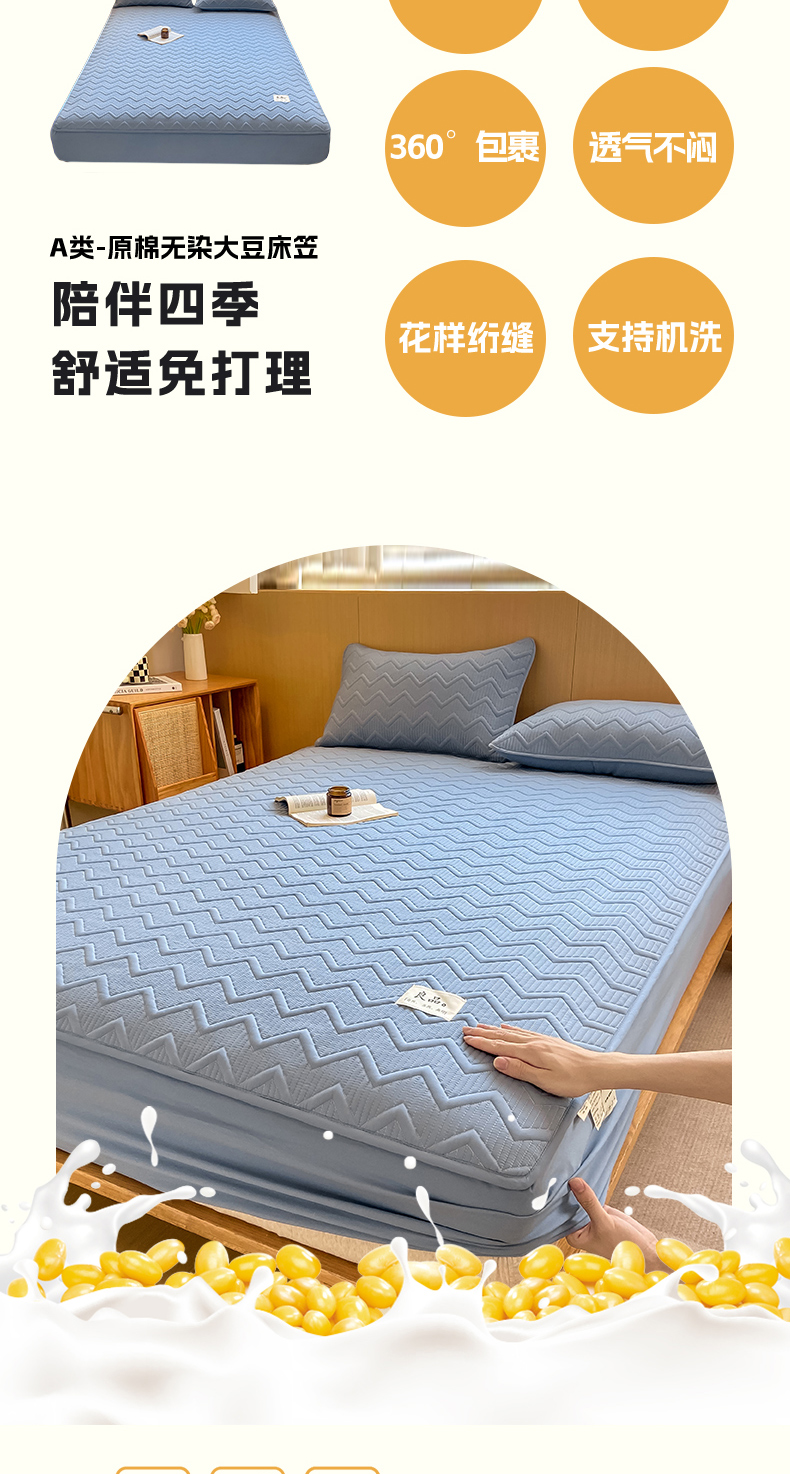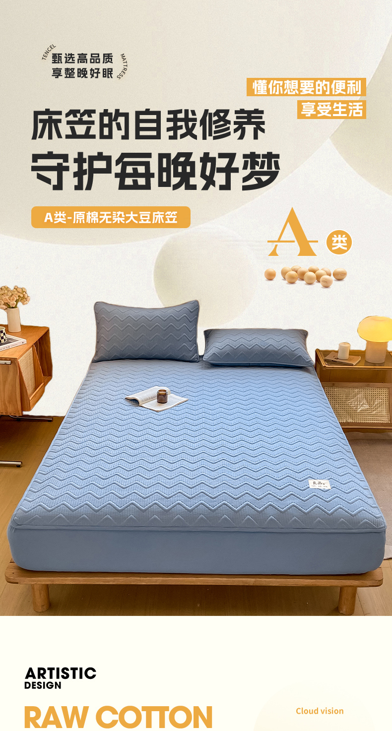 悦织湾家纺 2025新款A类本色原棉大豆床笠 麦浪纹-优雅蓝