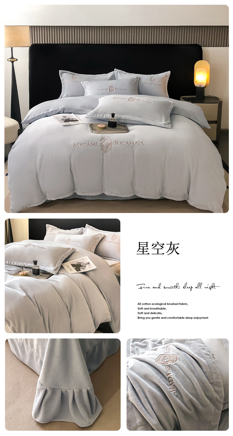 商品名称:梦莱斯 2025新款高克重牛奶绒刺绣四件套 星空灰