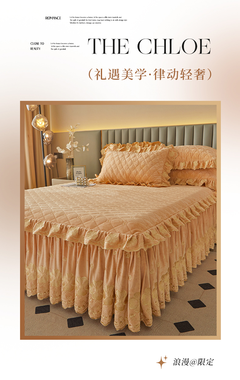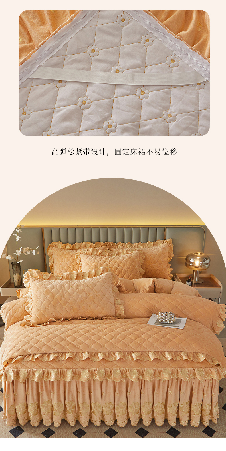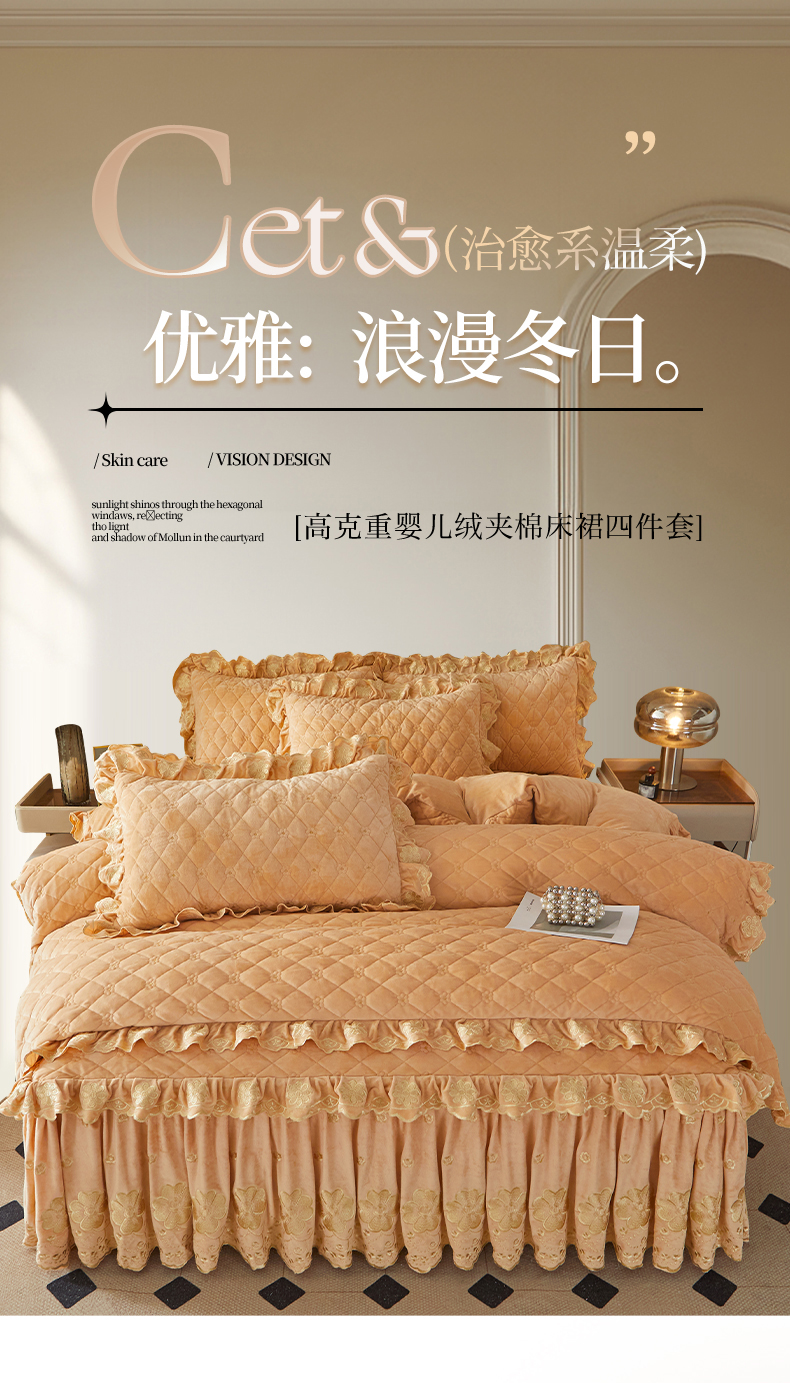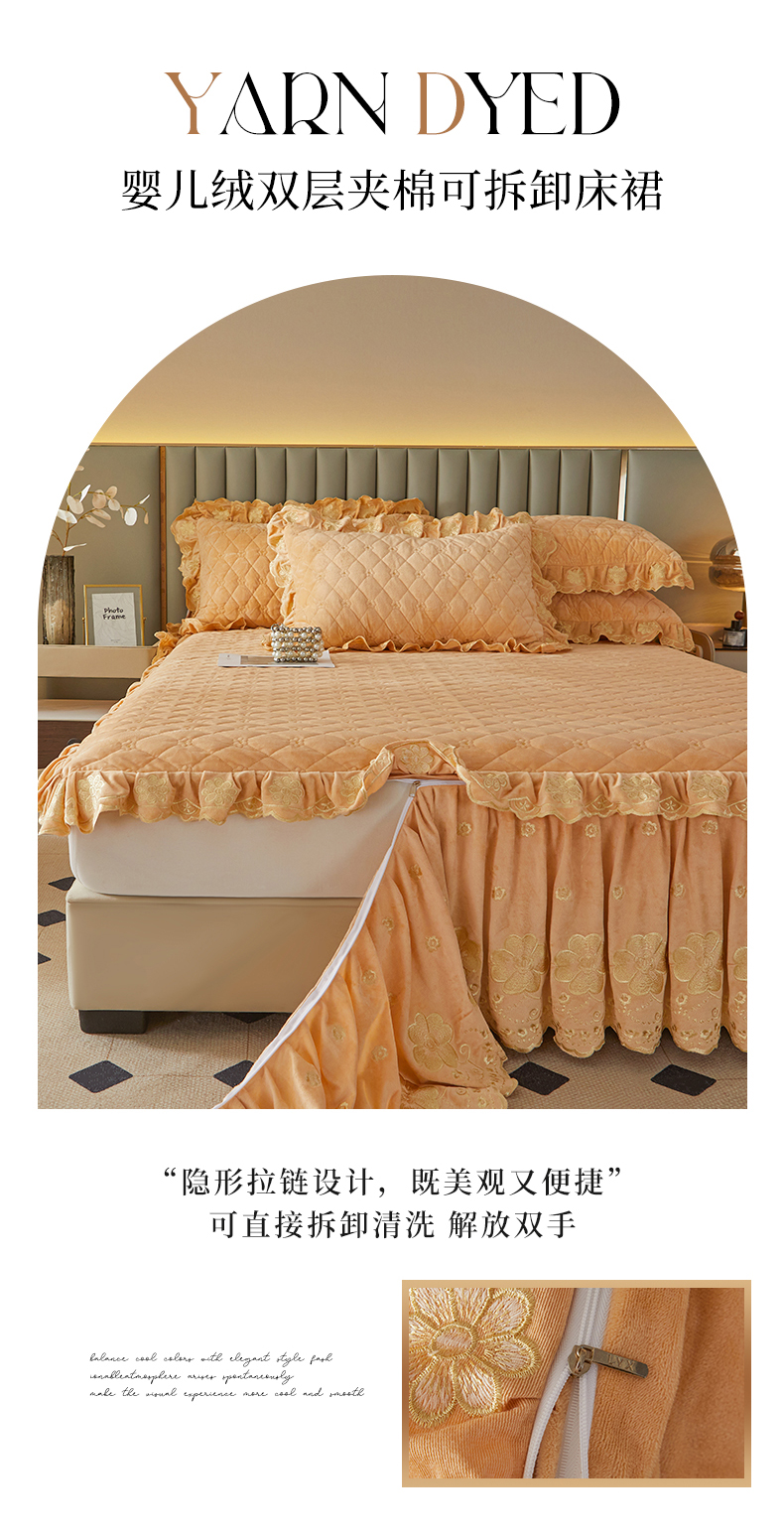当前位置: 91家纺网 > 商品网购 > 床品套件 > 四件套 > 其它四件套 > 罗艺轩 2025新款婴儿绒双层夹棉可拆卸床裙四件套-花语 花语-香槟金