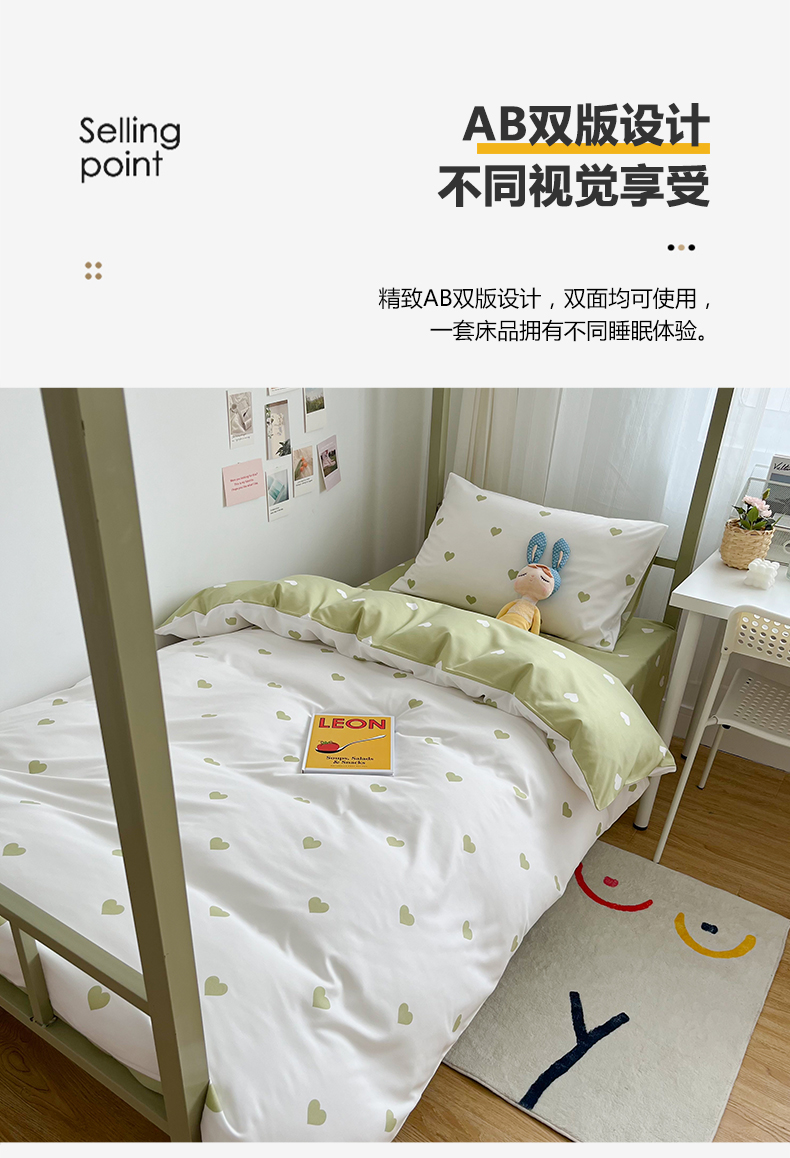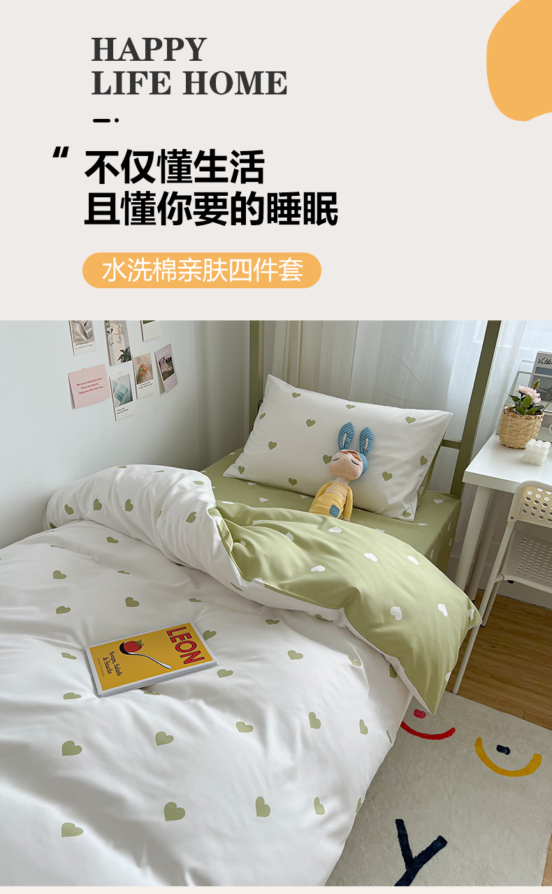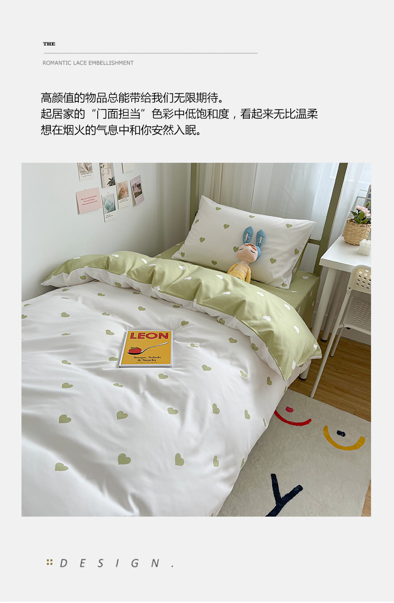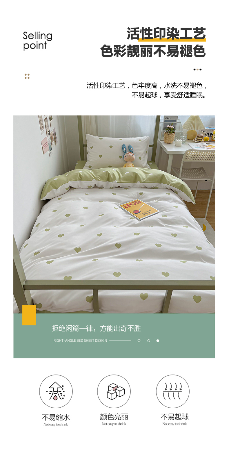 商品名称:悦织湾家纺 2025新款水洗棉亲肤爱心款学生三件套印花轻奢时尚四件套 爱心-浅绿