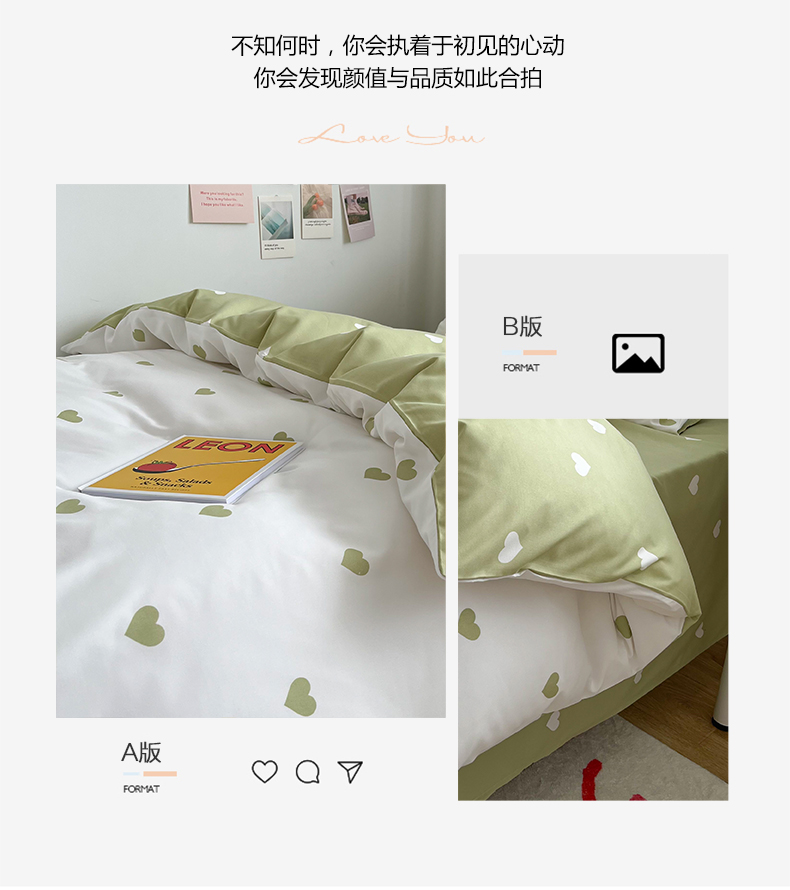 悦织湾家纺 2025新款水洗棉亲肤爱心款学生三件套印花轻奢时尚四件套 爱心-浅绿