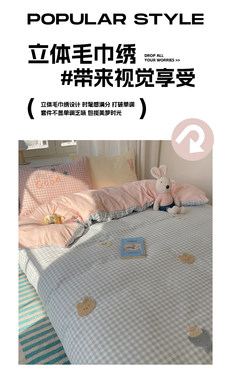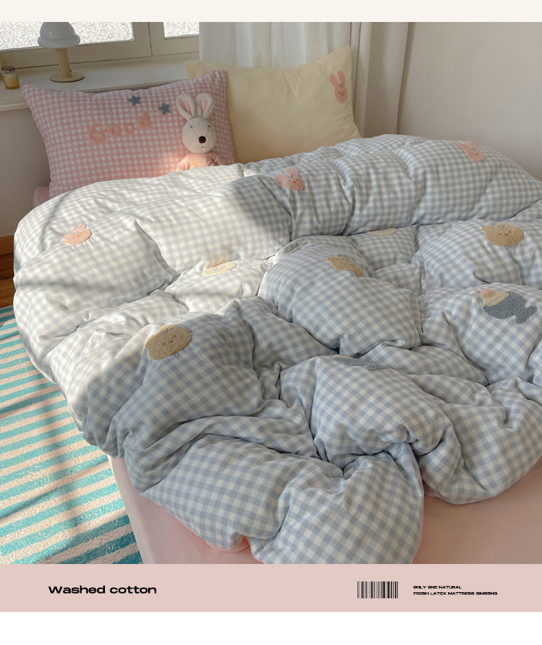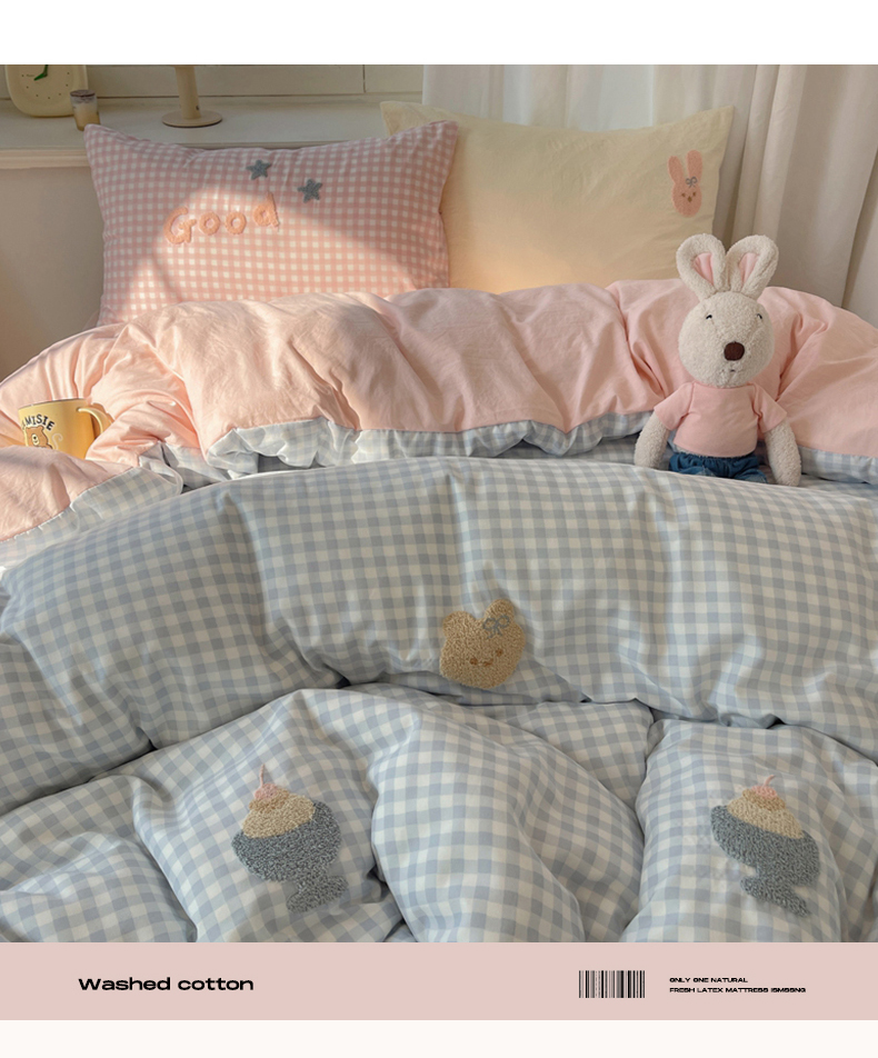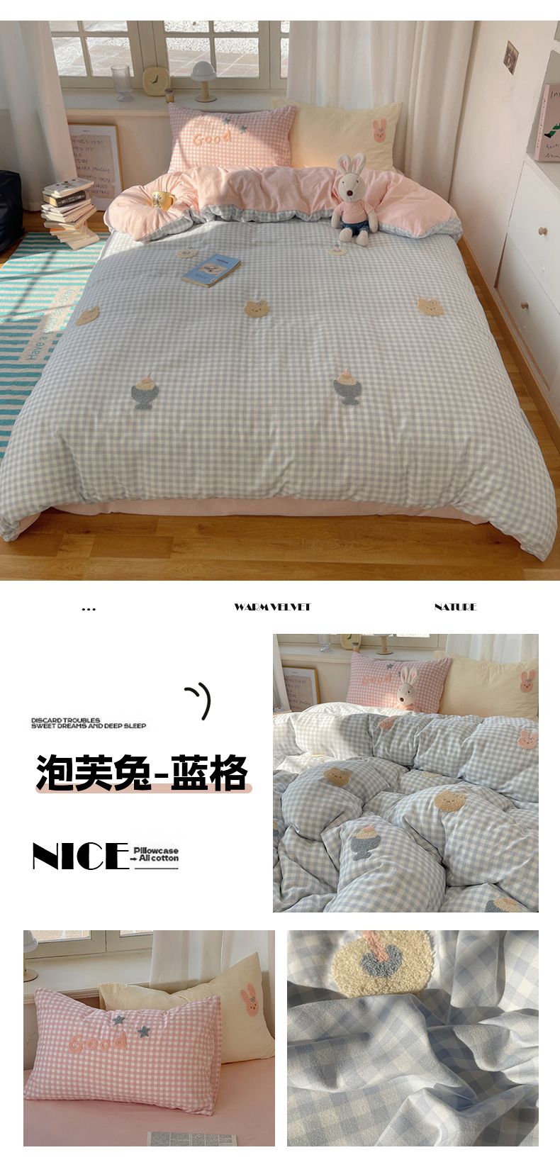 当前位置: 91家纺网 > 商品网购 > 床品套件 > 四件套 > 水洗棉四件套 > 阿曼达 2025新款爆款超甜可爱酷美毛巾绣软糯糯可以裸睡的水洗m纯色格子双拼四件套 泡芙兔-蓝格