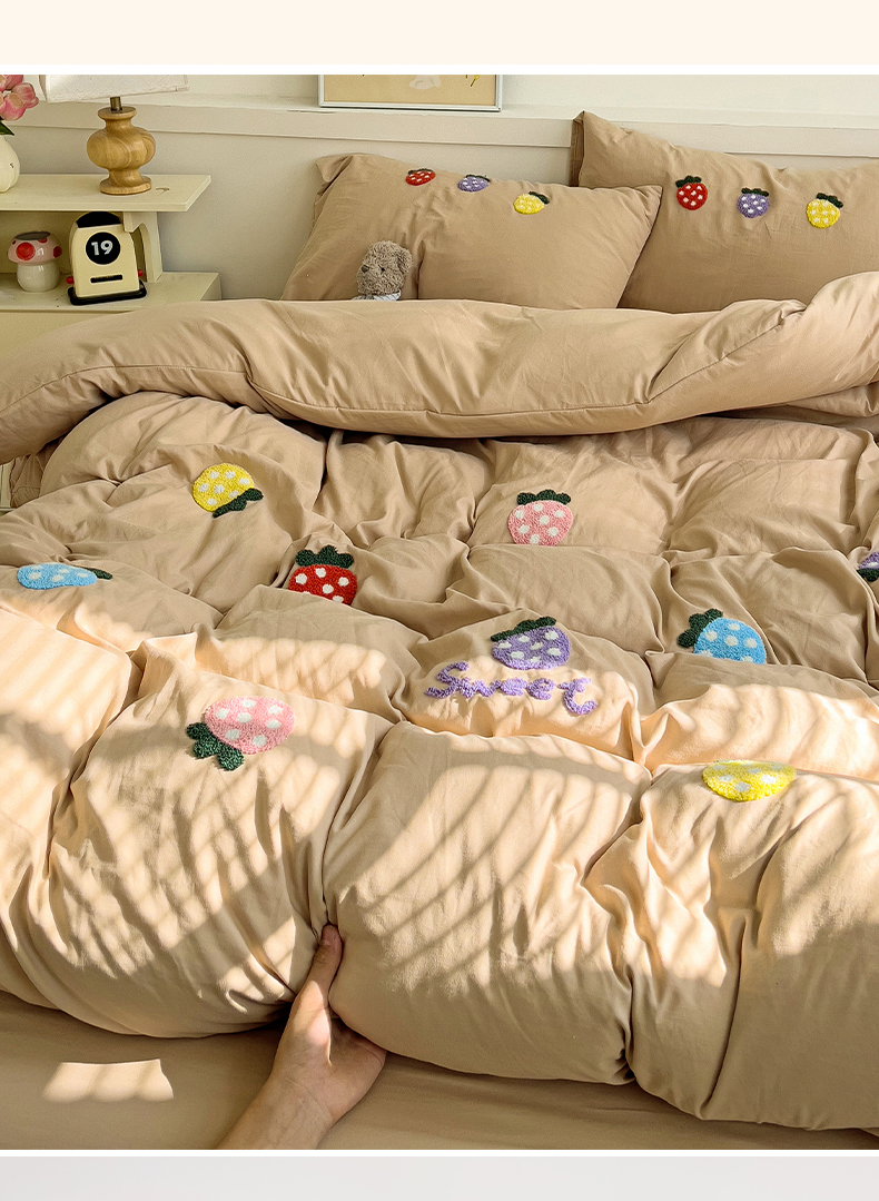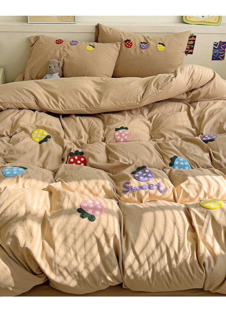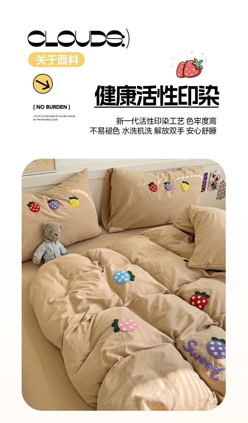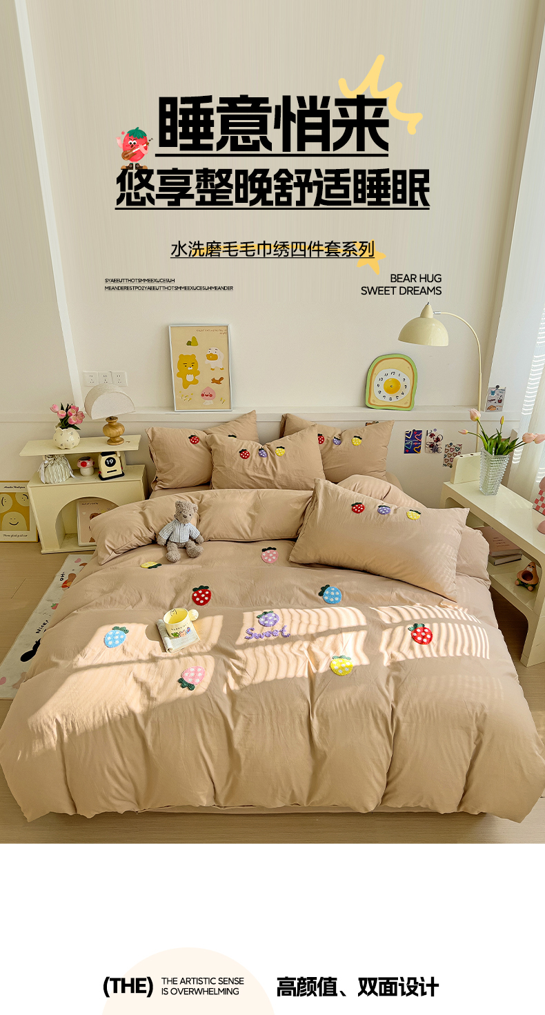 当前位置: 91家纺网 > 商品网购 > 床品套件 > 四件套 > 水洗棉四件套 > 逸尚阁 2025新款小清新毛巾绣四件套(提供买家秀) 草莓-卡其