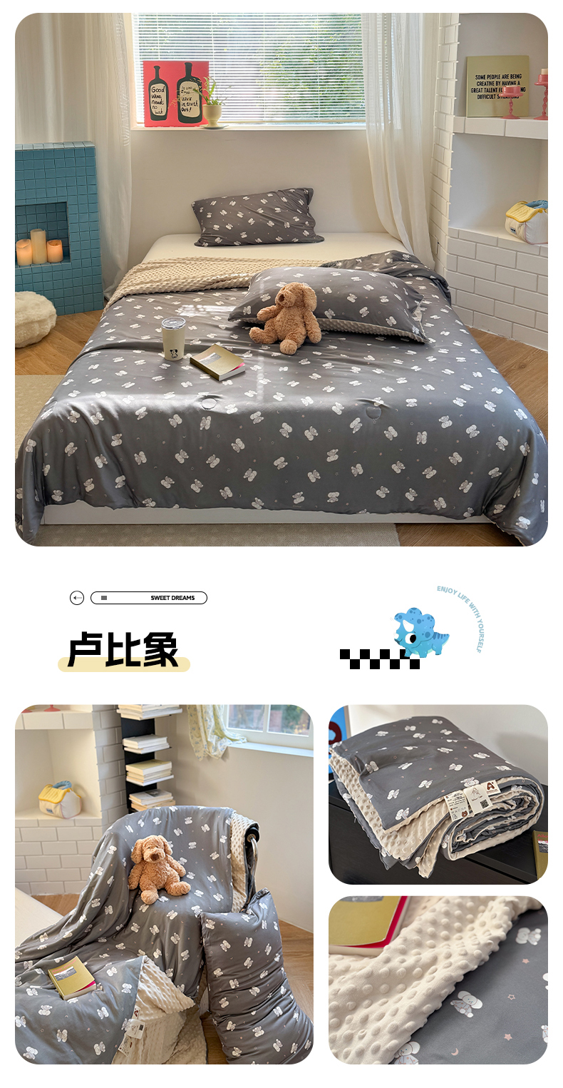 (总)暖生活 2025新款高克重细颗粒羊羔绒四件套,调皮小狗,灰色小象,毛绒小狗,甜点玩偶,小咪排队,幸福小窝