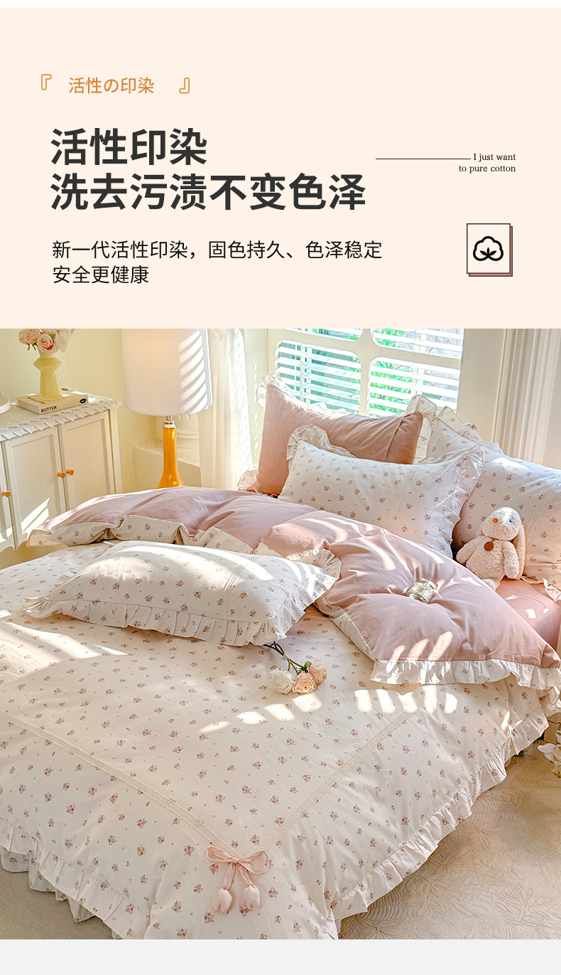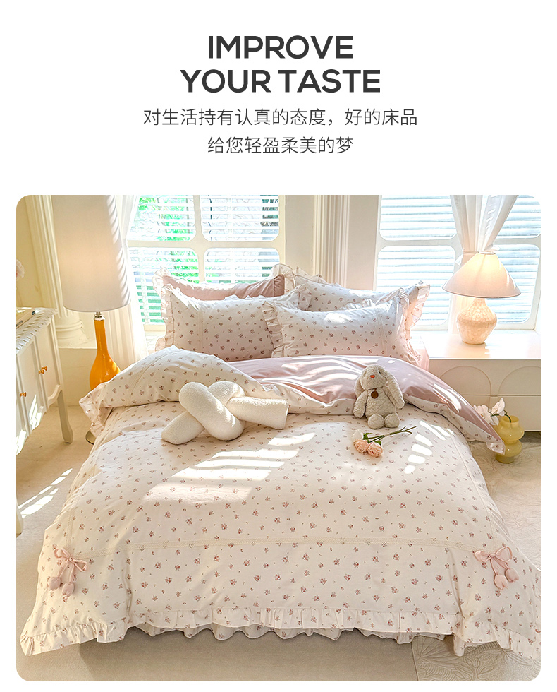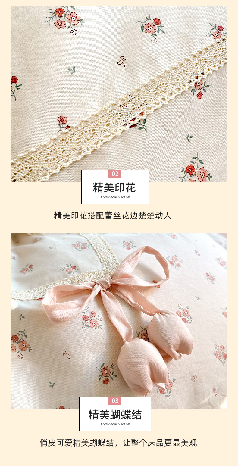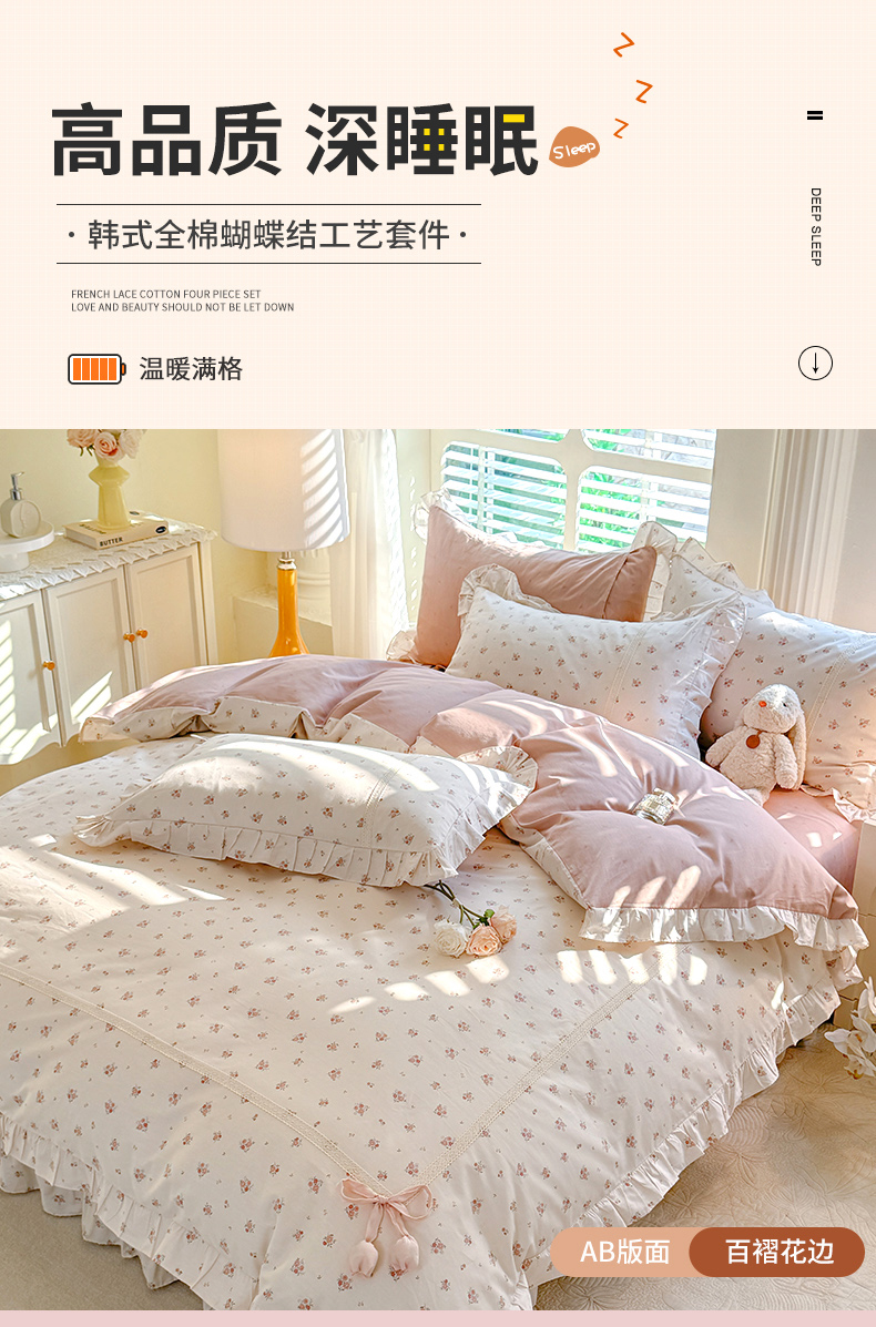 商品名称:艾唯希家纺 2025新款韩式全棉蝴蝶结工艺四件套纯棉公主风花边系列 花里-粉