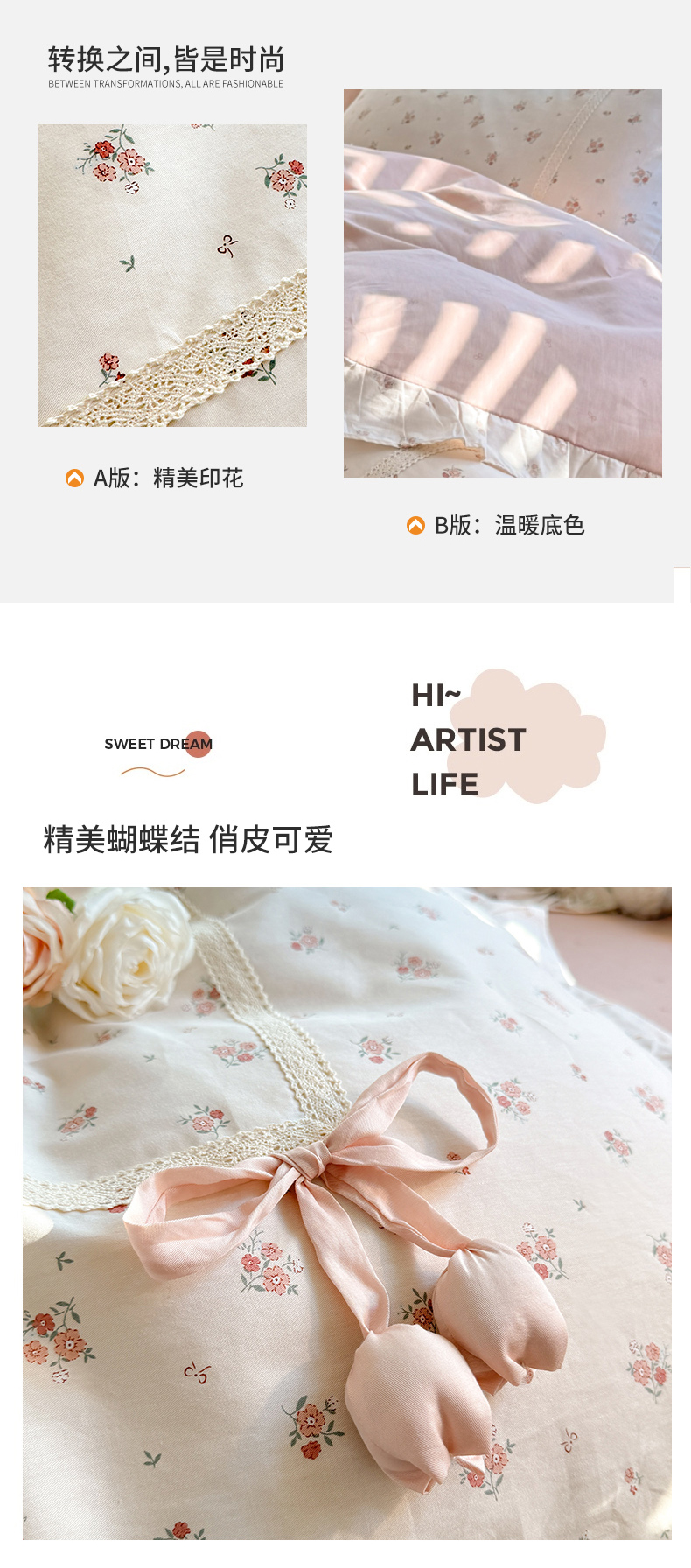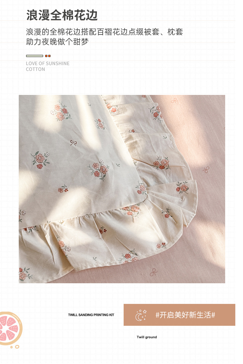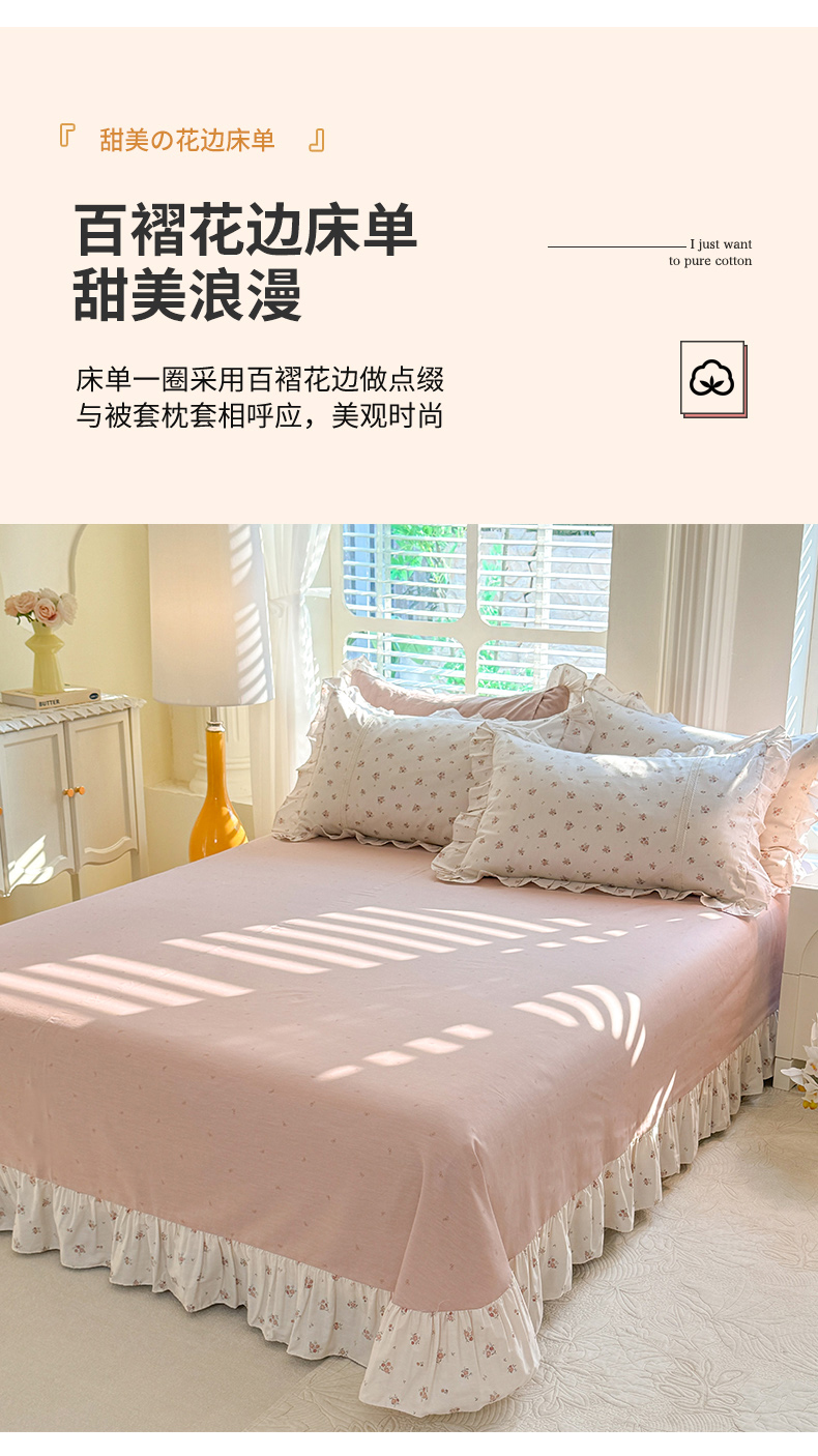 商品名称:艾唯希家纺 2025新款韩式全棉蝴蝶结工艺四件套纯棉公主风花边系列 花里-粉