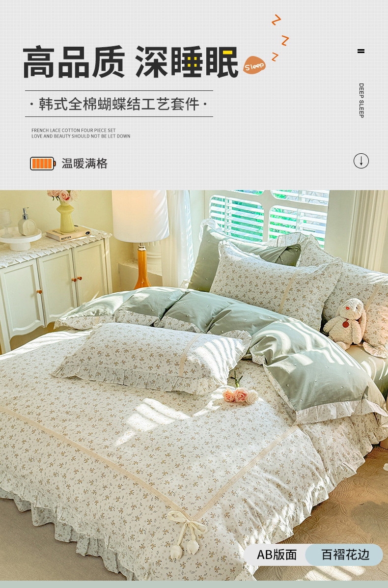 商品名称:艾唯希家纺 2025新款韩式全棉蝴蝶结工艺四件套纯棉公主风花边系列 今夕