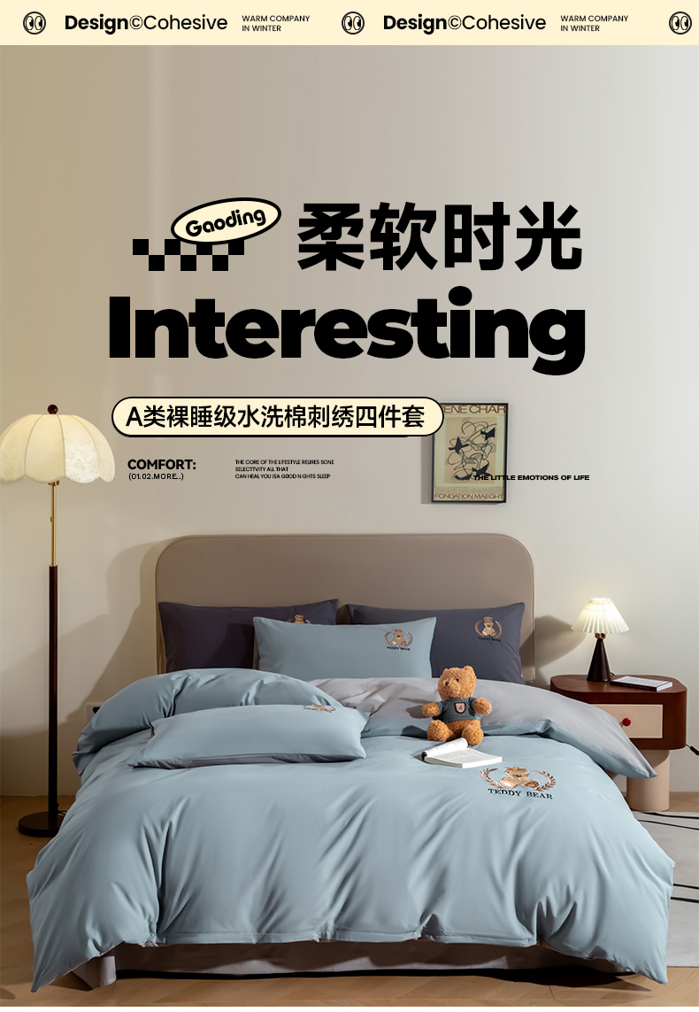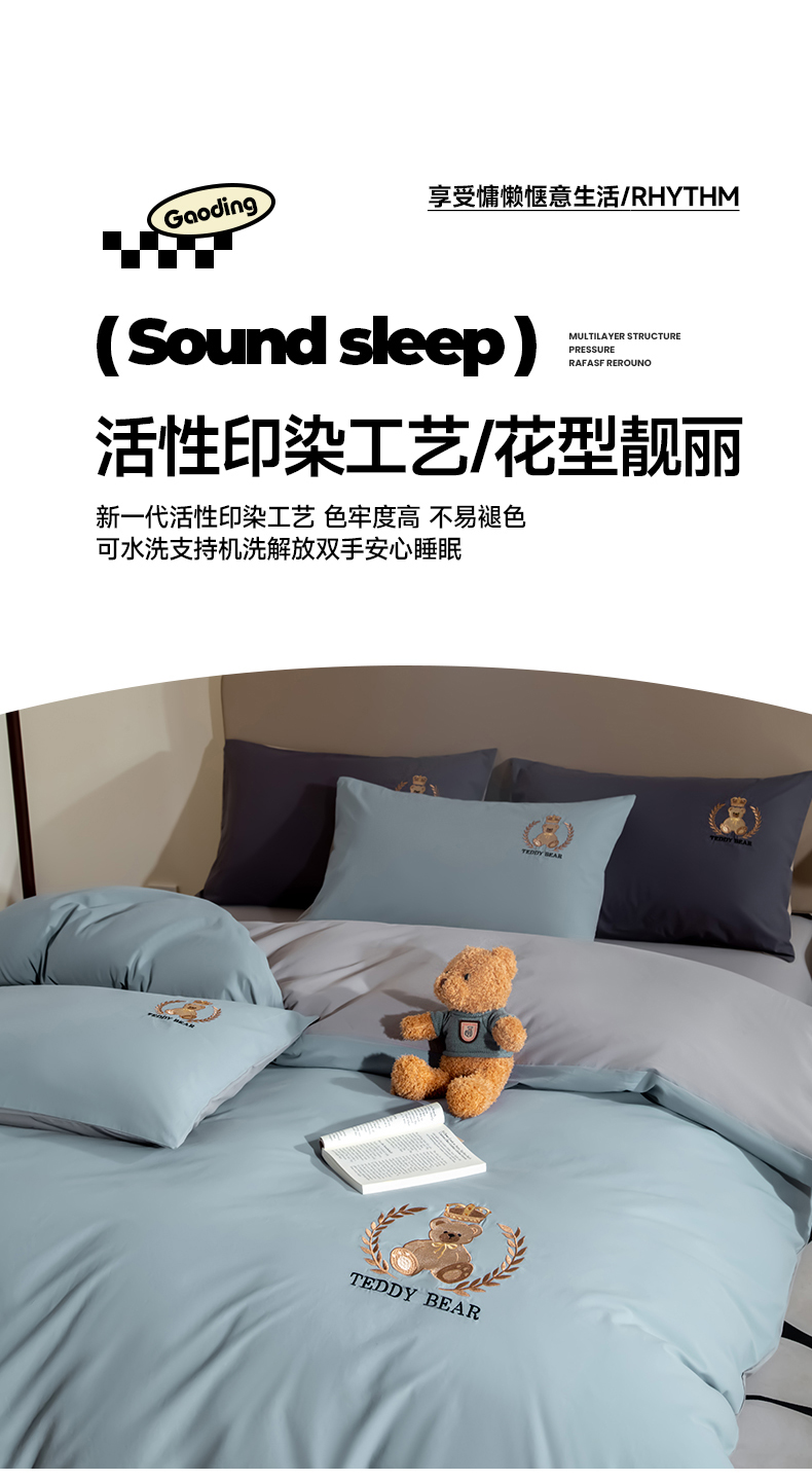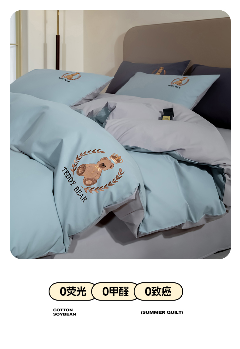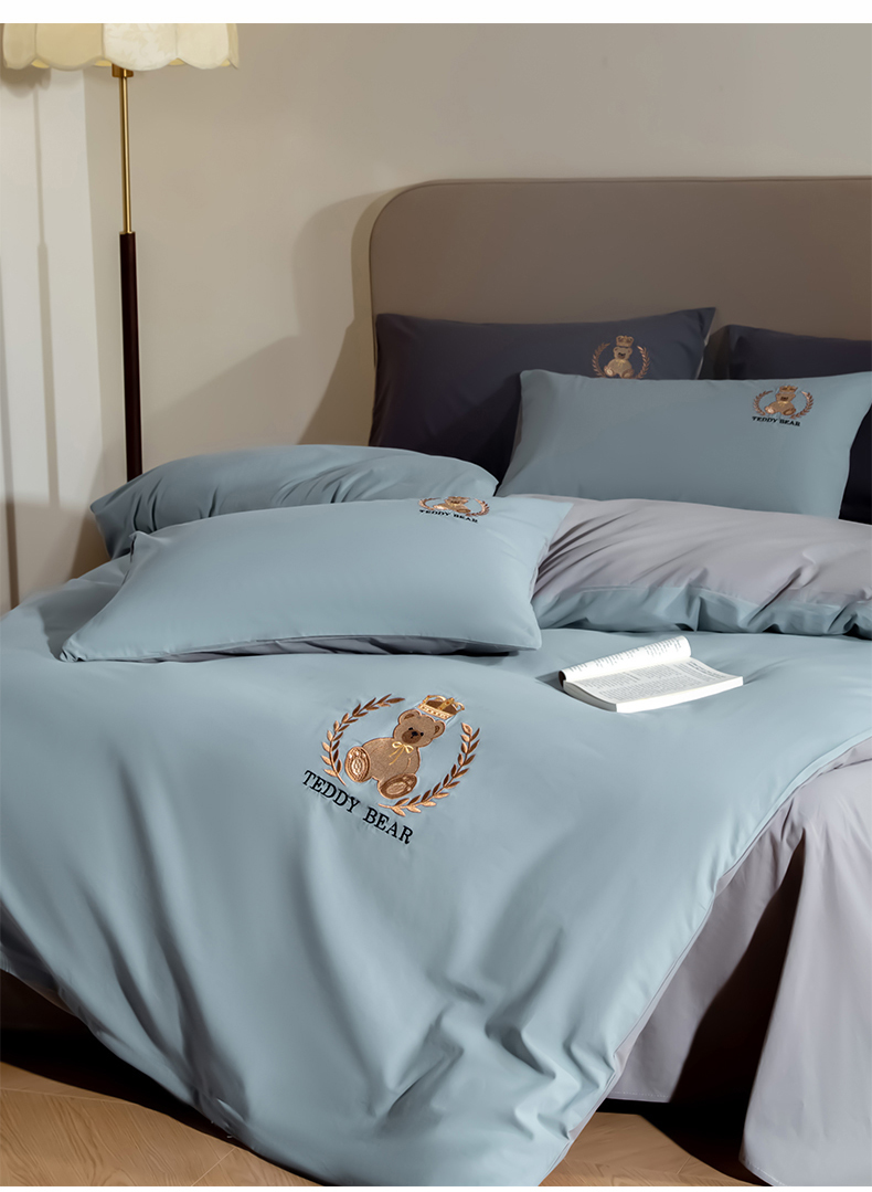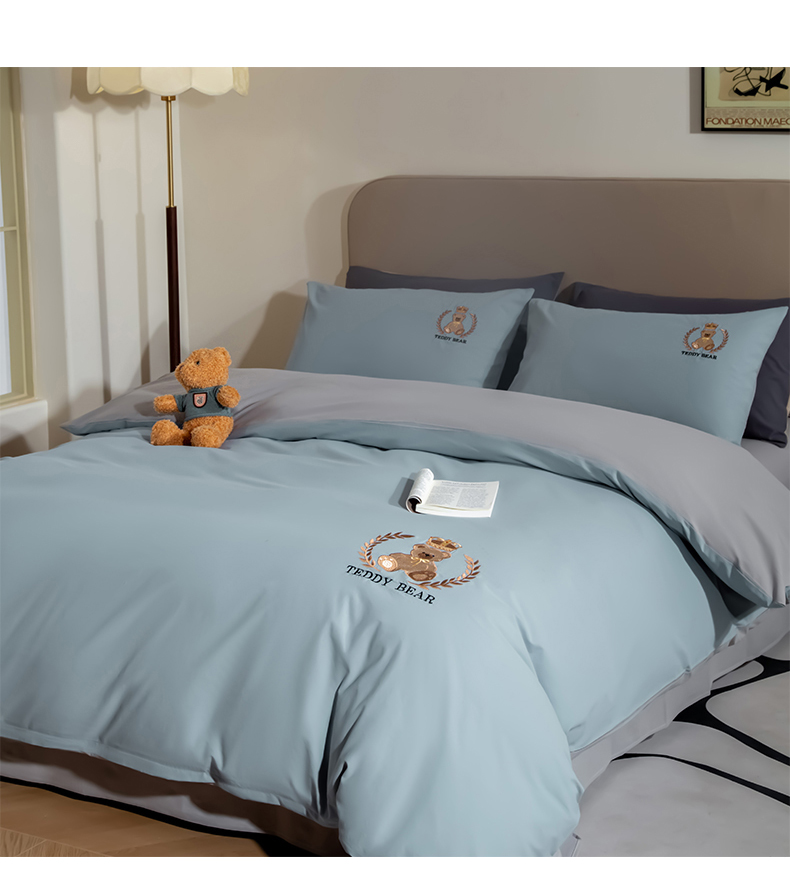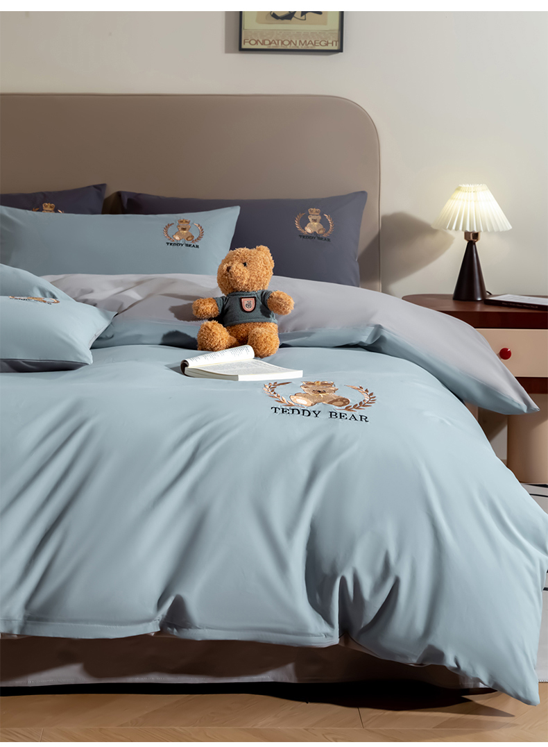 澳梵家居2025新款A类全棉水洗棉刺绣四件套-泰迪小熊 泰迪熊-雾蓝