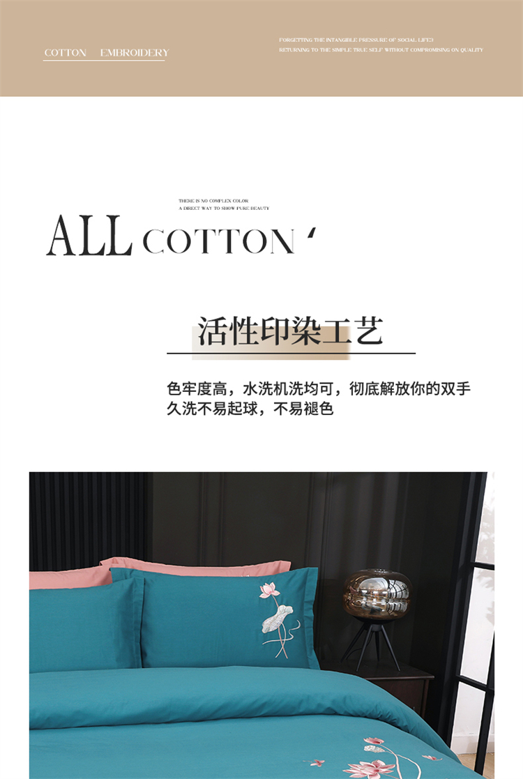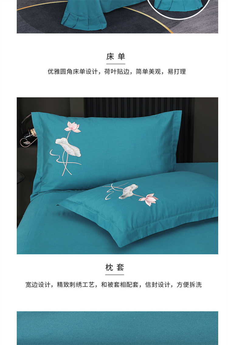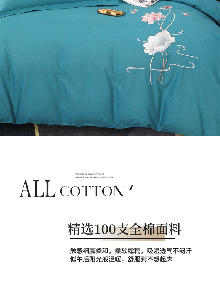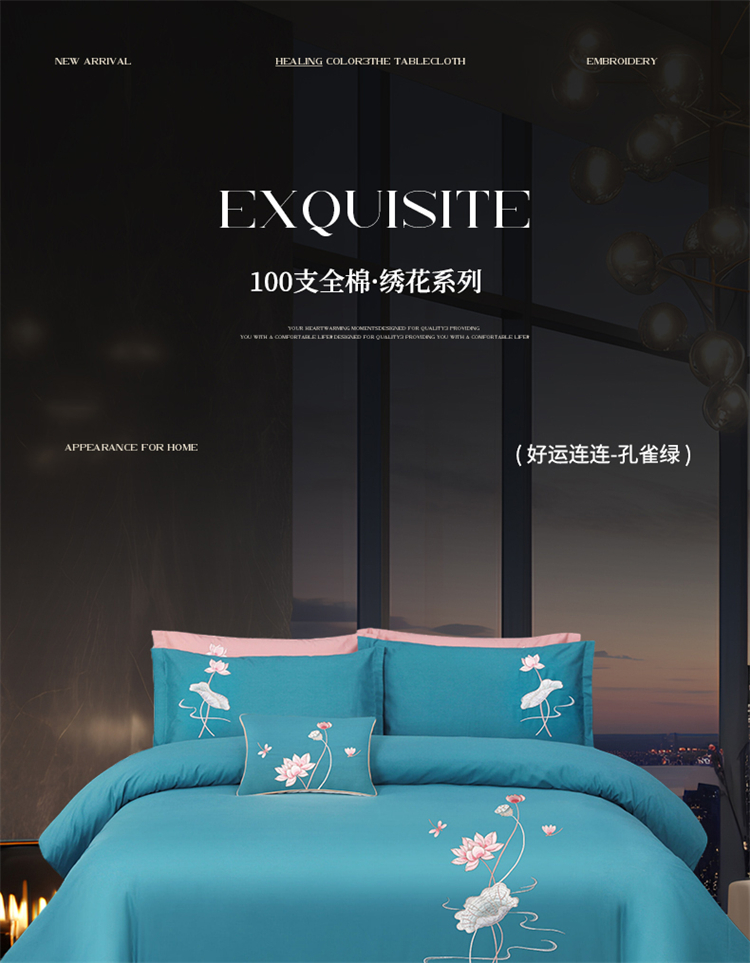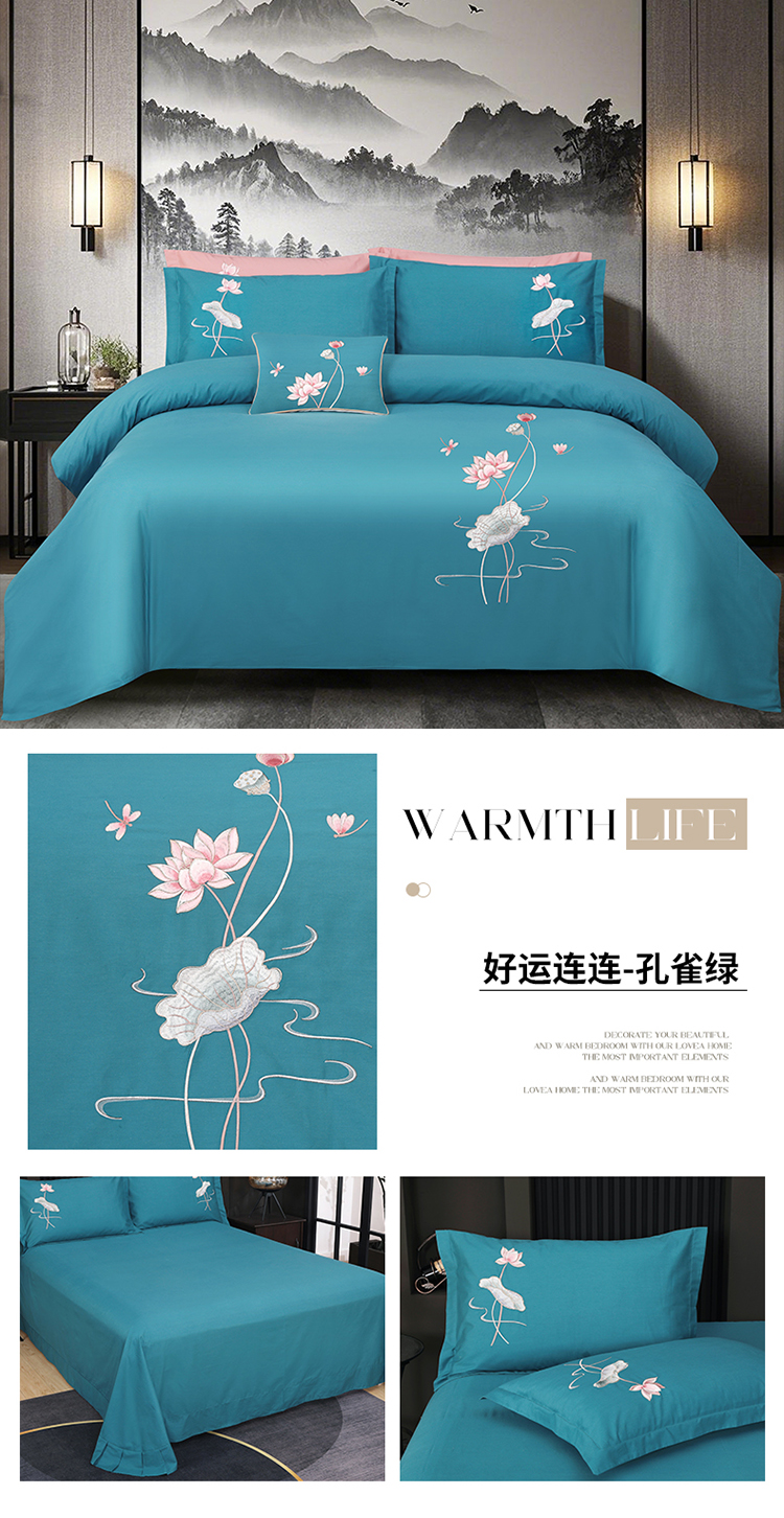 商品名称:浩情国际婚庆供货中心 2026新款100支全棉高端刺绣中式风四件套--好运连连系列 好运连连-孔雀绿