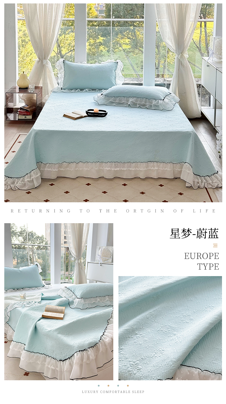 • 91家纺网 家纺一手货源 找家纺 金喜 2025新款韩版木棉纯色床盖双层蕾丝边夹棉床盖-星梦系列 星梦-蔚蓝