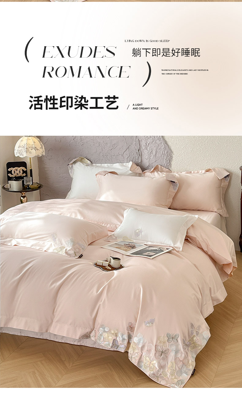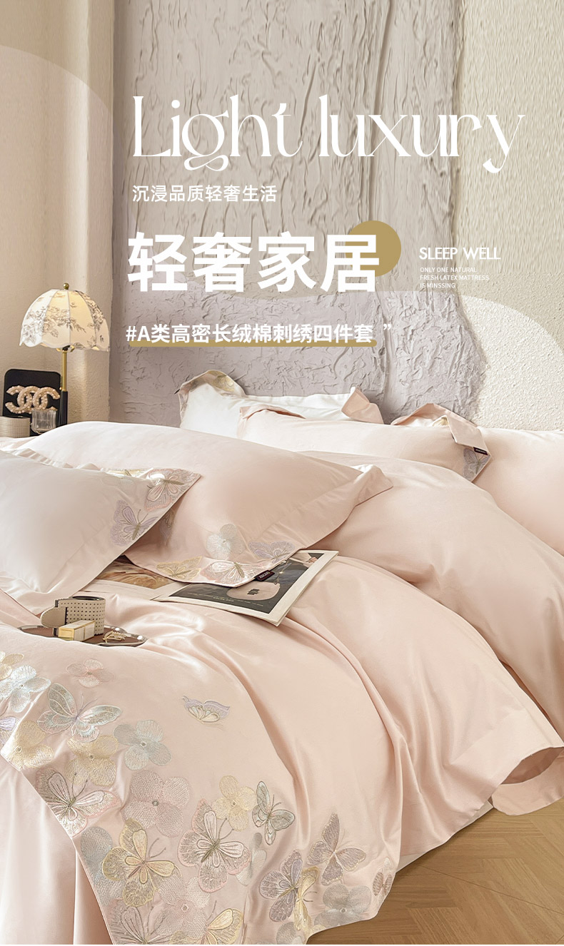 高端轻奢A类母婴级长绒棉全工艺刺绣四件套纯棉全棉高端春夏季爆款床上用品 茉婉-颜粉