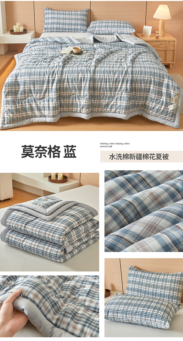 商品名称:易博家纺 2025新款格子纯色水洗棉无印风百分百新疆棉花夏被夏凉被被子被芯 莫奈格 蓝