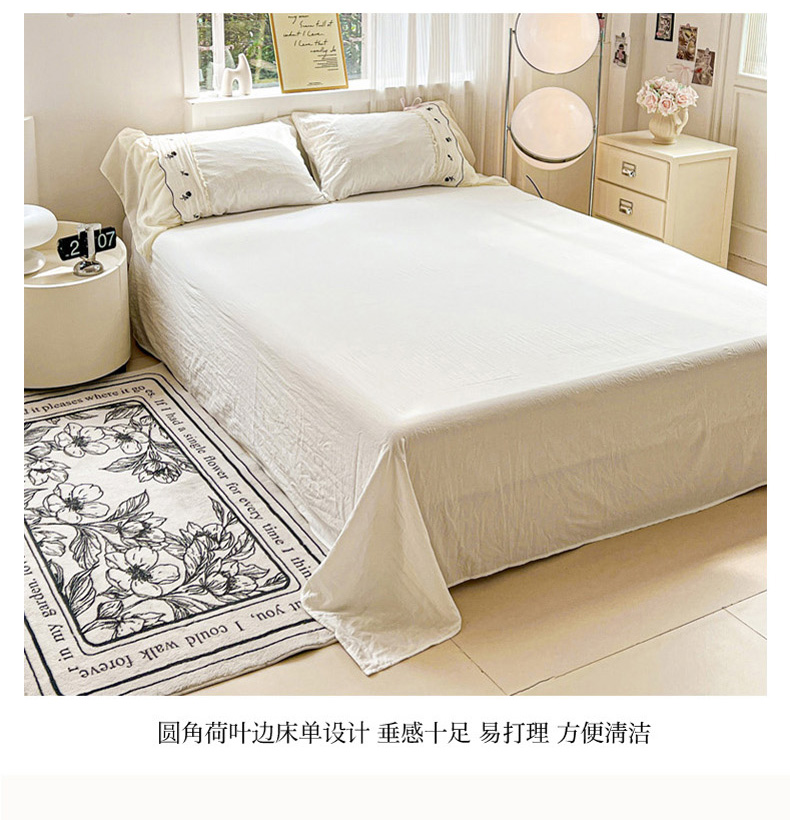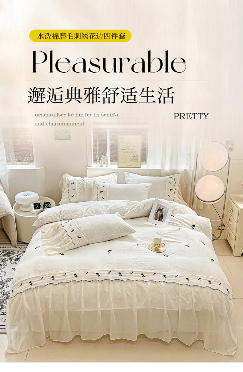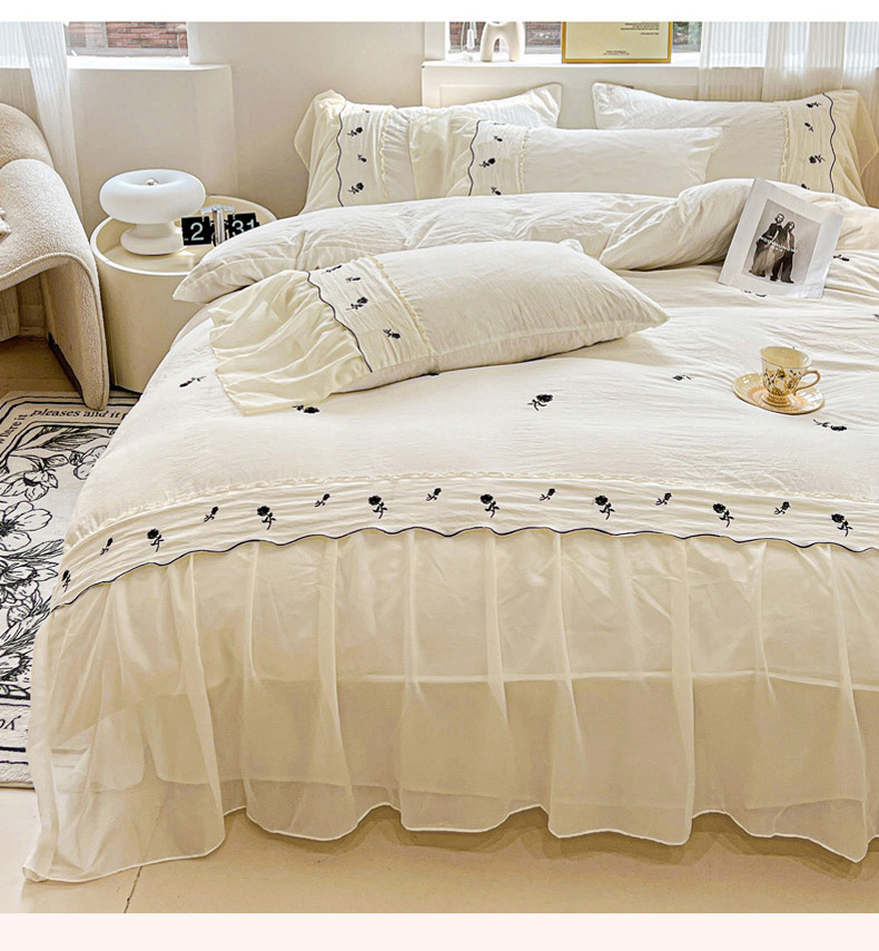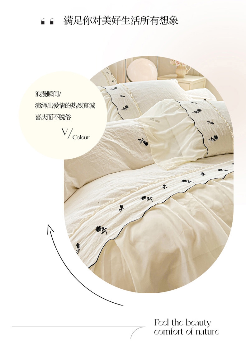 商品名称:梧桐家居 2025新款水洗棉磨毛刺绣玫瑰蕾丝雪纺花边工艺款四件套 玫瑰仙子-白黑