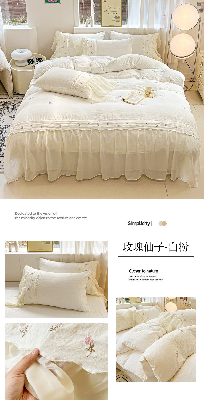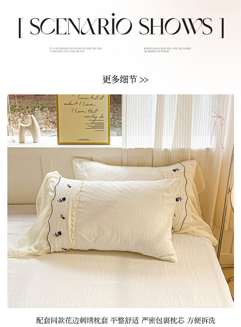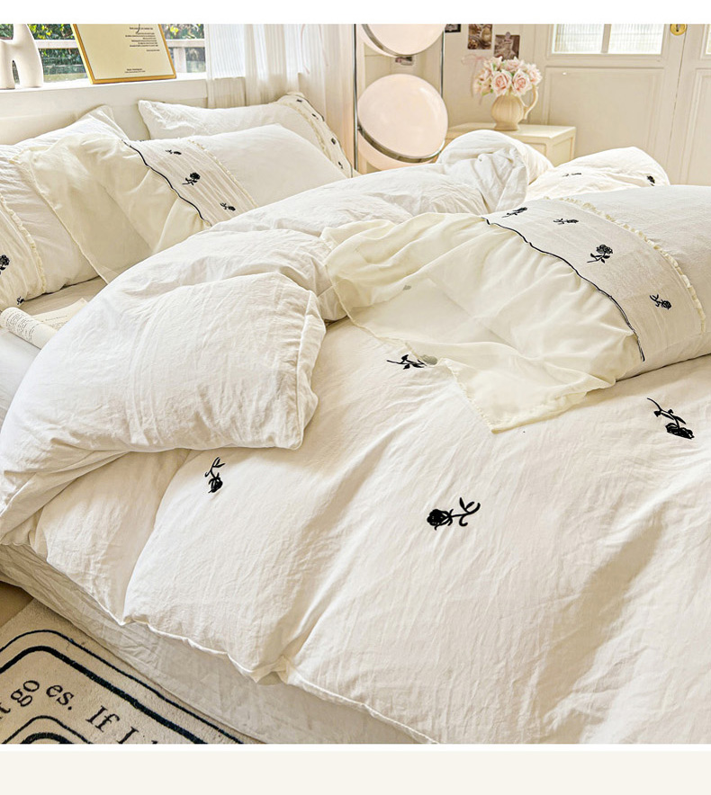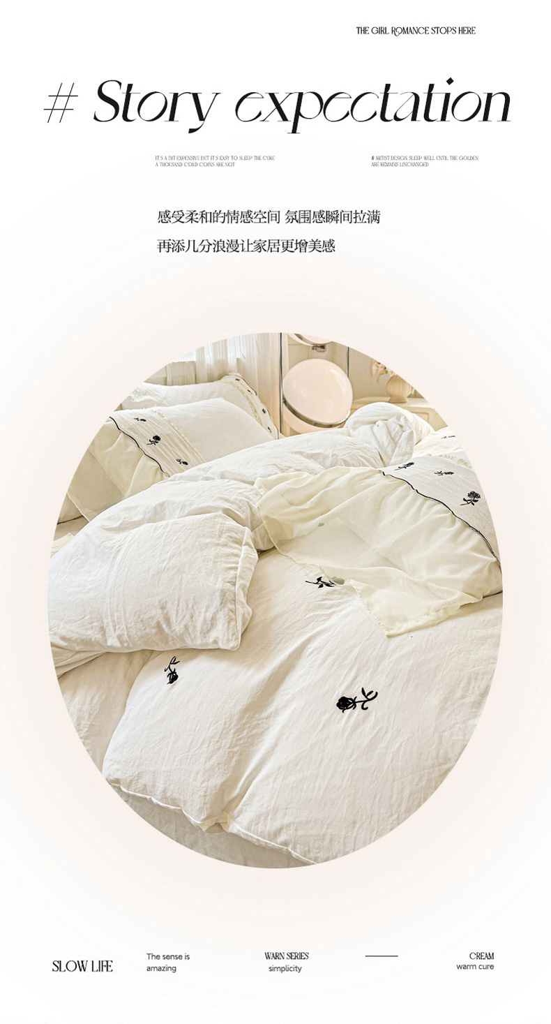 梧桐家居 2025新款水洗棉磨毛刺绣玫瑰蕾丝雪纺花边工艺款四件套 玫瑰仙子-白黑