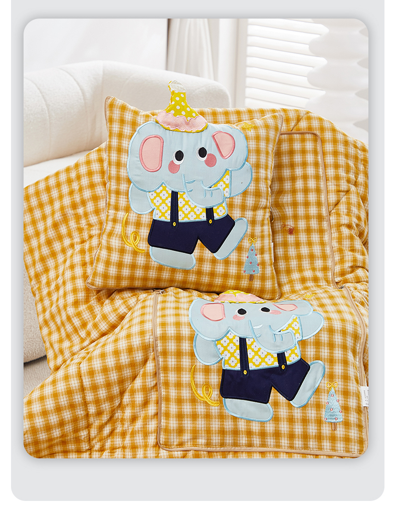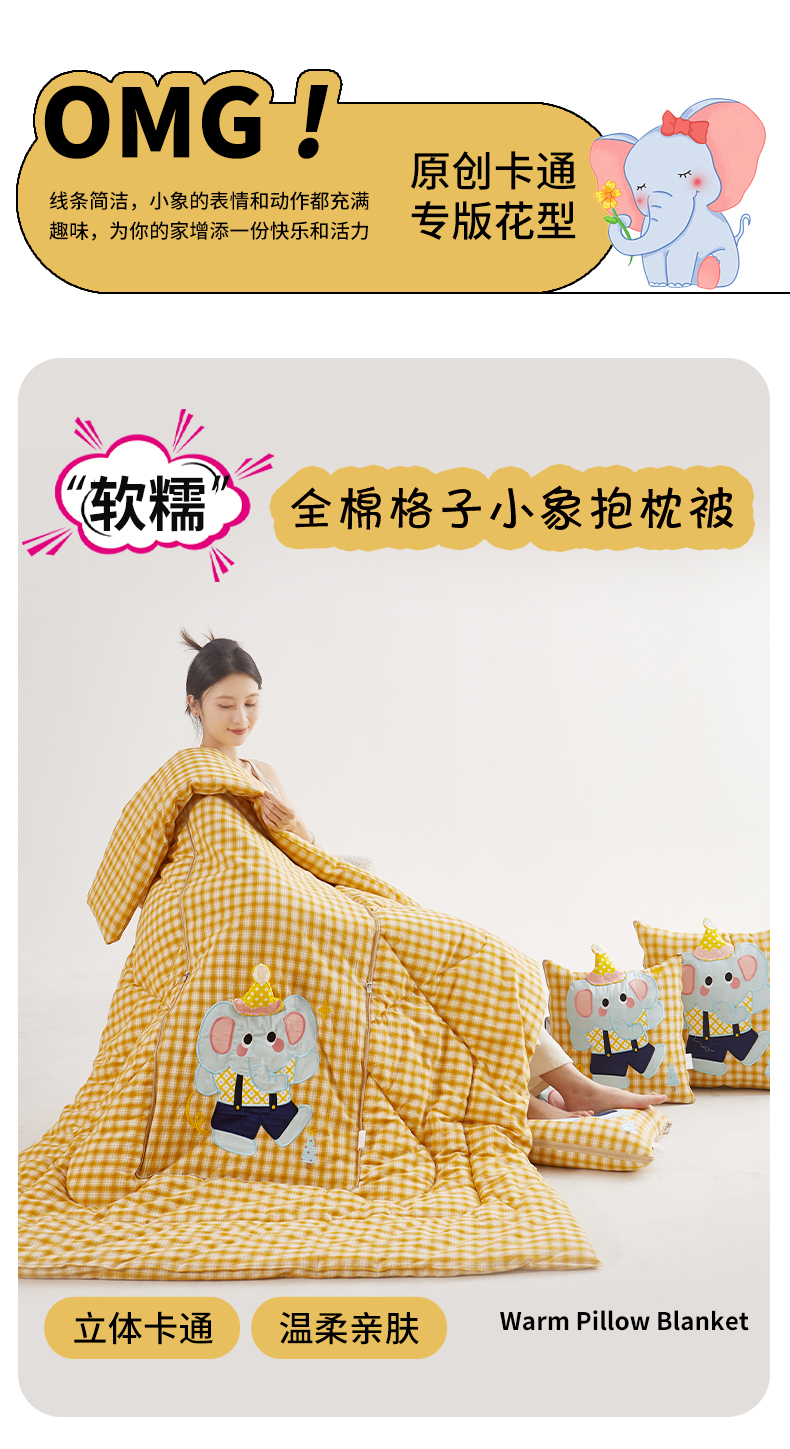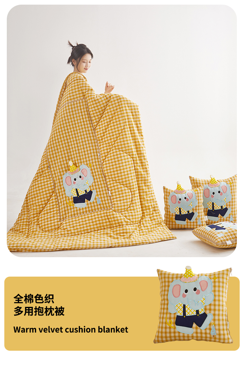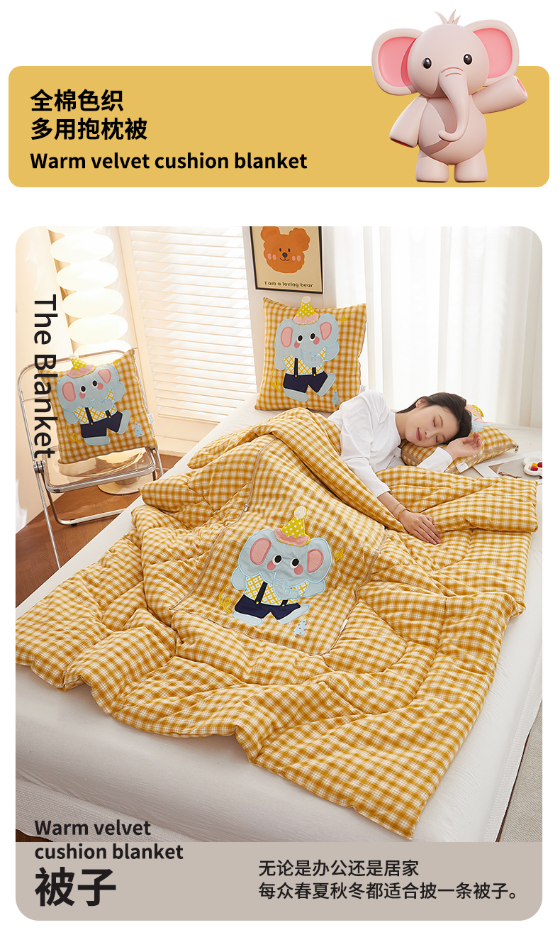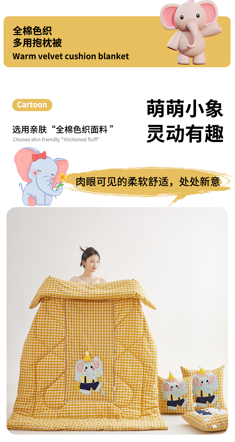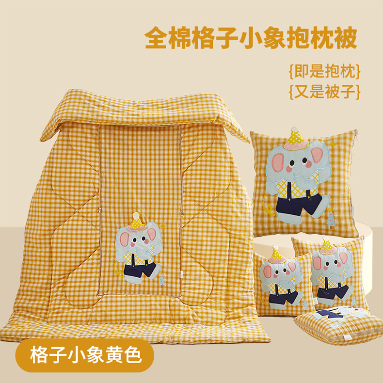商品名称:古本家居 2025新款四季款全棉格子小象抱枕被 格子小象黄色