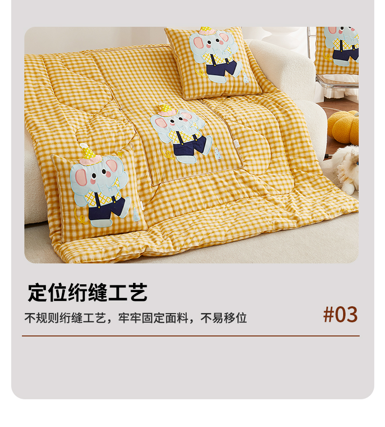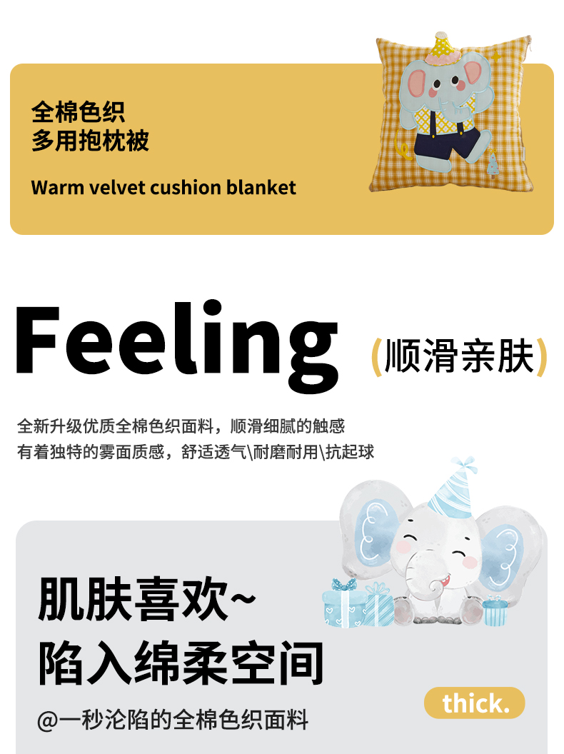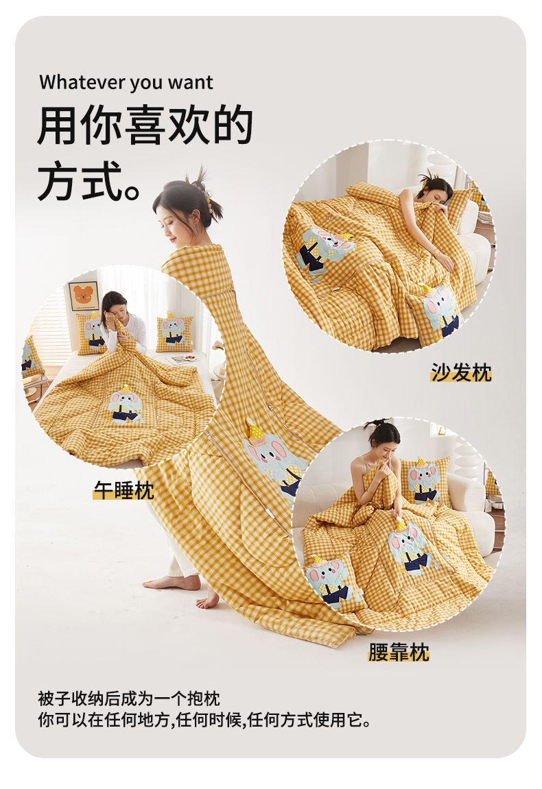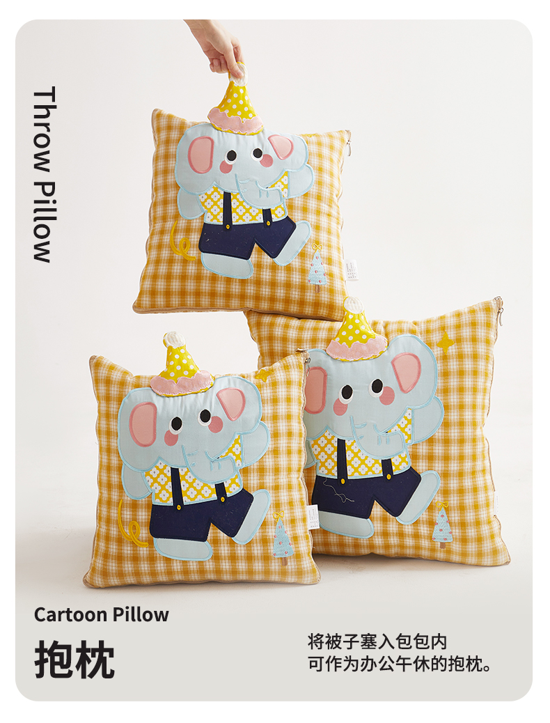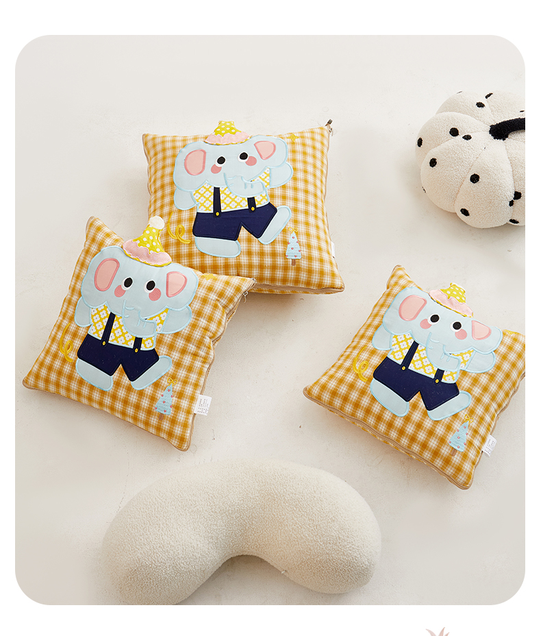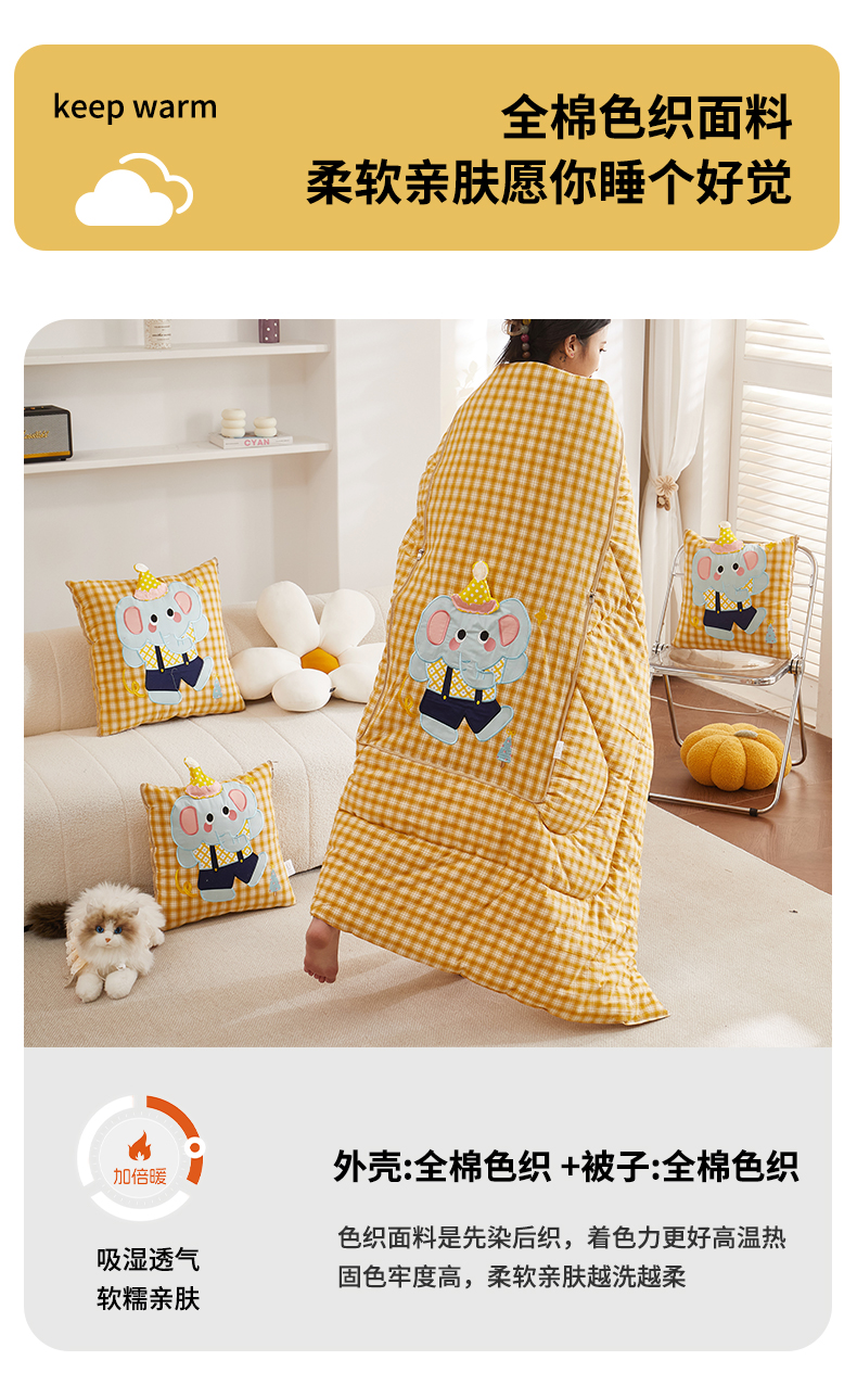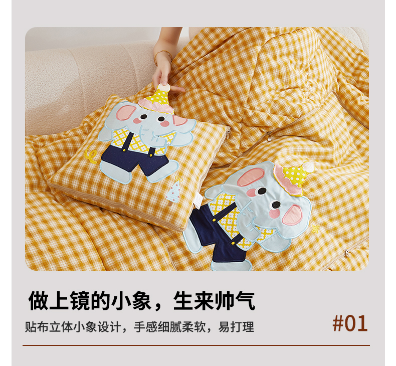 商品名称:古本家居 2025新款四季款全棉格子小象抱枕被 格子小象黄色
