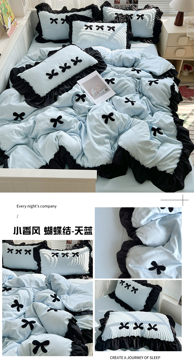 当前位置: 91家纺网 > 商品网购 > 床品套件 > 四件套 > 水洗棉四件套 > 艺玲家纺 2025新款赫本风系列法式花边水洗棉四件套 小香风 蝴蝶结-天蓝