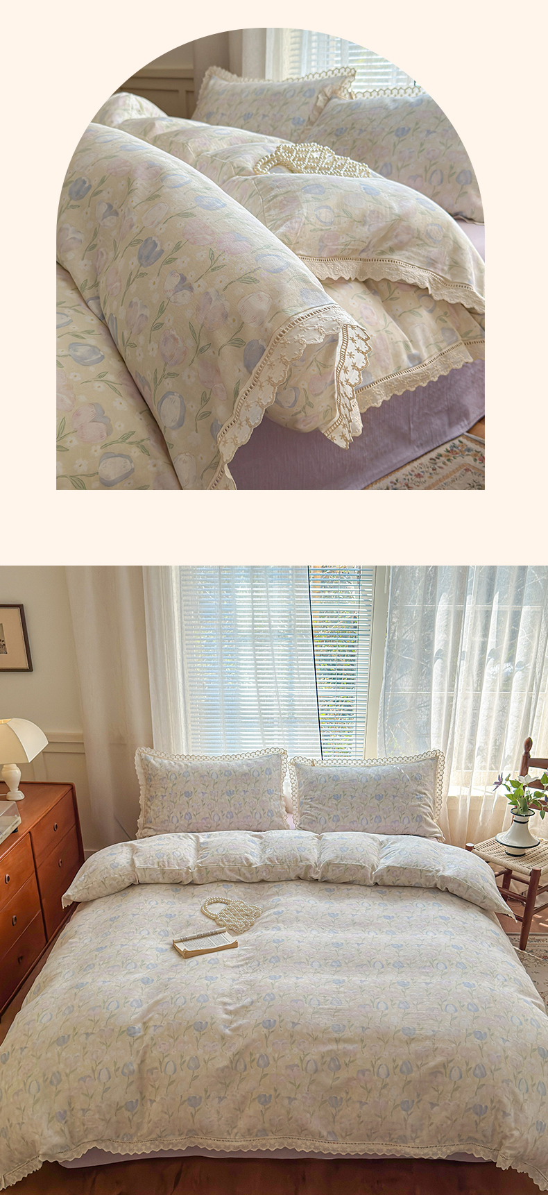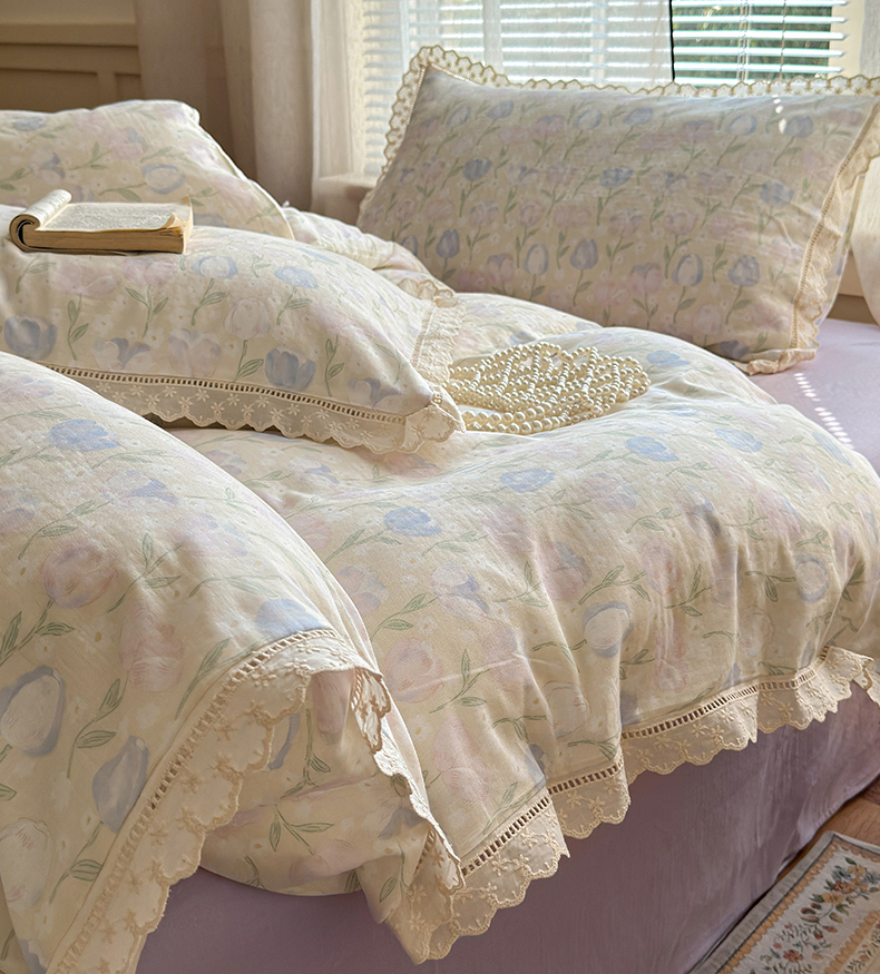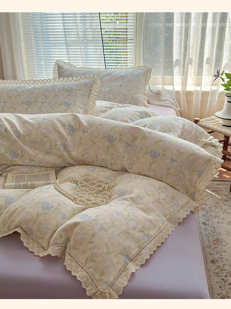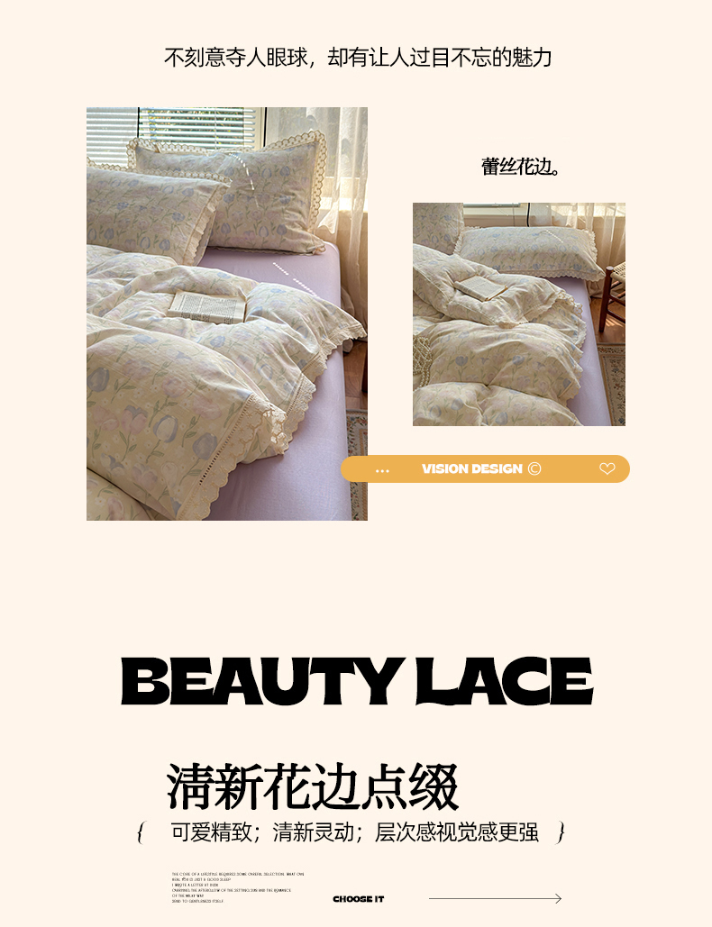 曼之夏 2025新款A类全棉双层纱花边四件套 郁金香